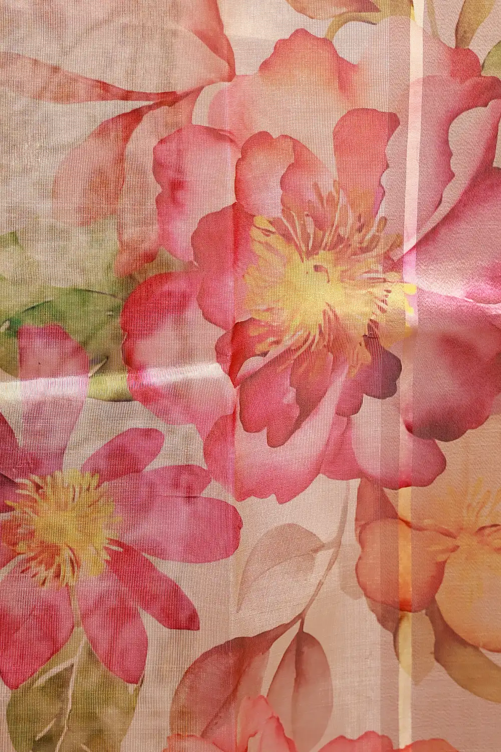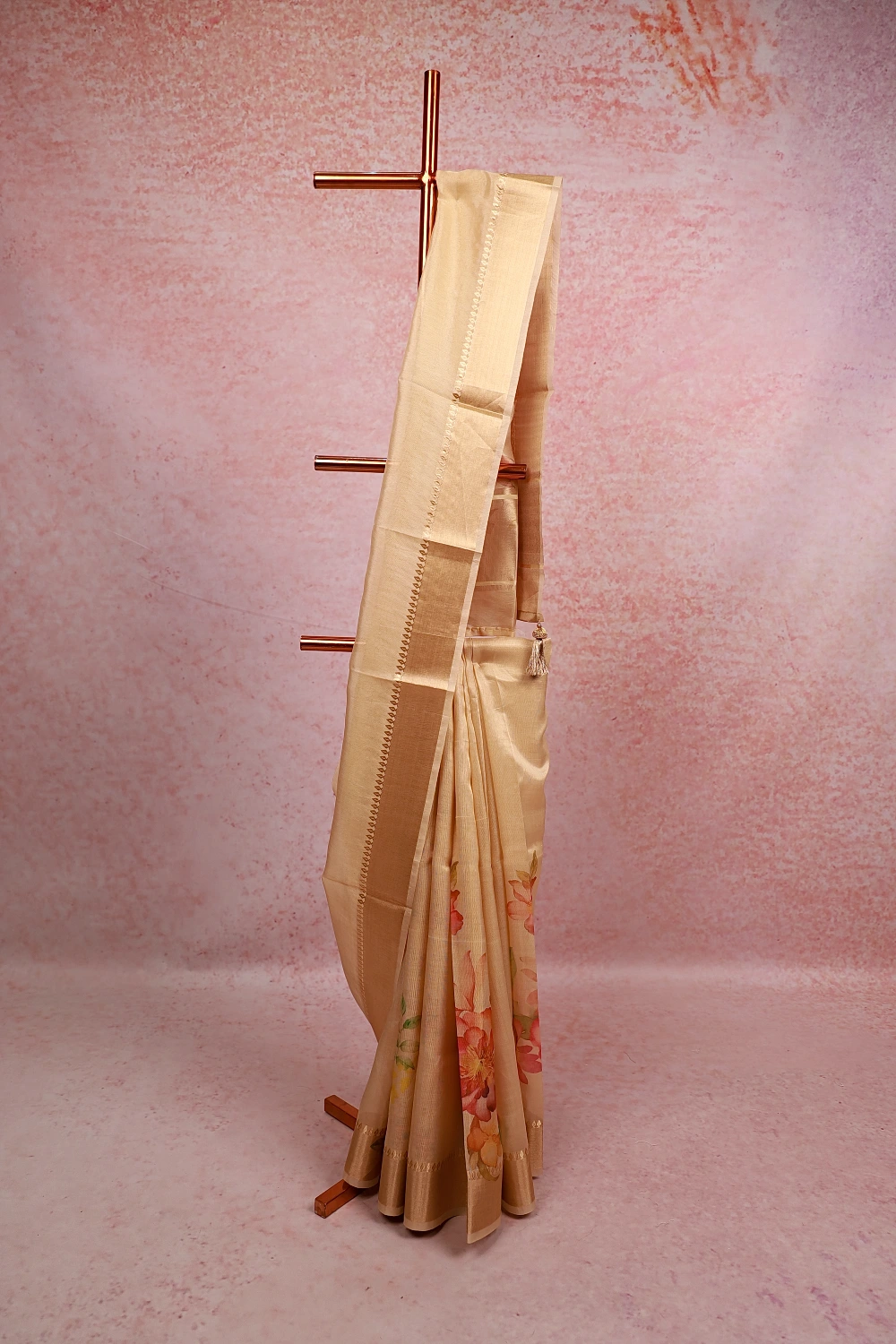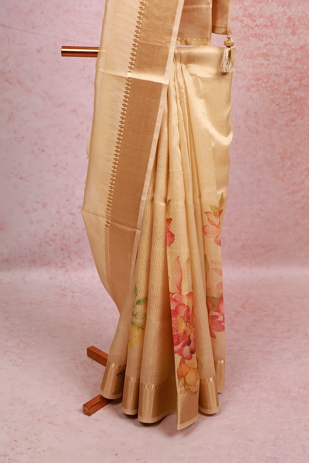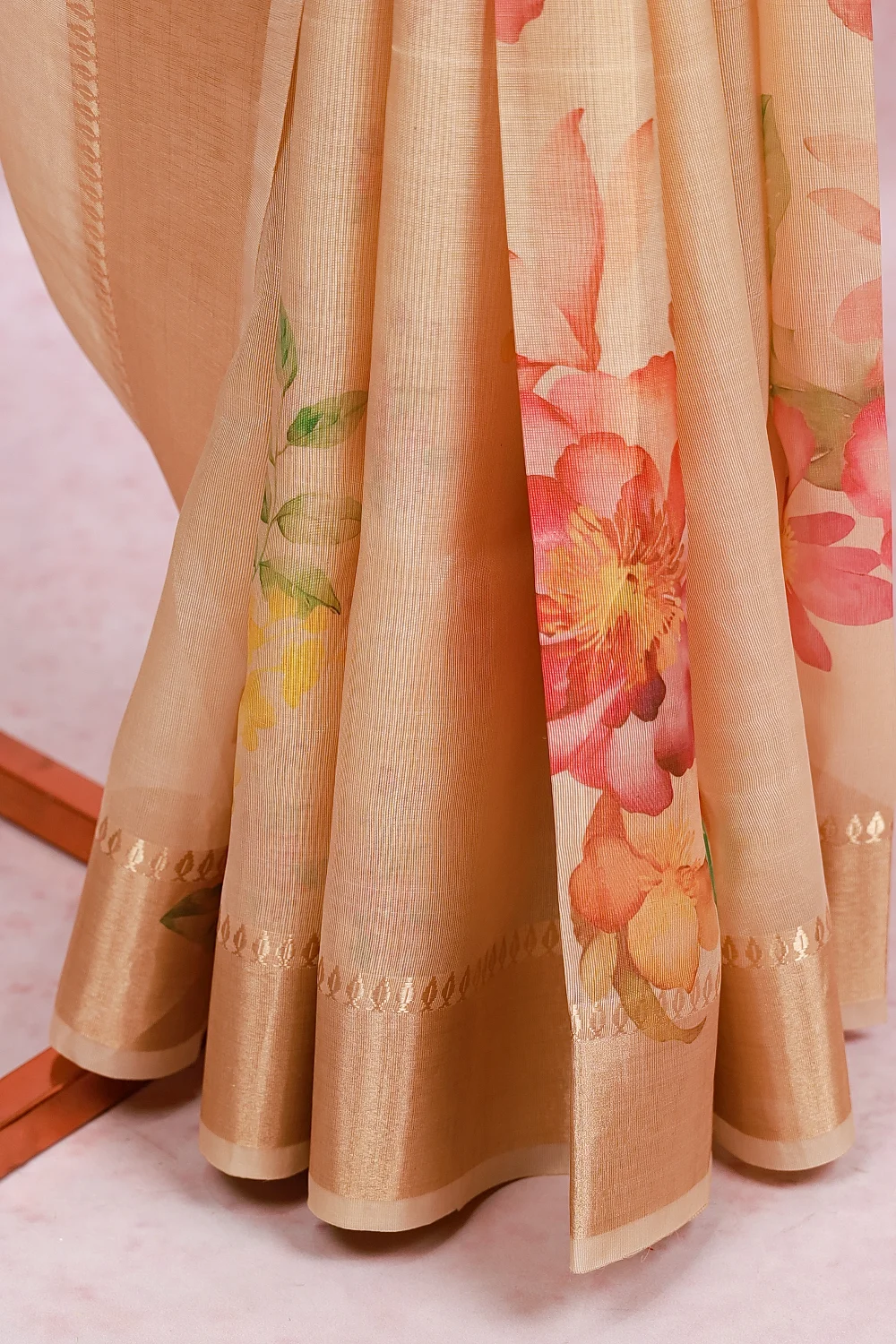 Gold Tissue Kerala Floral Design Saree with Zari Border. Includes Unstitched Blouse