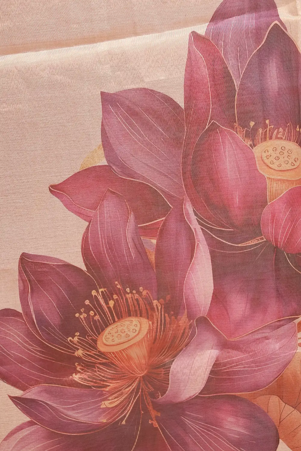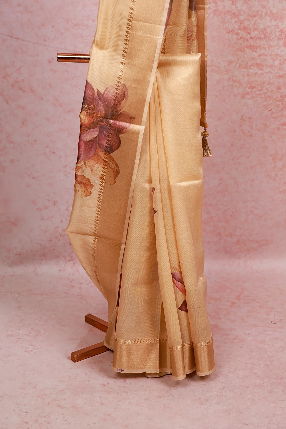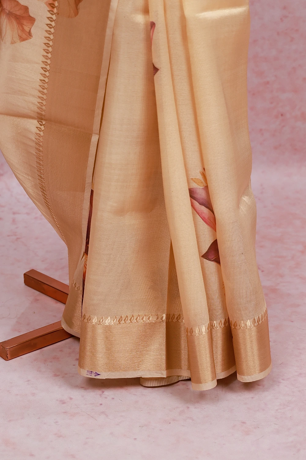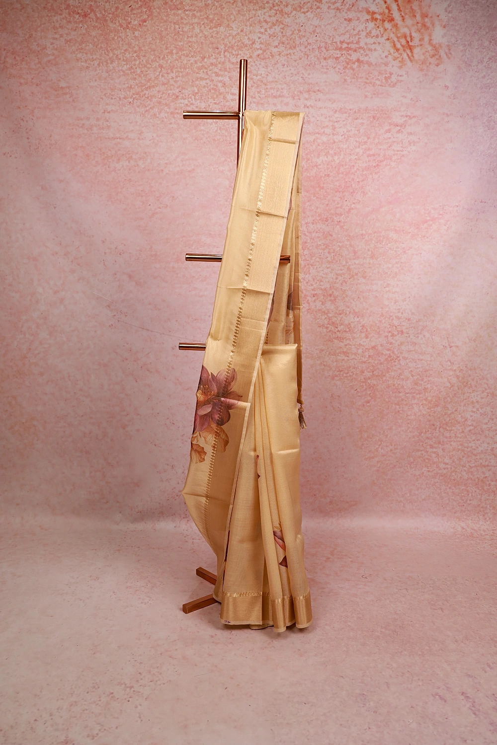 Gold Tissue Kerala Floral Design Saree with Zari Border. Includes Unstitched Blouse