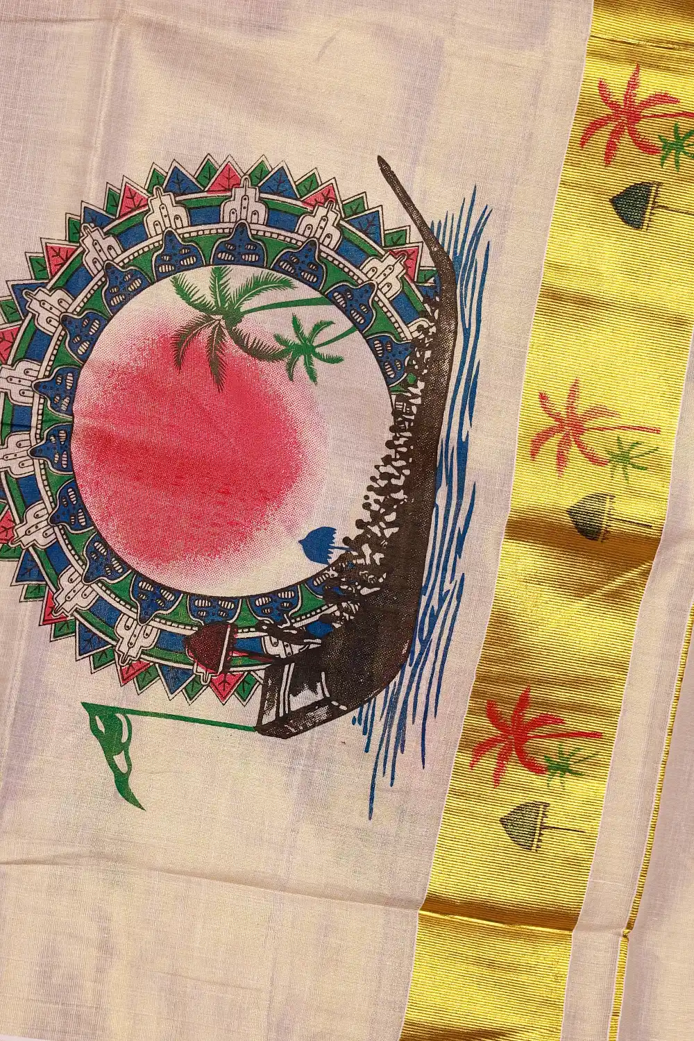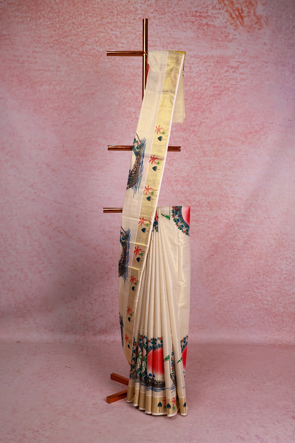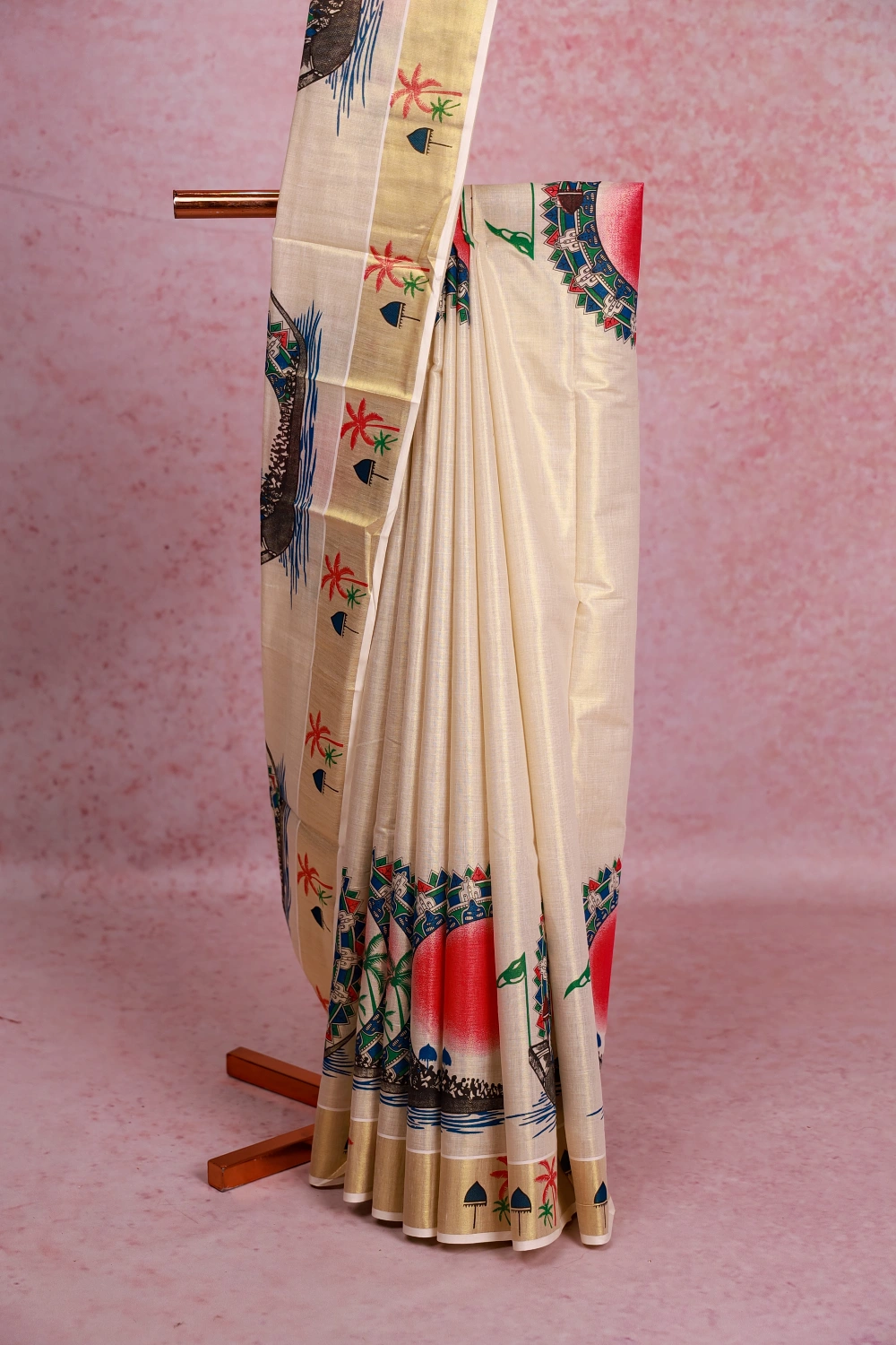 Golden Cream Tissue Kerala Printed Saree With Zari Border. Includes Un Stitched Blouse
