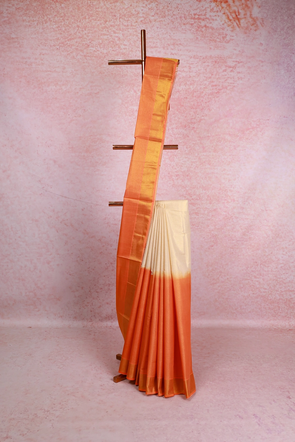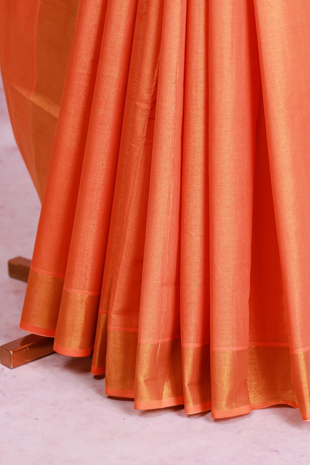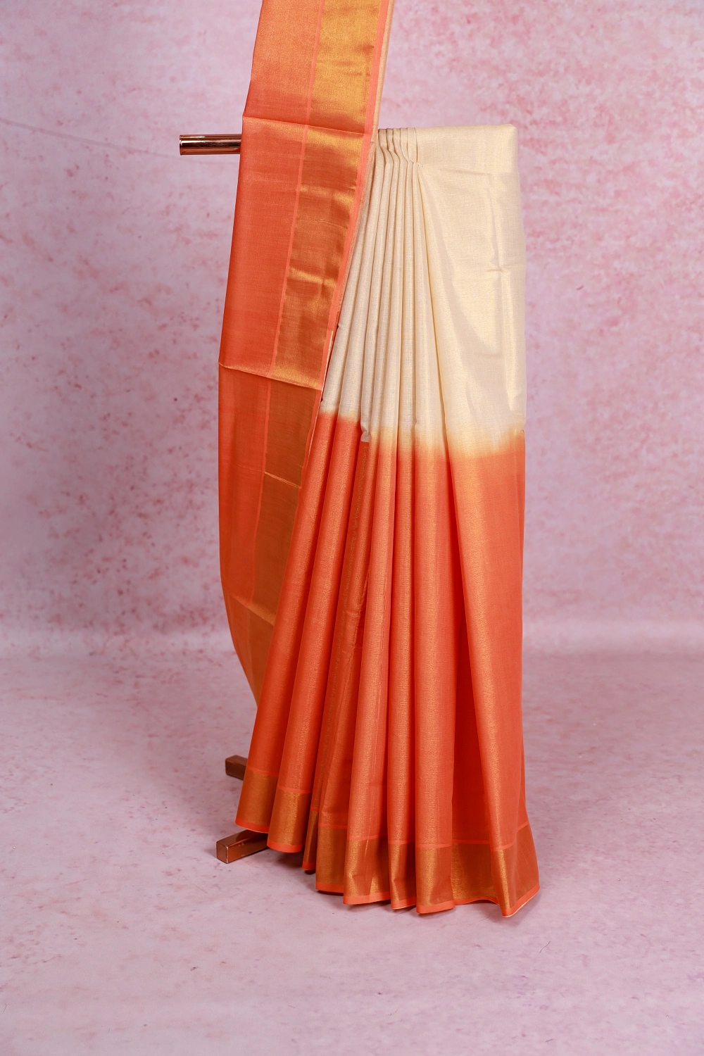 Golden Orange Tissue Kerala Half And Half Saree With Zari Border. Includes Un Stitched Blouse