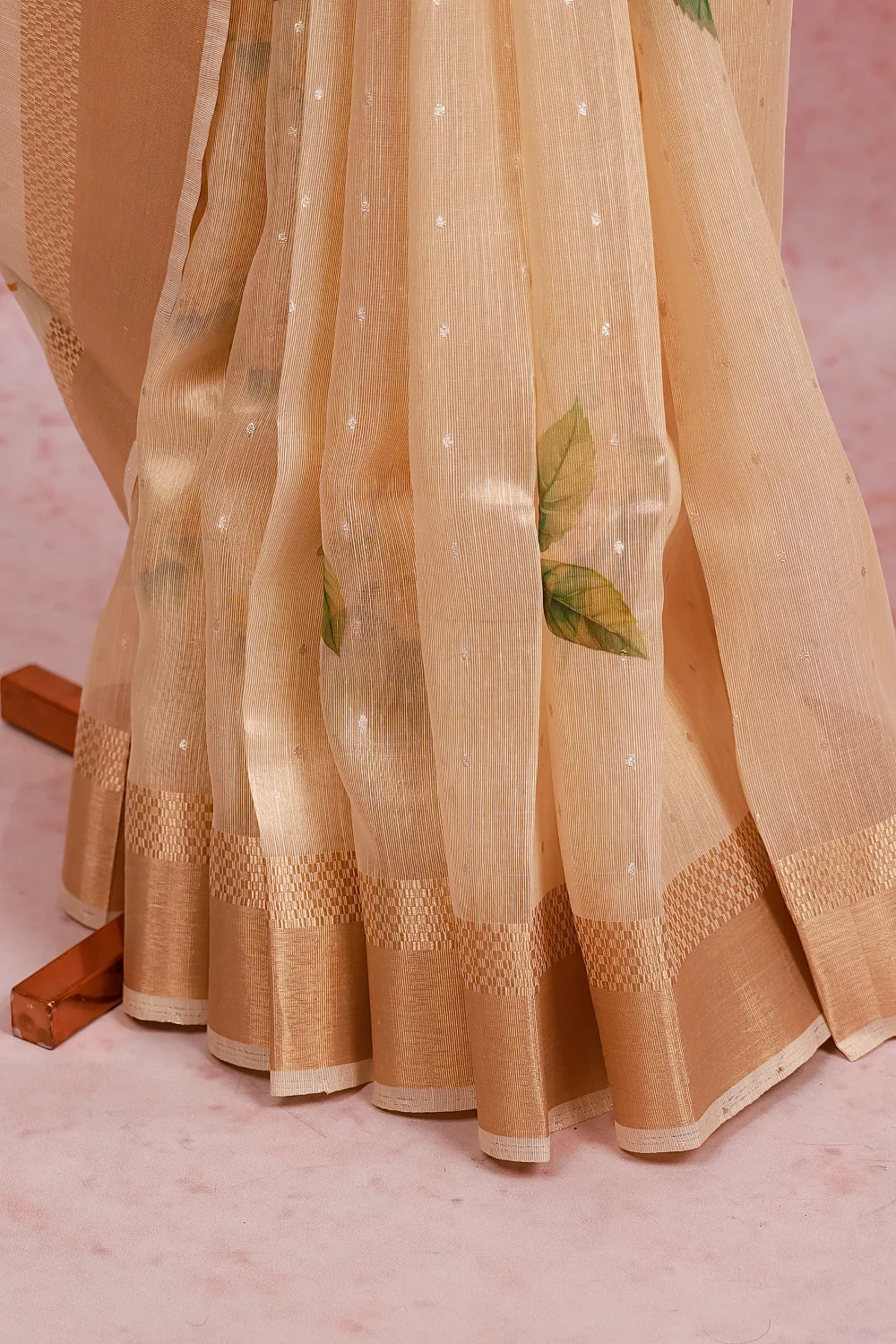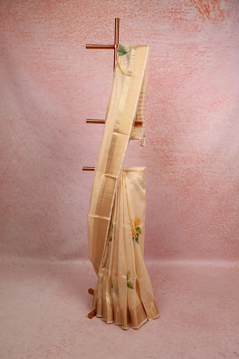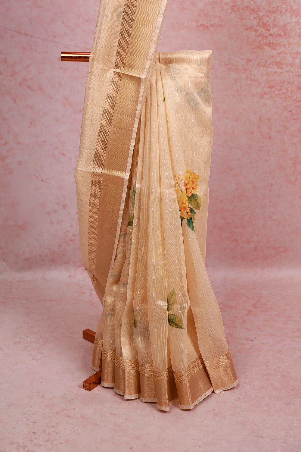 Gold Tissue Kerala Floral Print Saree with Zari Border. Includes Unstitched Blouse