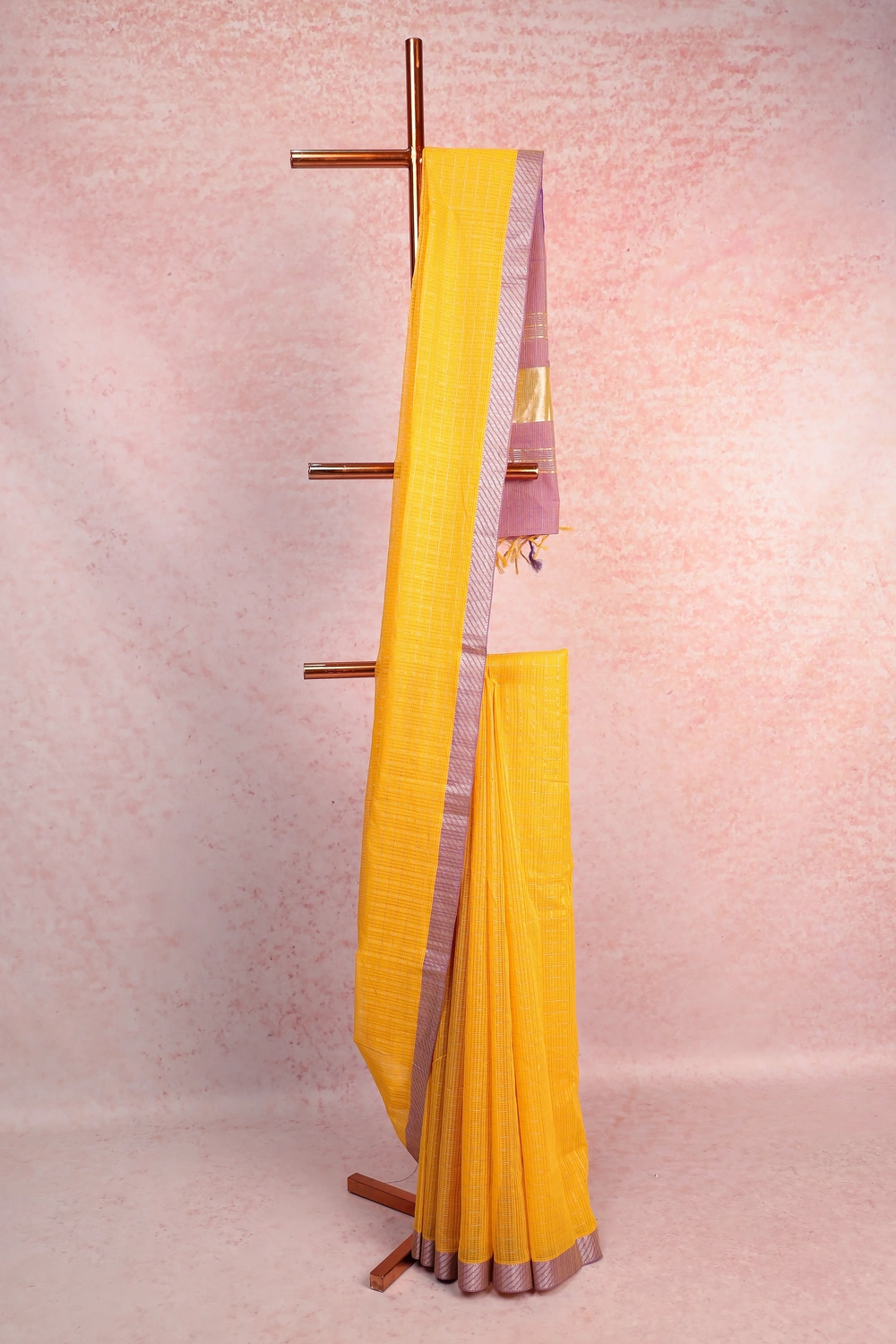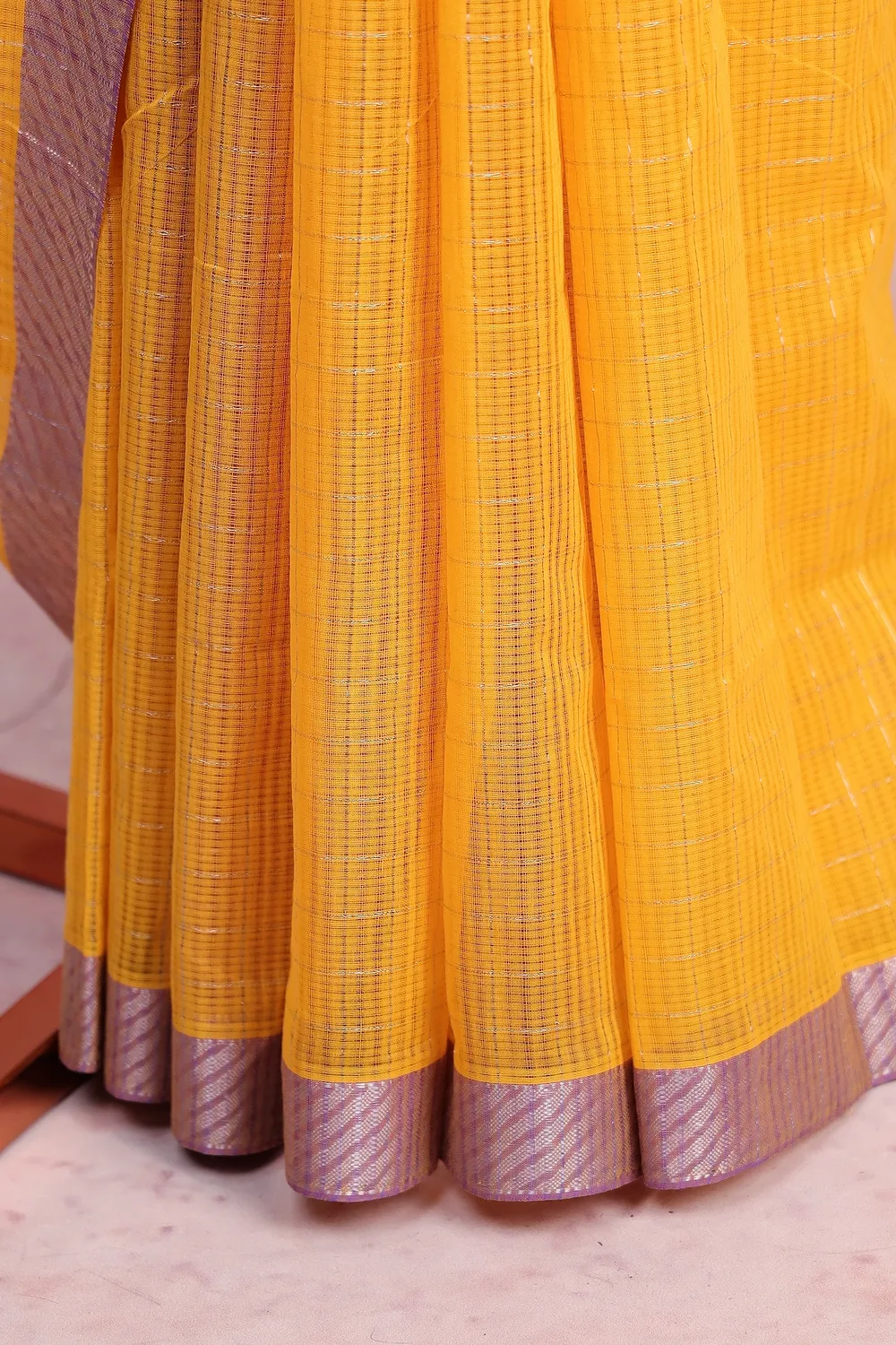 Golden Yellow Manglarian Cotton Check Saree with Designer Border. Includes Un stitched Blouse