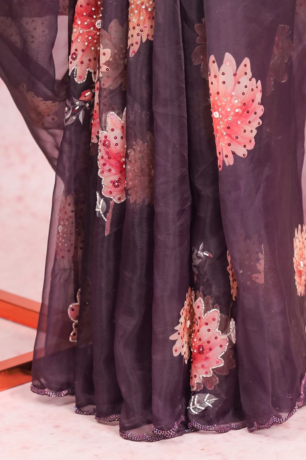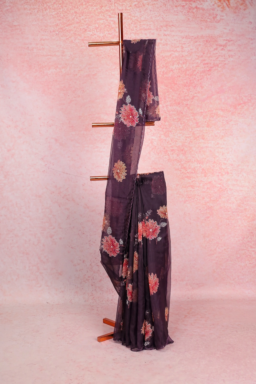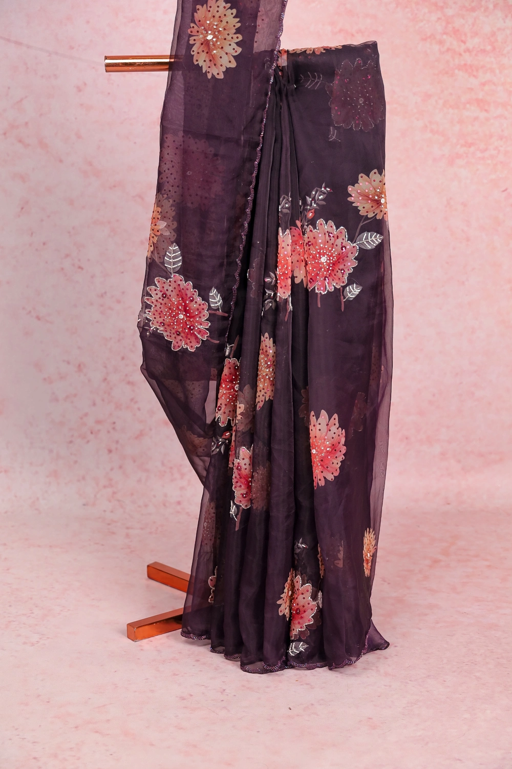 Grape Purple Glass Organza Printed Saree with Scalp Border. Includes Unstitched Blouse