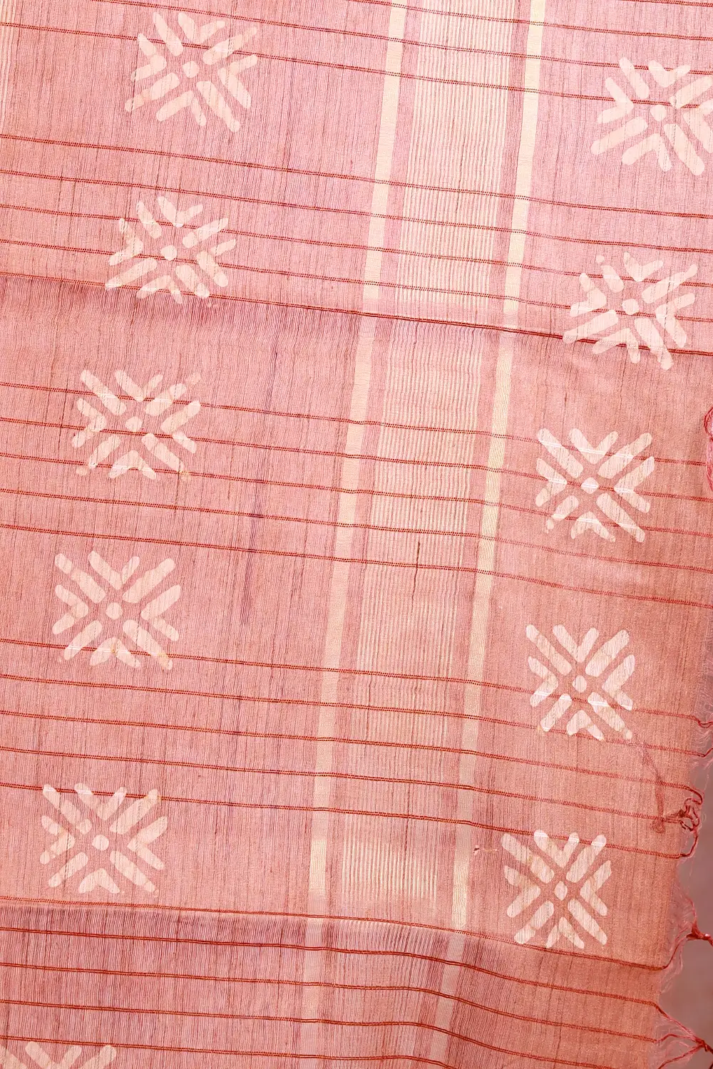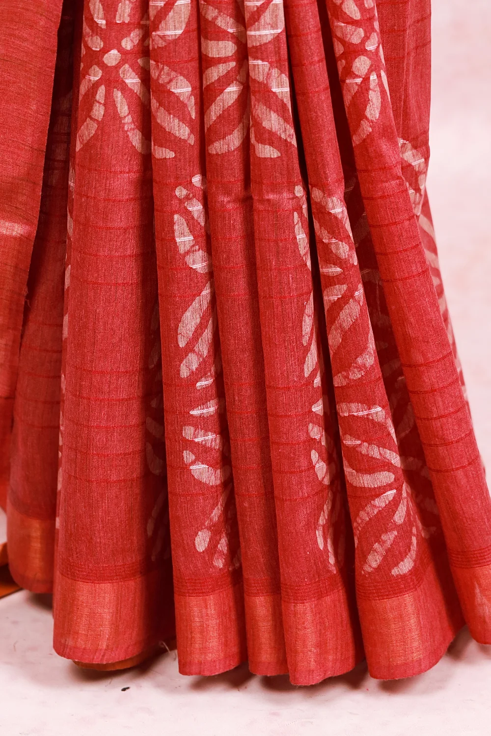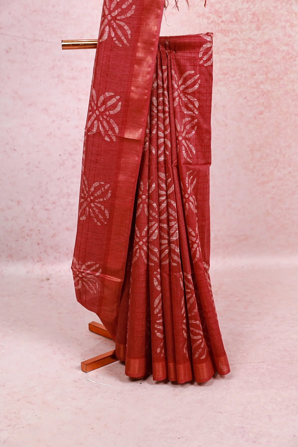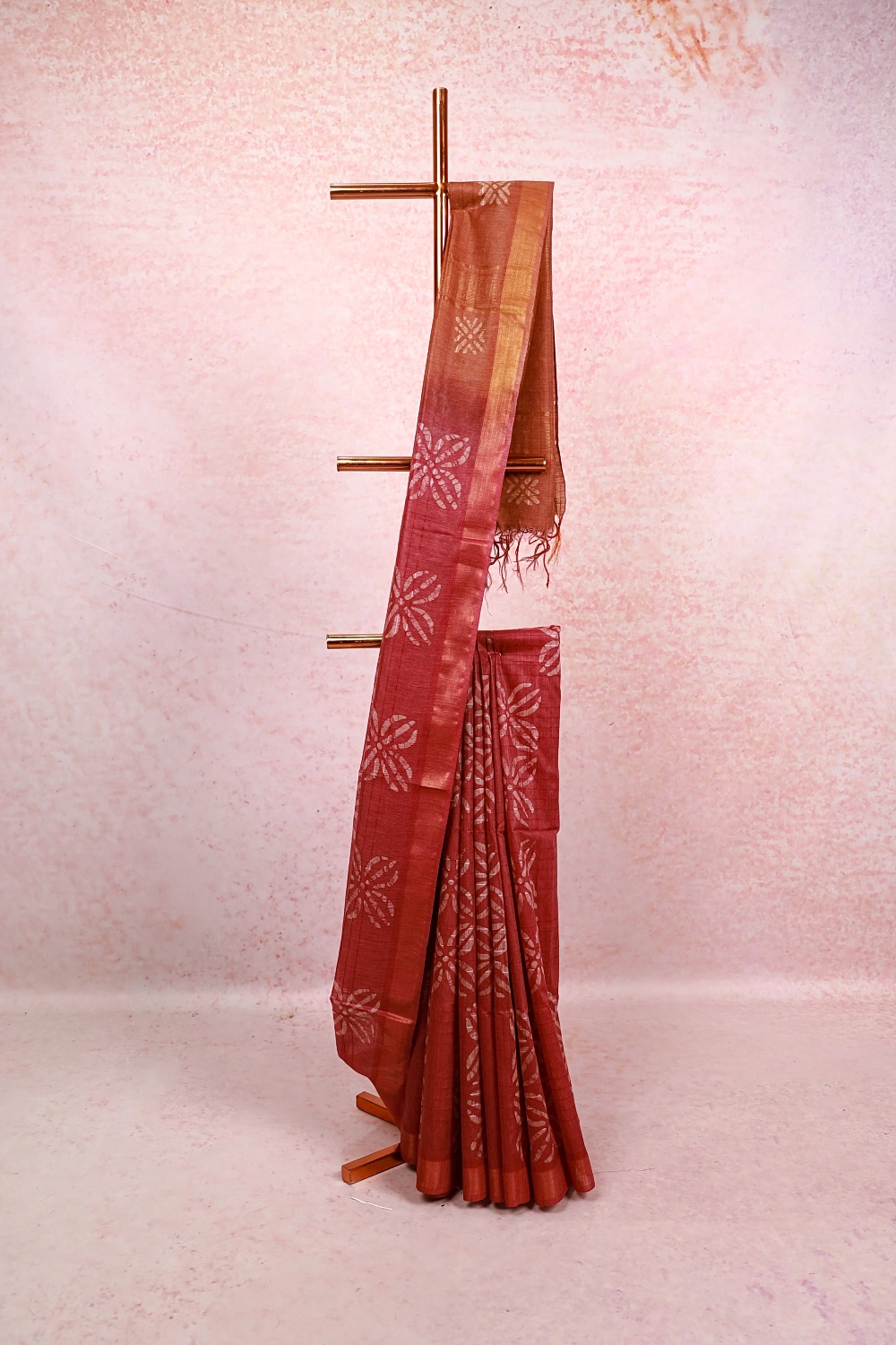 Grape Semi Tussar Bathik Printed Saree With Zari Border. Includes Unstitched Blouse