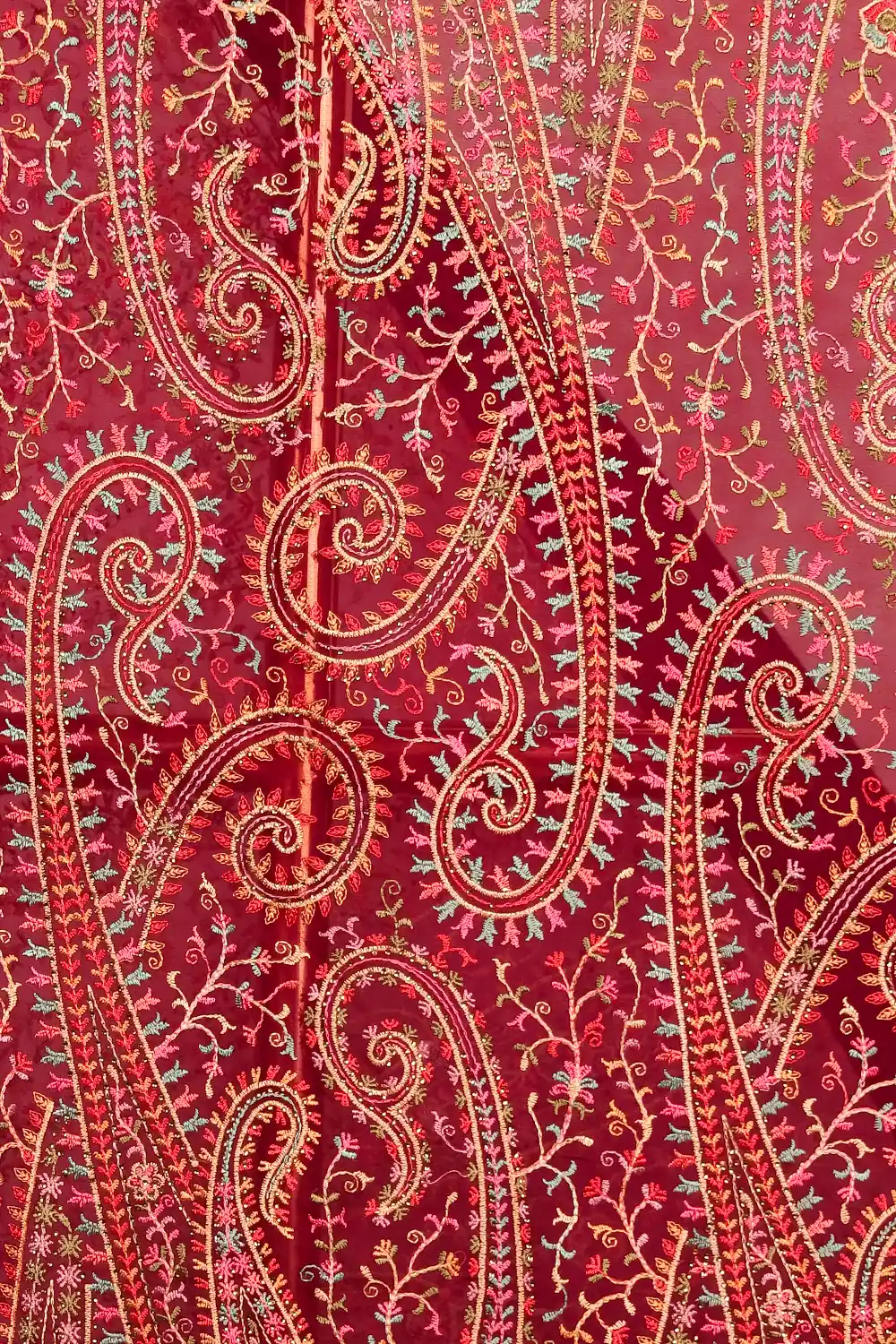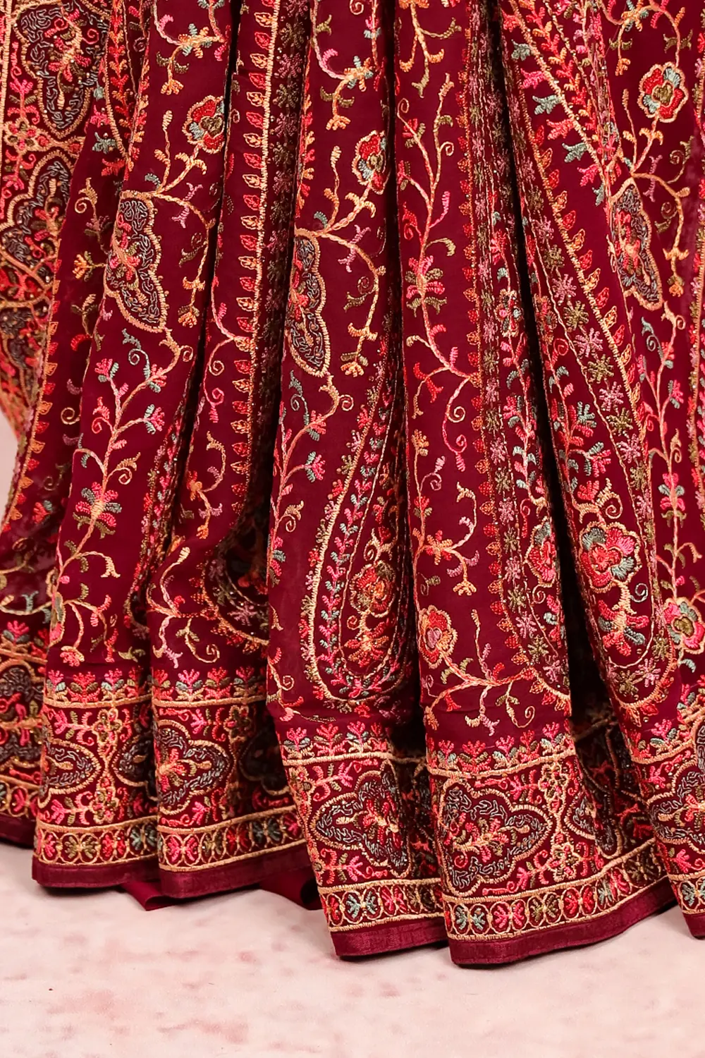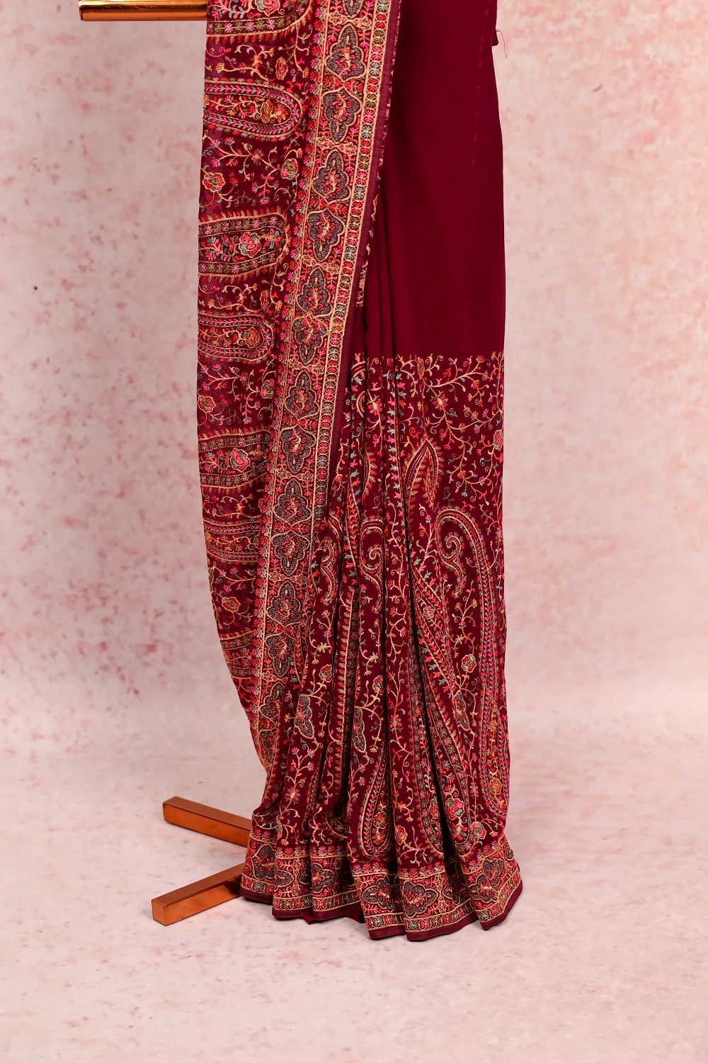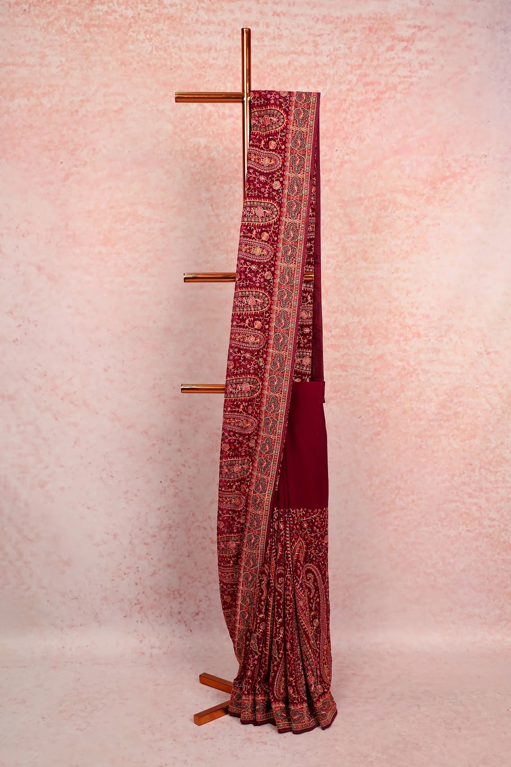 Grape Wine Georgette Chickenkari Saree with Designer Border. Includes Unstitched Blouse
