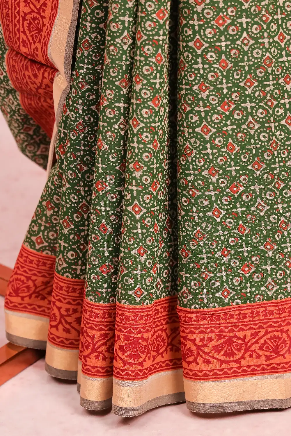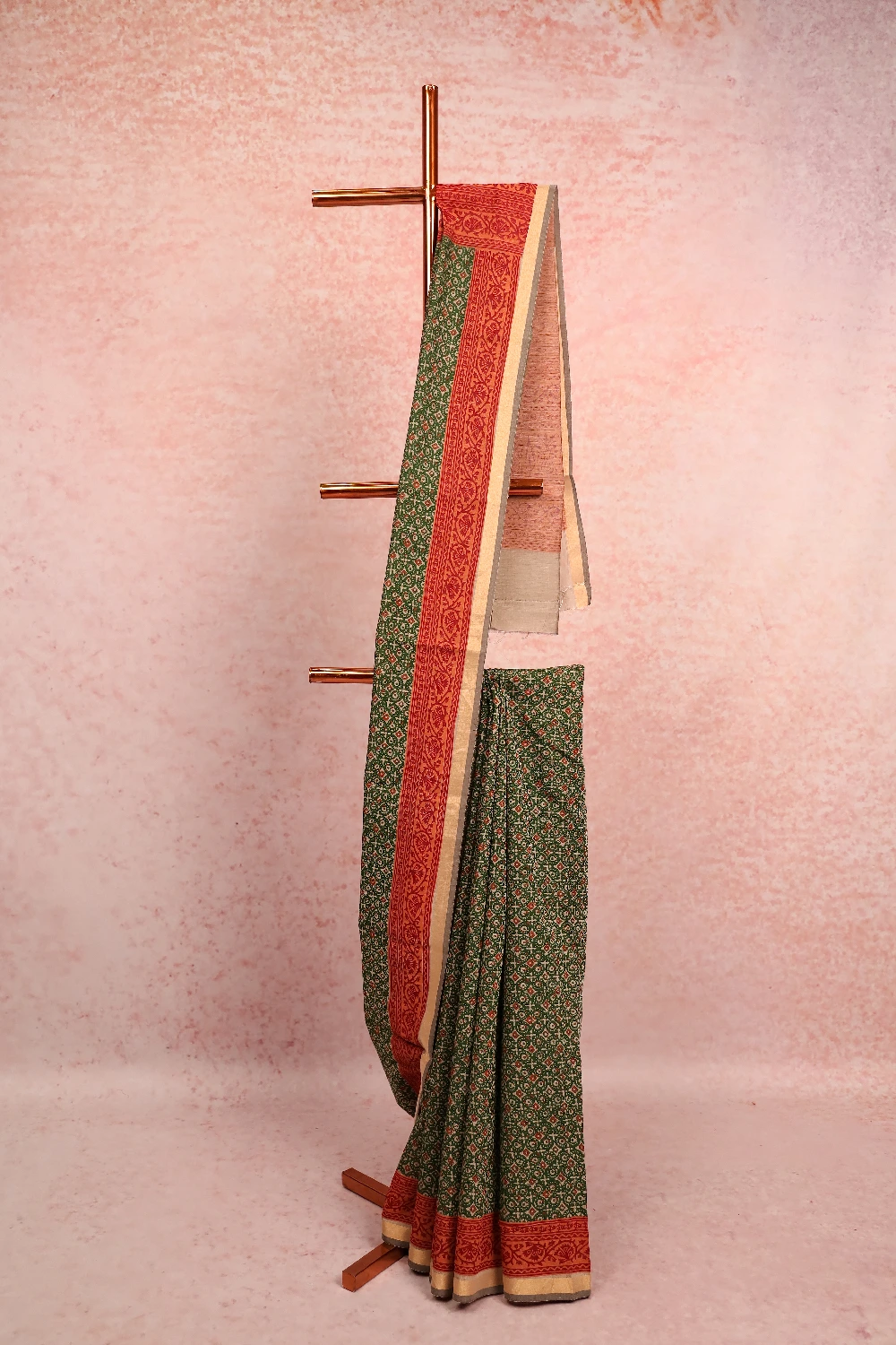 Green Chanderi Cotton Printed Saree with Printed Border. Includes Un stitched Blouse