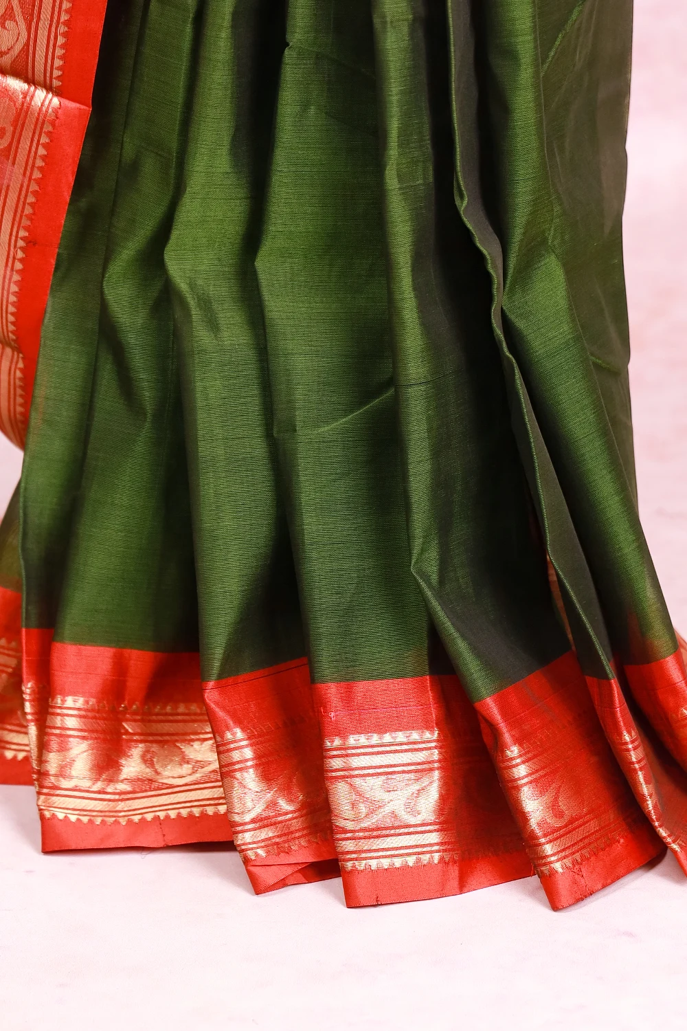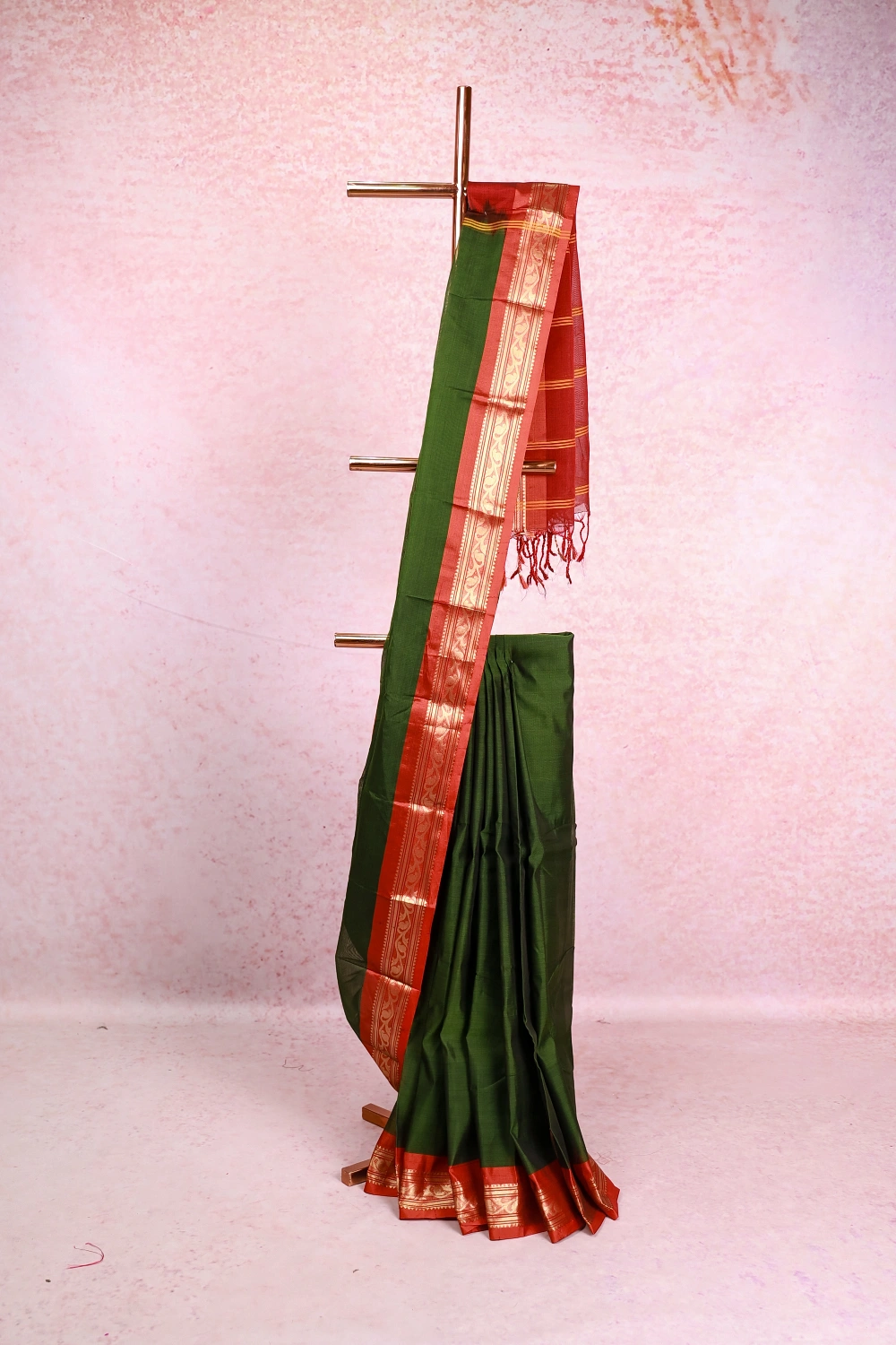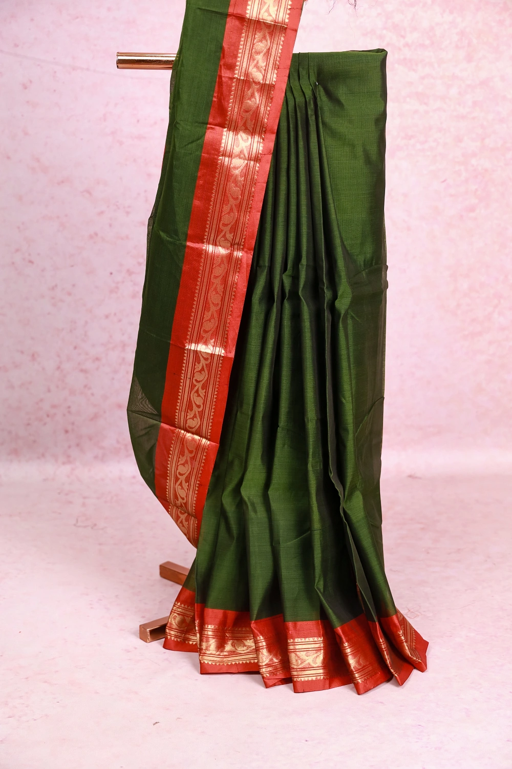 Green Chettinadu Cotton Plain Body Saree With Designer Border. Includes Un Stitched Blouse