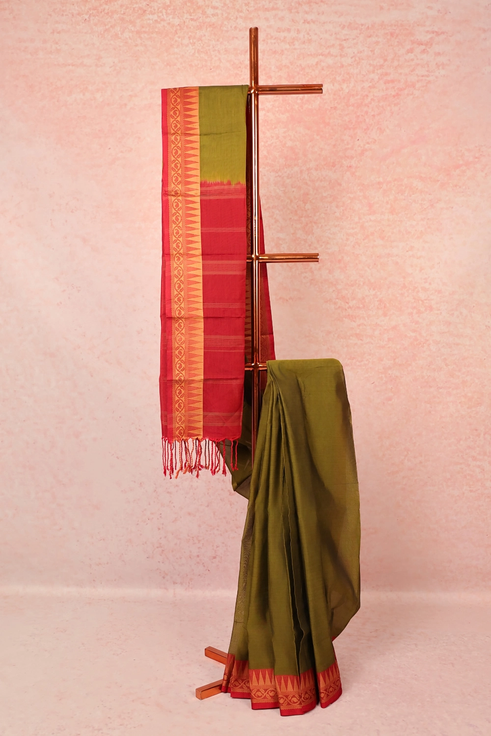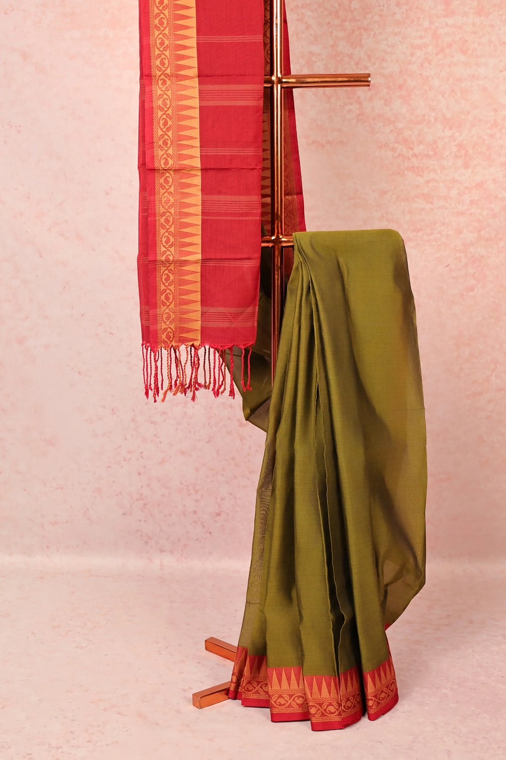 Green Cotton Plain Body Saree with Temple border. Includes Unstitched Blouse