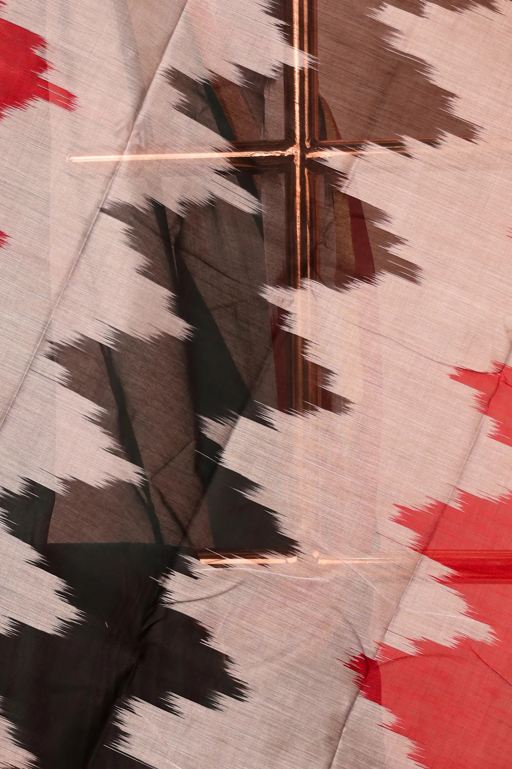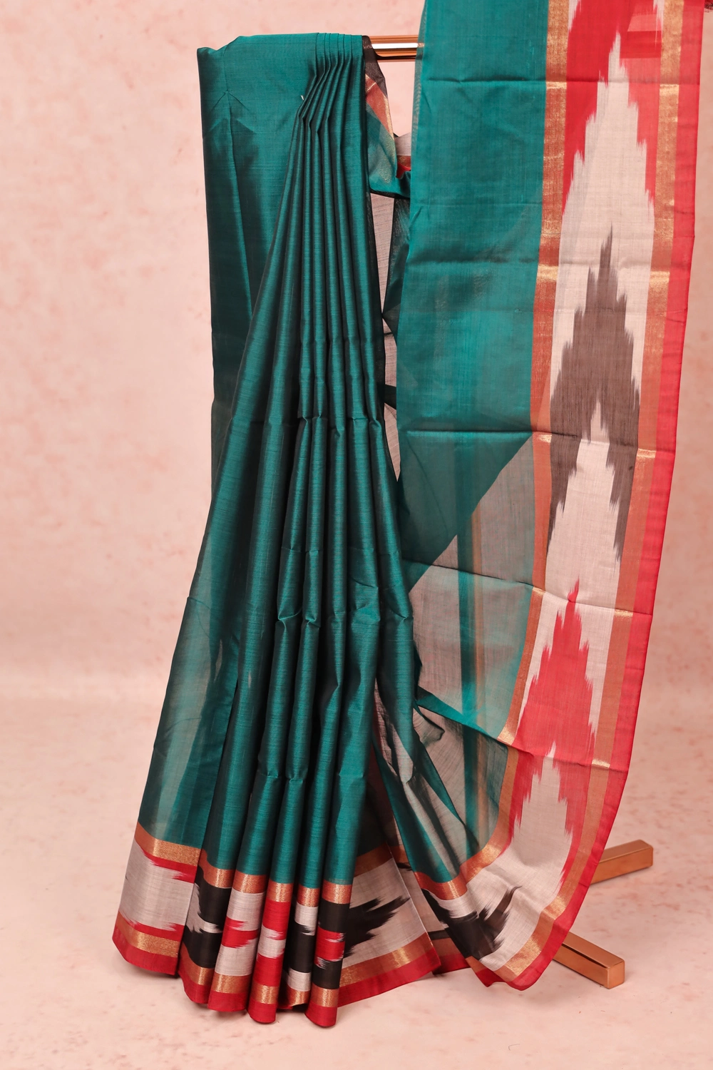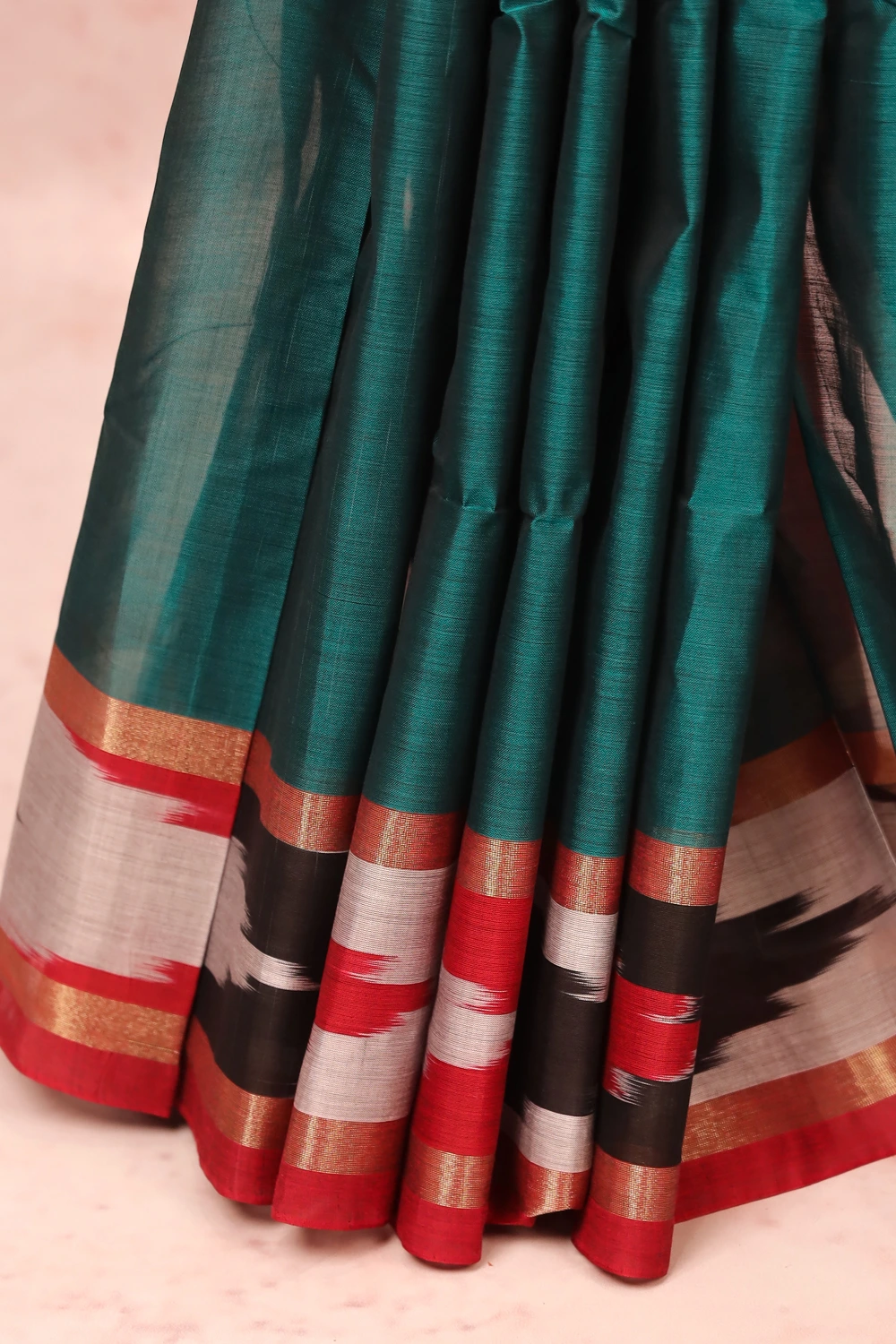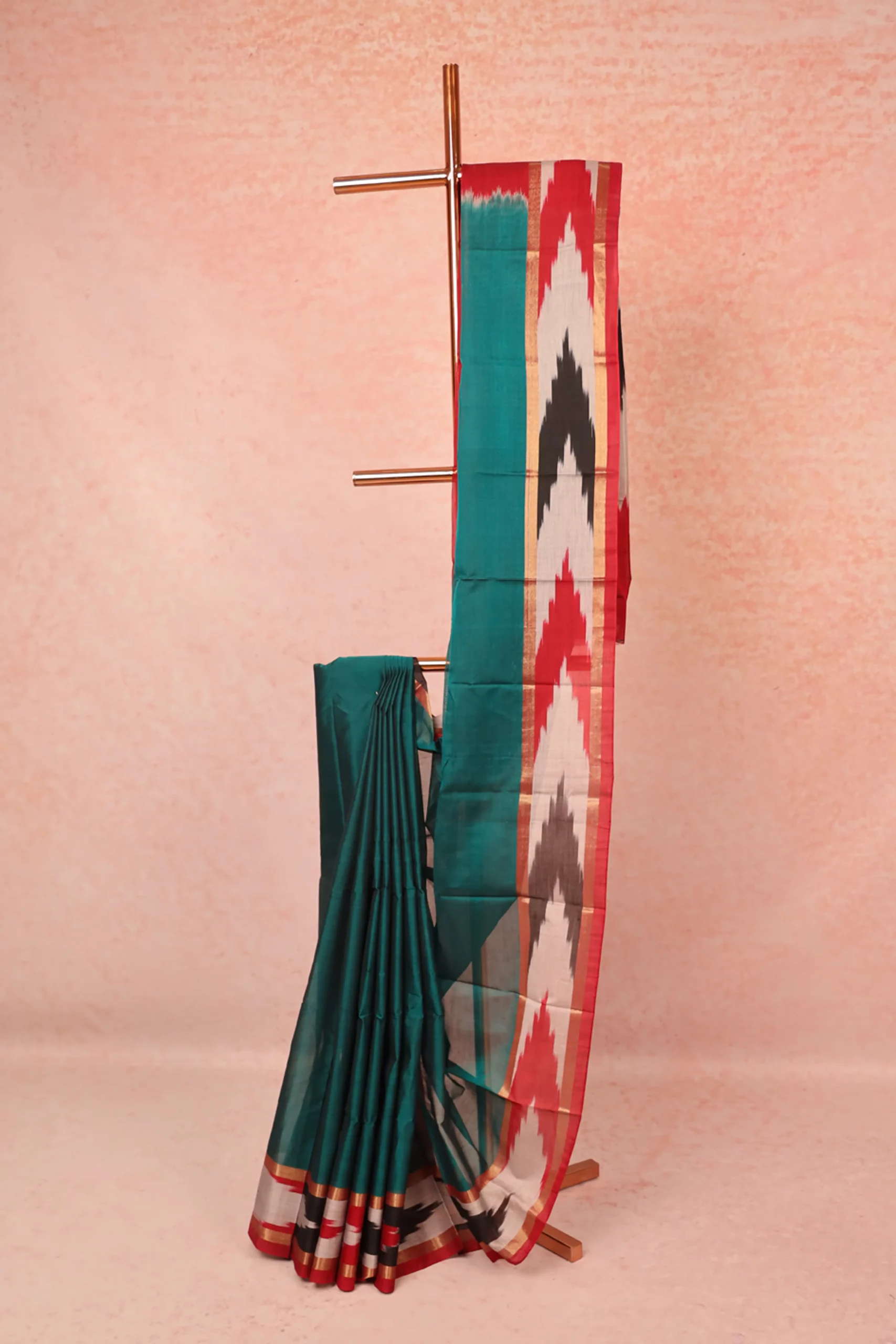 Green Cotton Plain Body Saree with Pochampally border. Includes Unstitched Blouse
