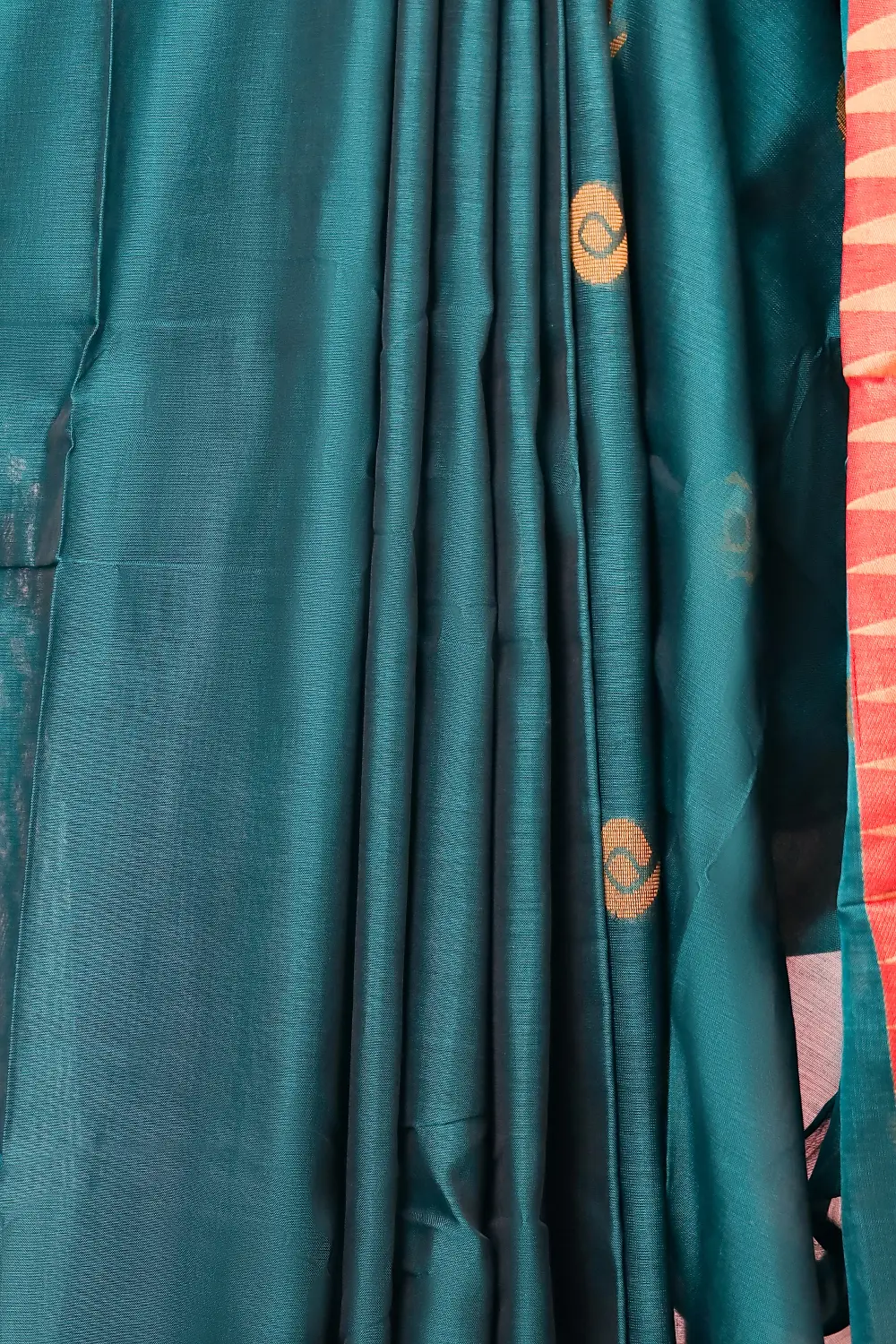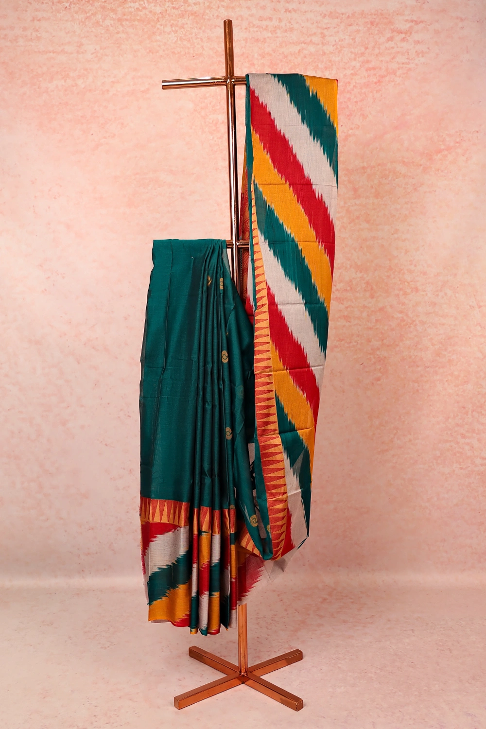 Green Cotton Plain Body Saree with Pochampally border. Includes Unstitched Blouse