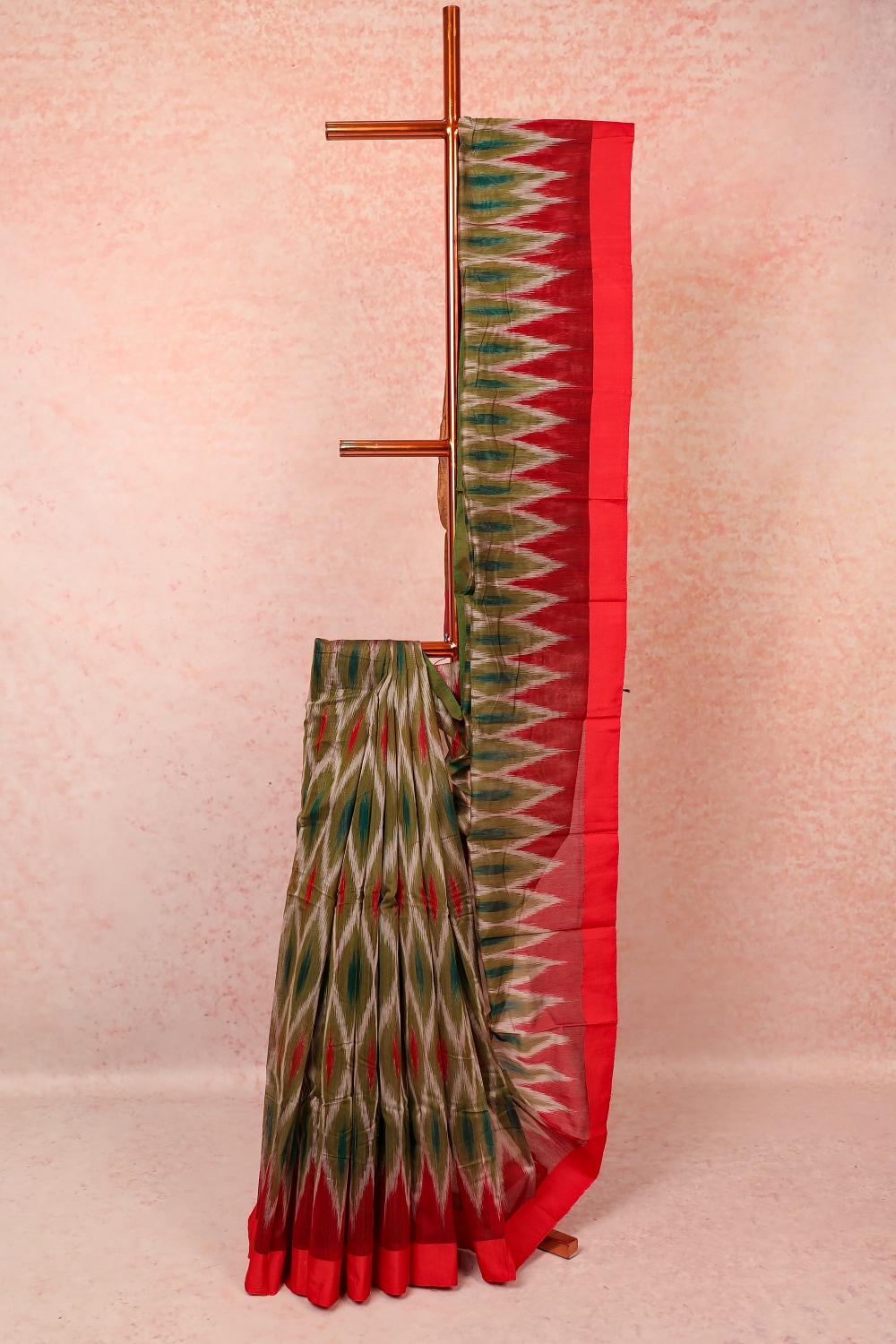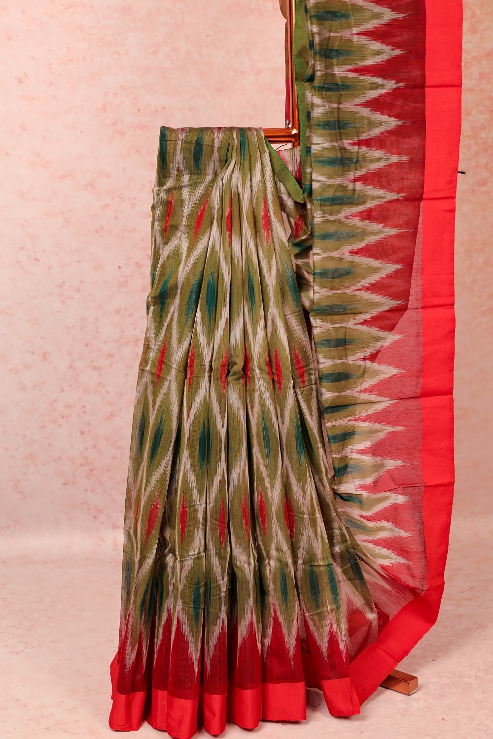 Green Cotton Pochampalli Printed Saree with Plain Border. Includes Unstiched Blouse
