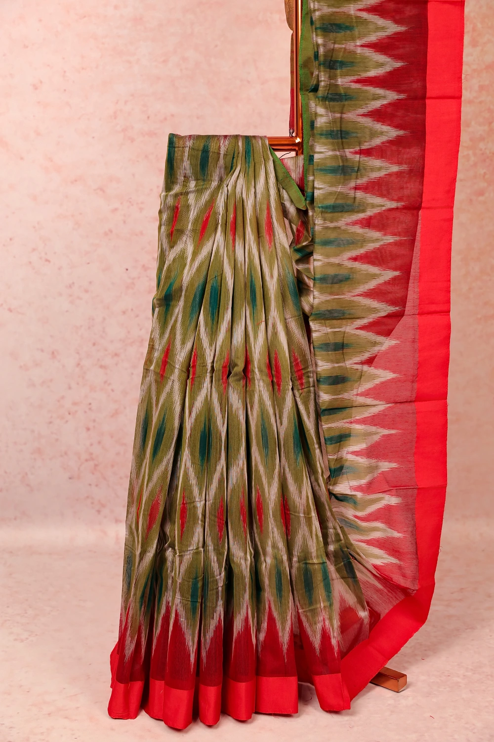 Green Cotton Pochampalli Printed Saree with Plain border. Includes Unstitched Blouse