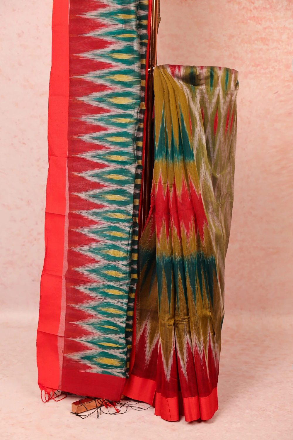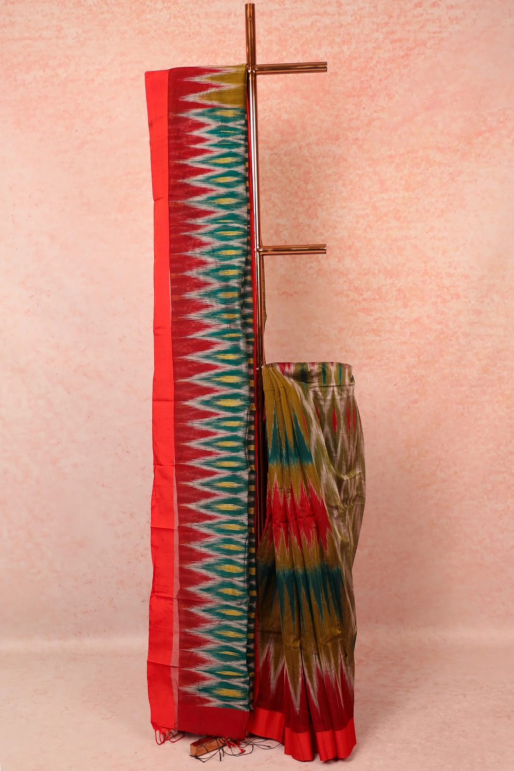 Green Cotton Silk Pochampalli Printed Saree with Plain border. Includes Unstitched Blouse