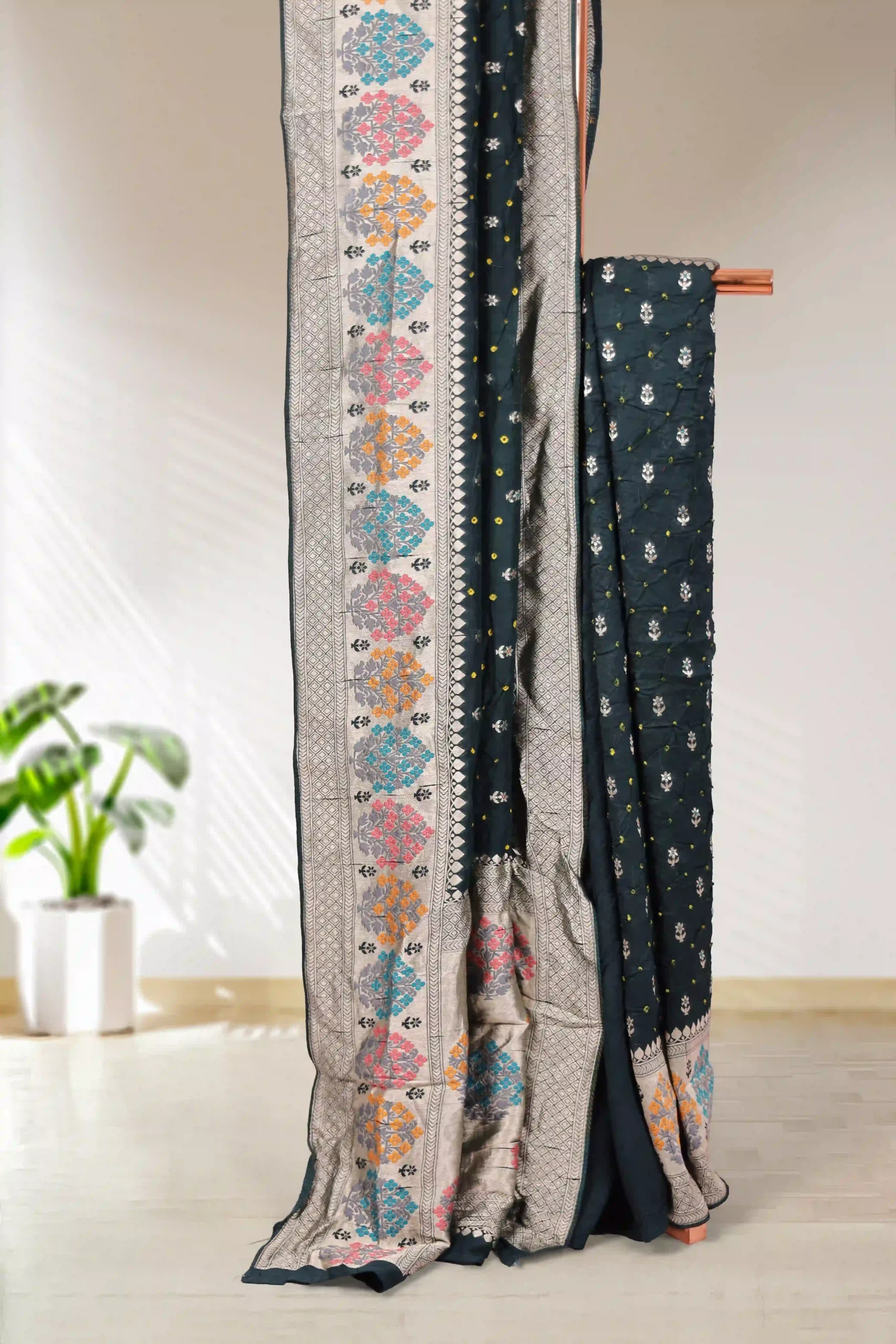 Green Georgette Butta Saree with Designer border. Includes Unstitched Blouse