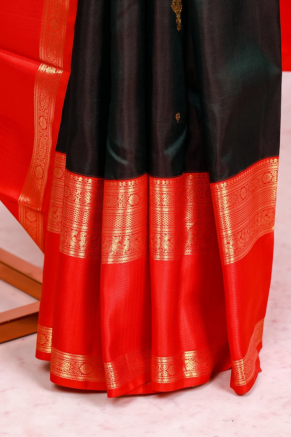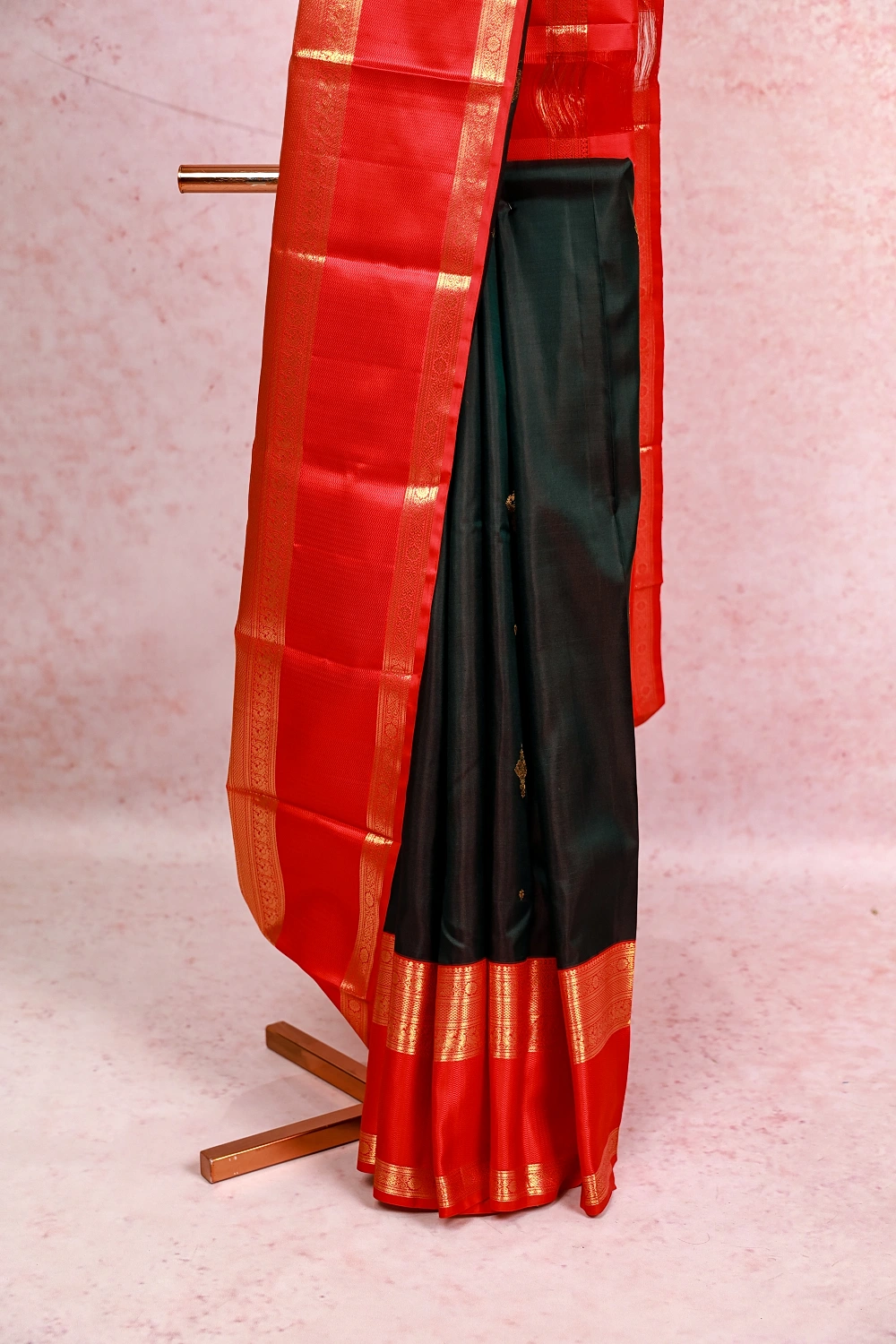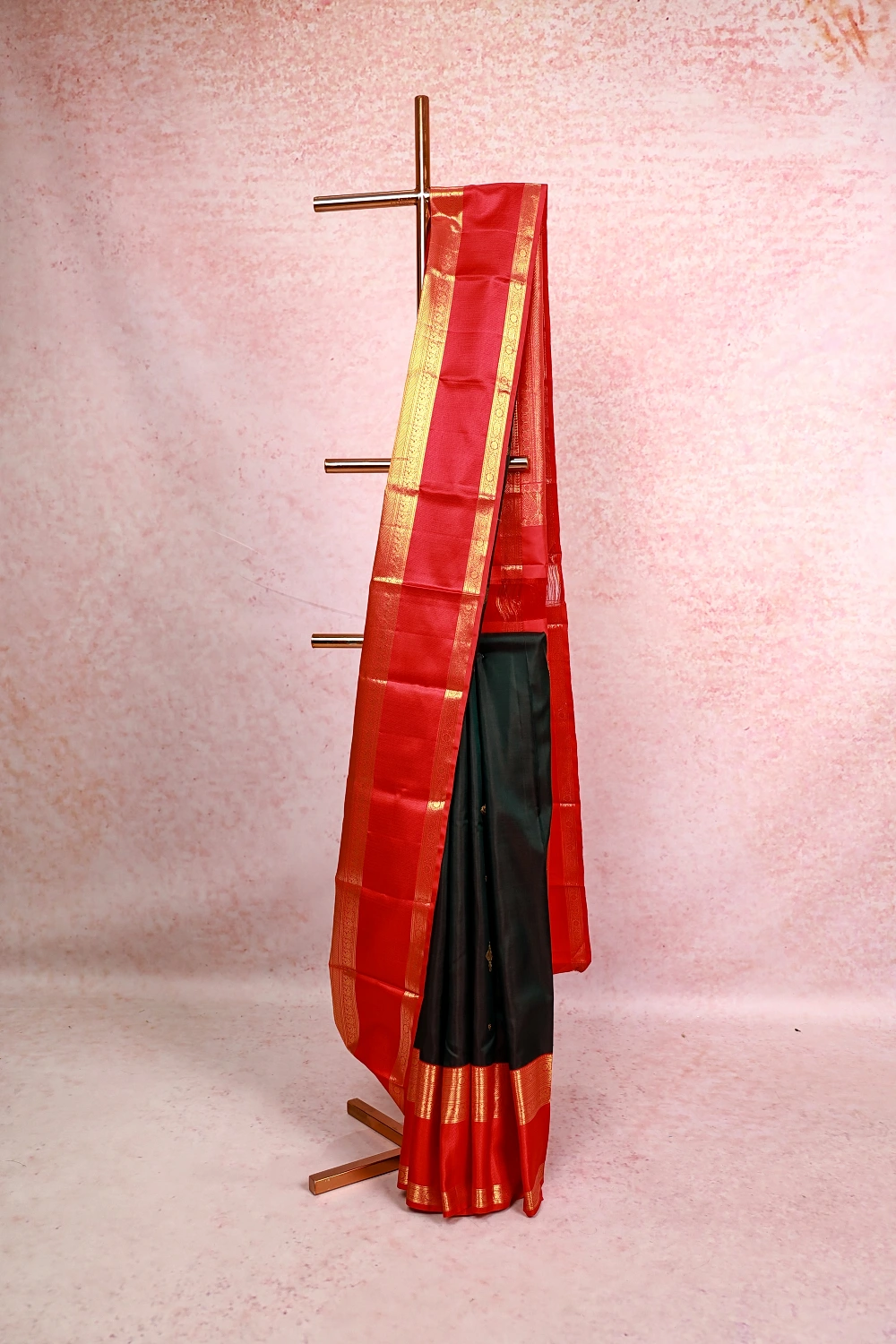 Green Kancheepuram Silk Butta Saree With Traditional Zari Border. Includes Unstitched Blouse