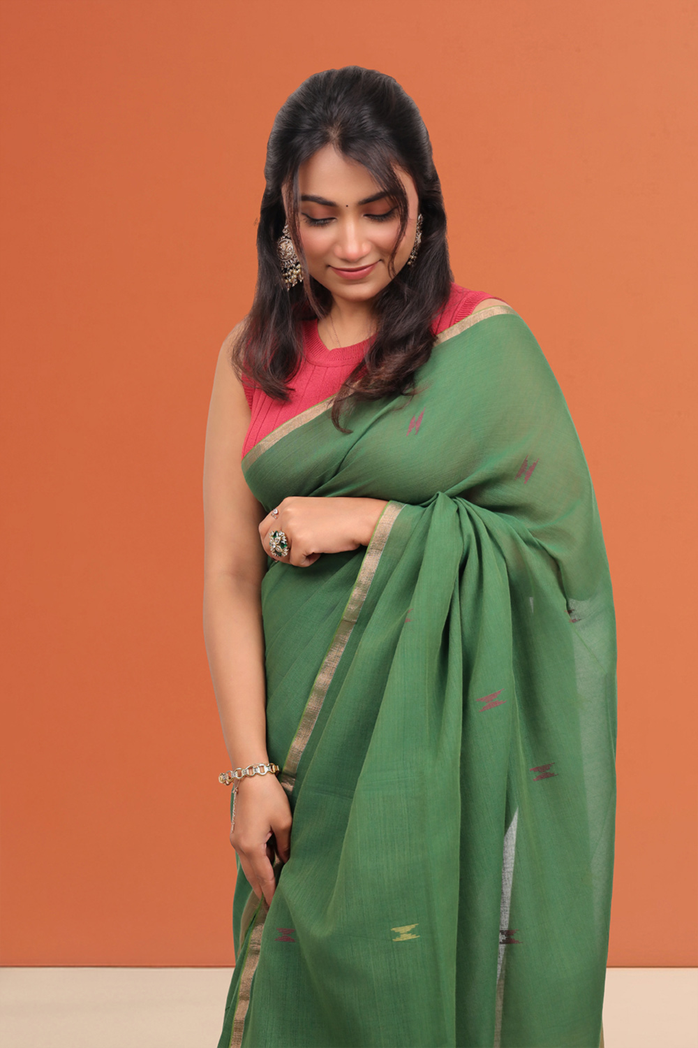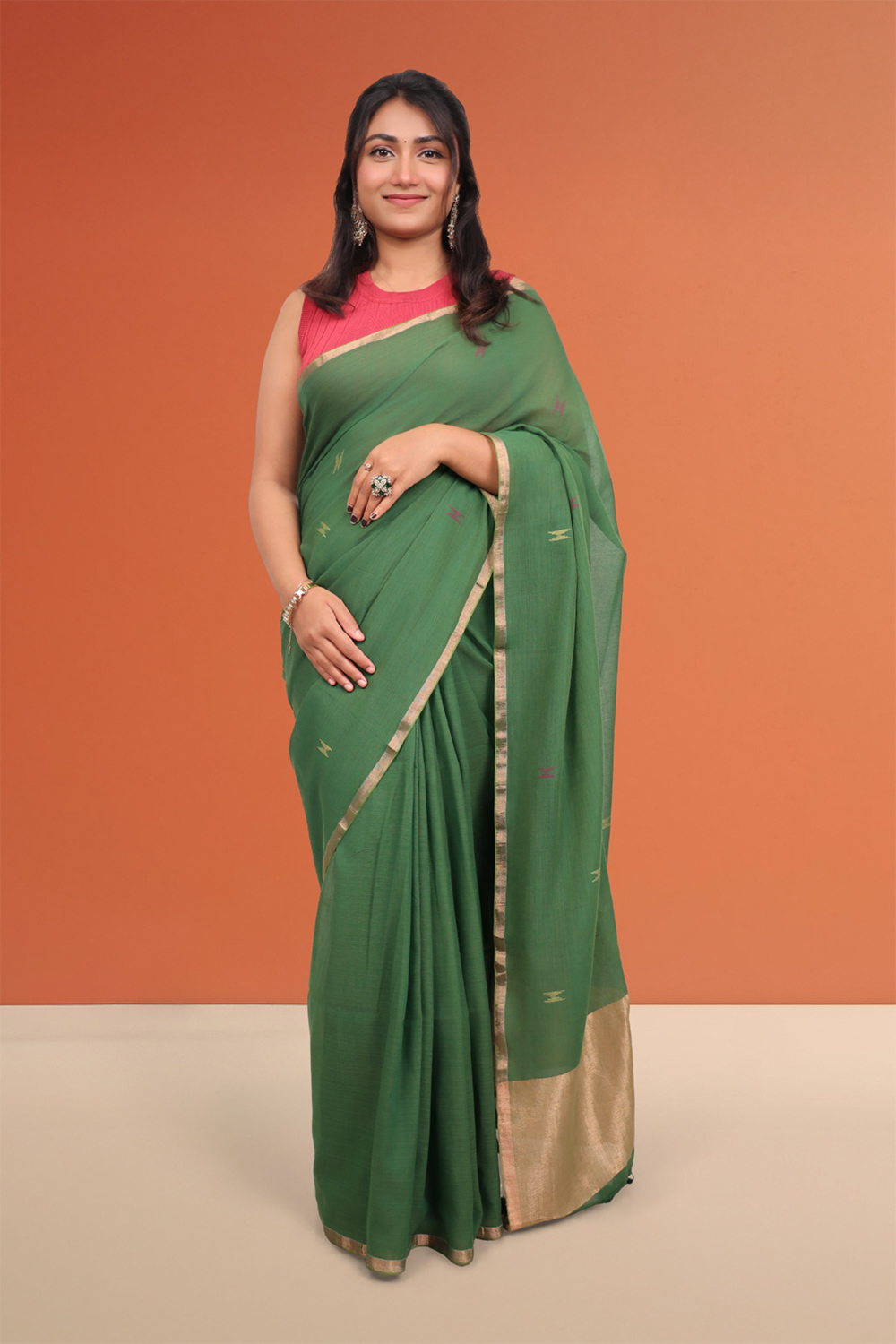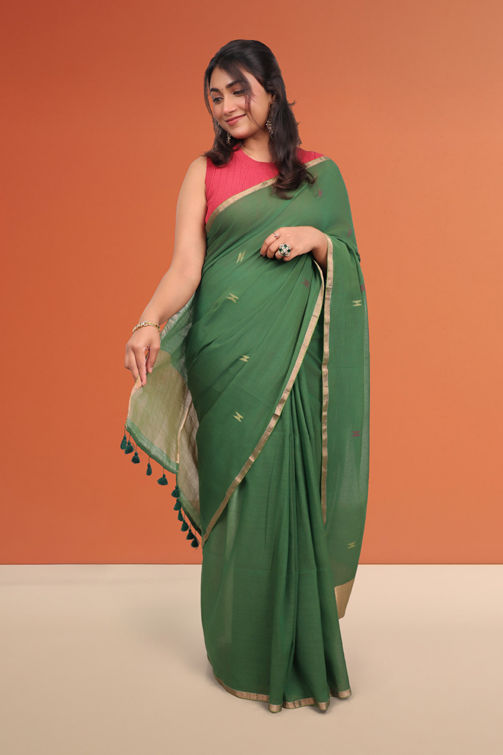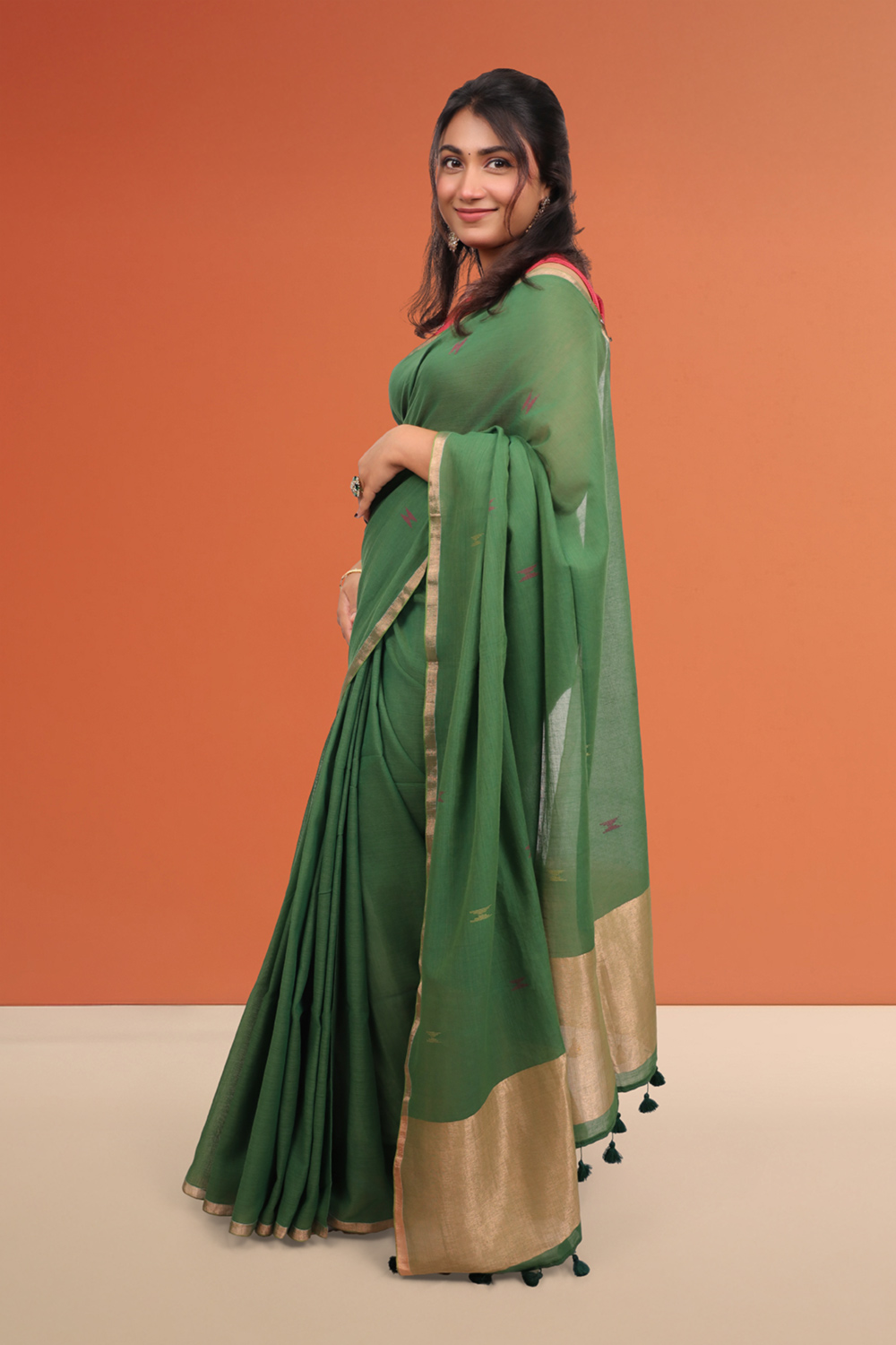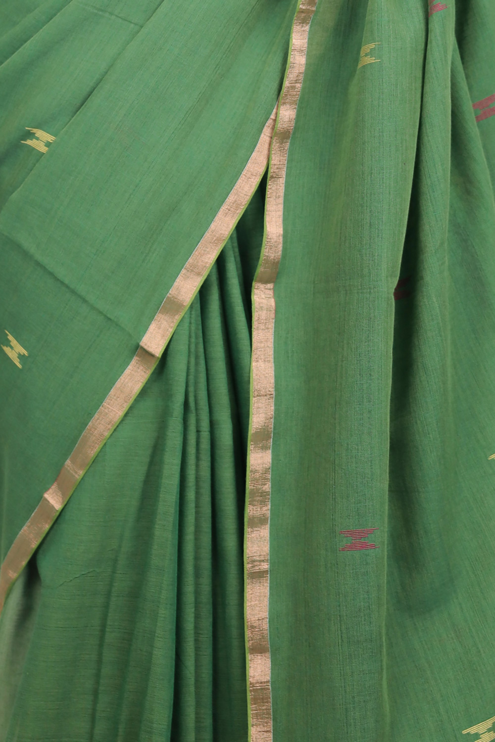 Green Mul Cotton Butta Saree with Small border.