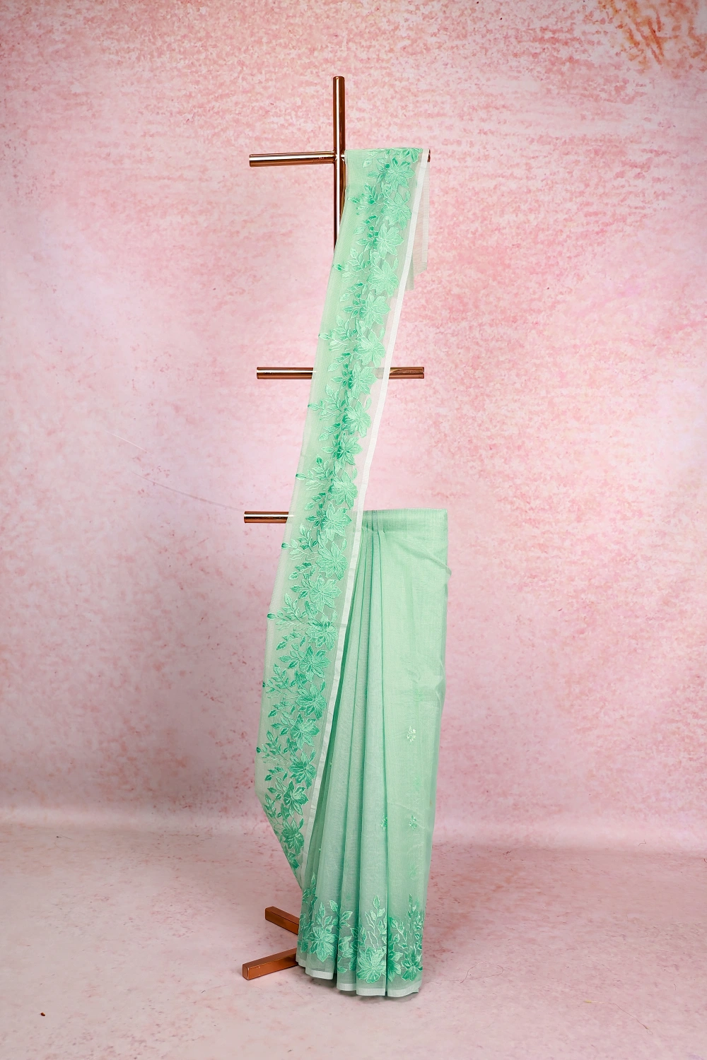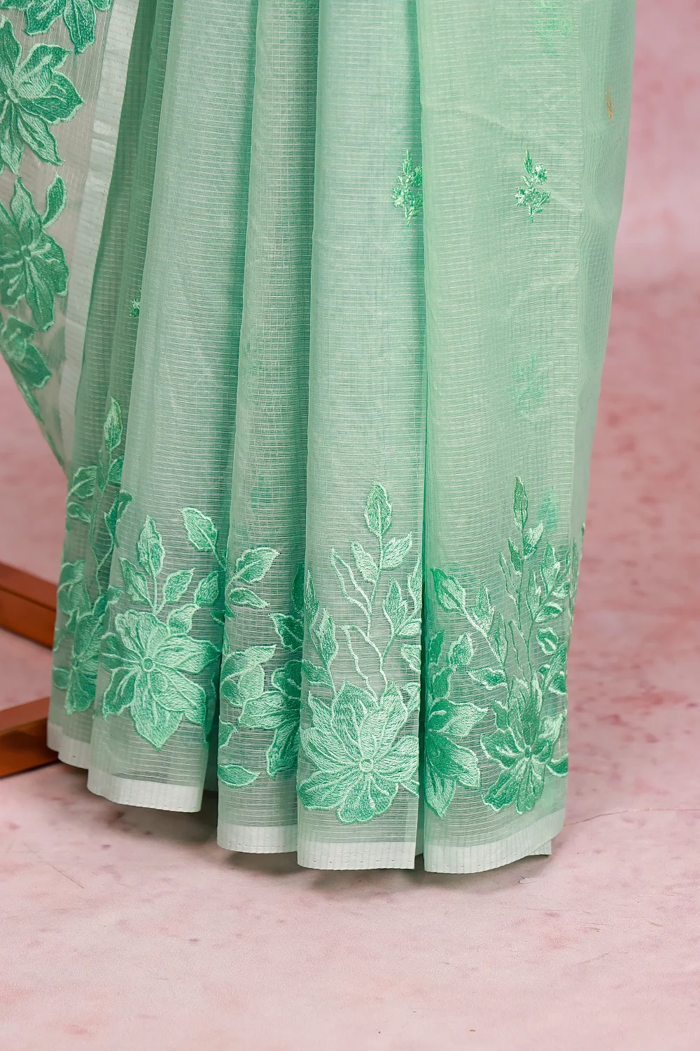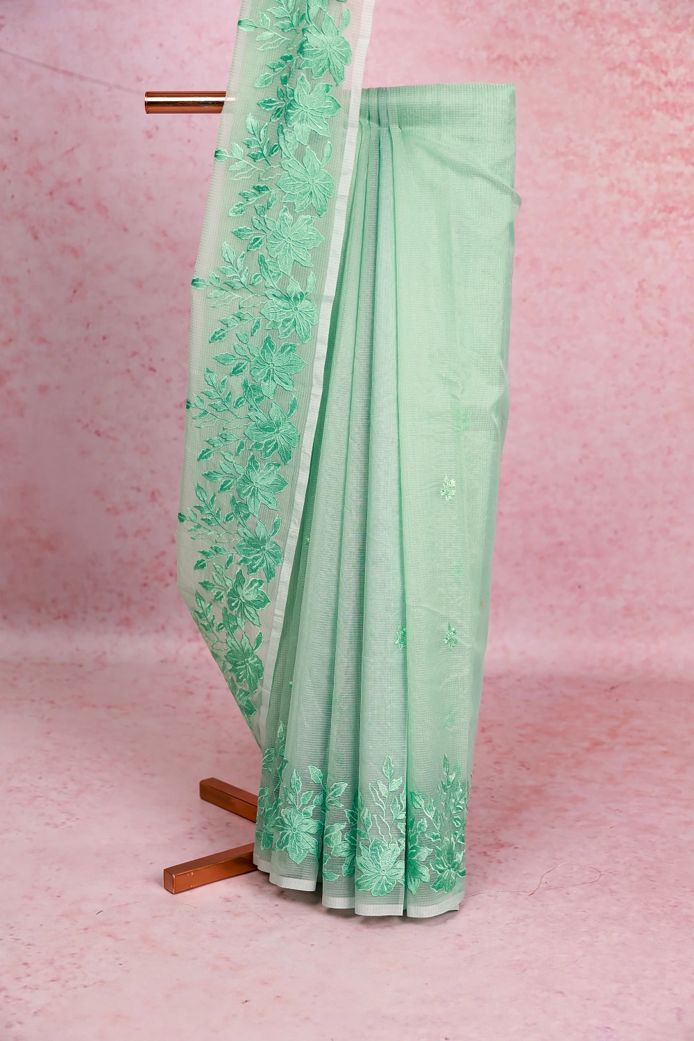 Green Net Kota Butta Saree with Thread Border. Includes Unstitched Blouse