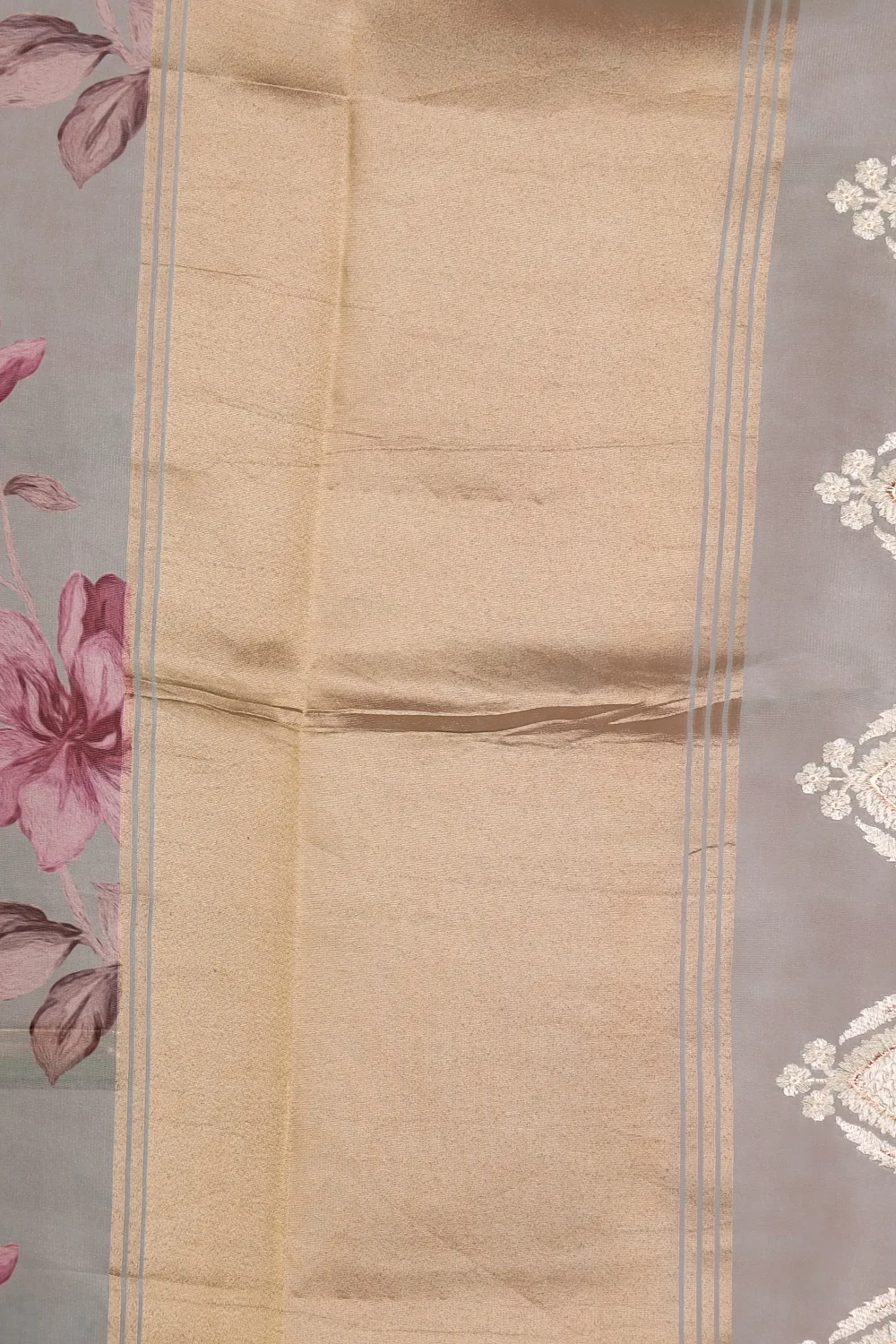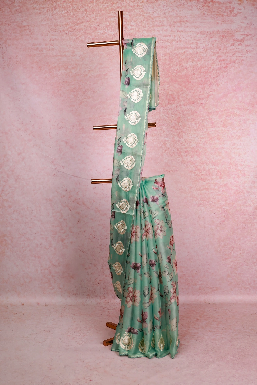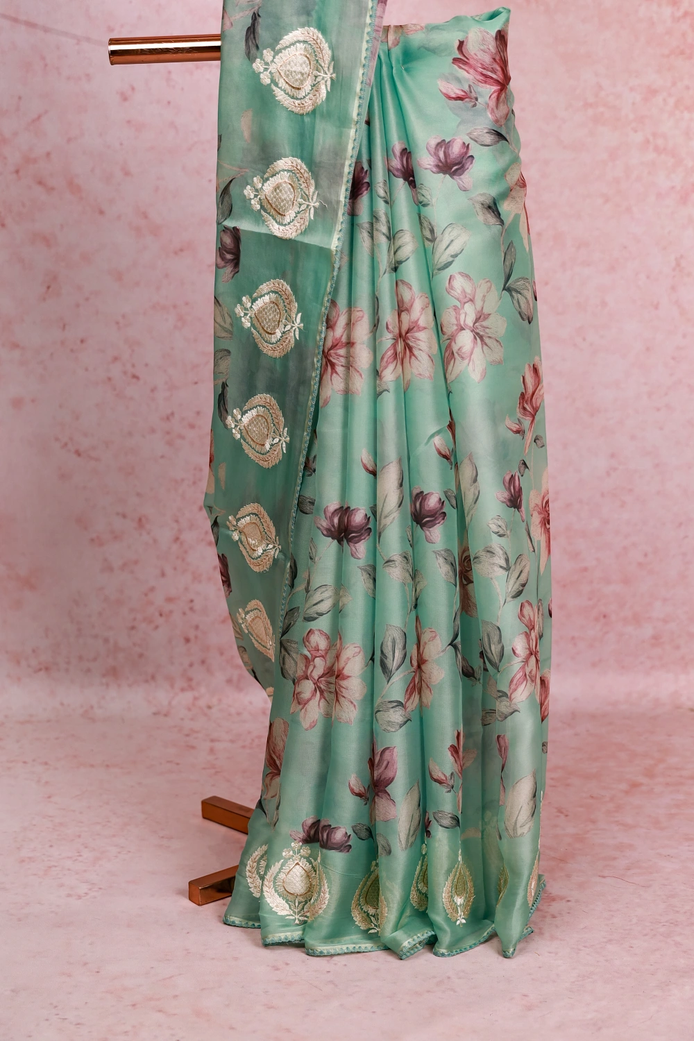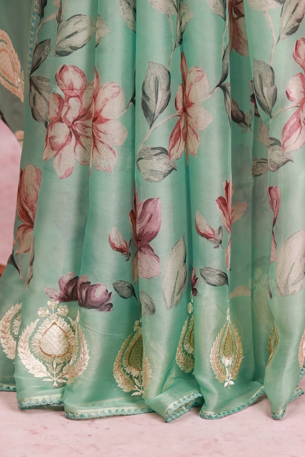 Green Organza Floral Design Saree With Lays Border. Includes Un Stitched Blouse