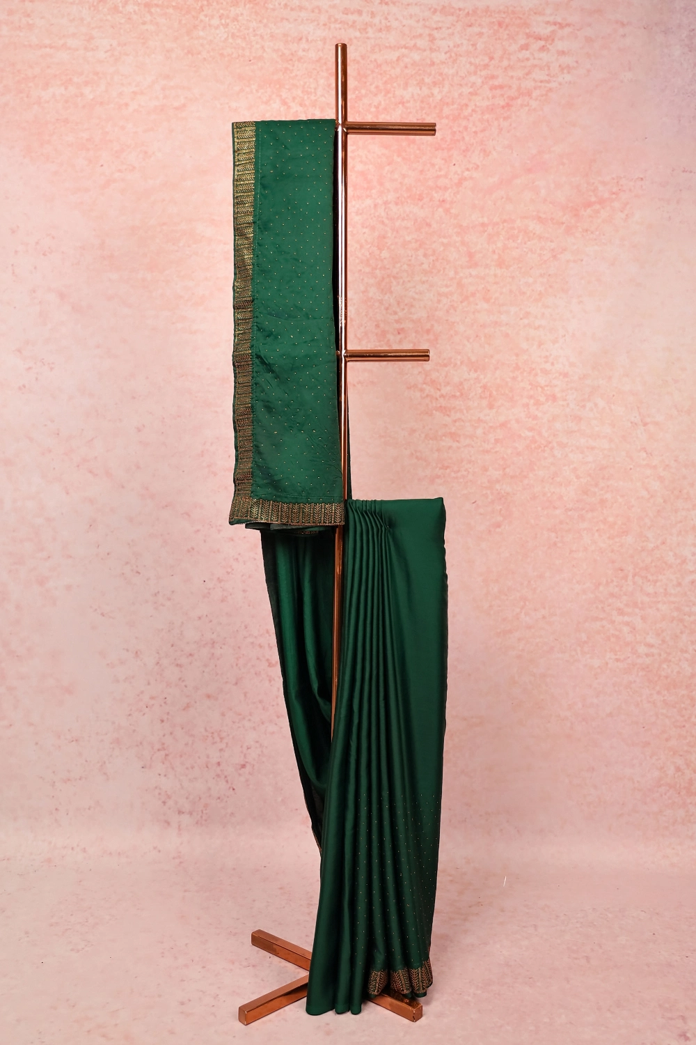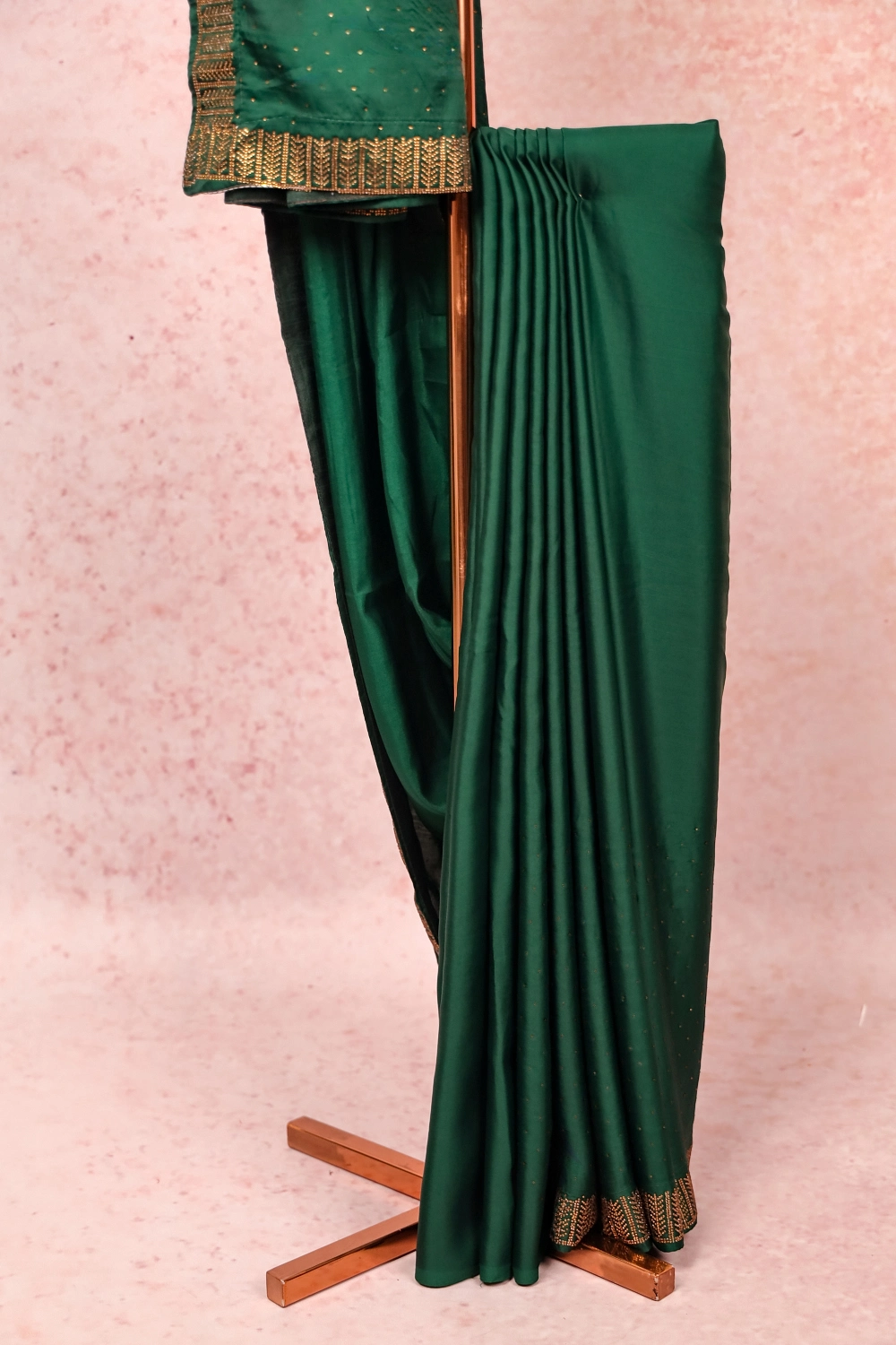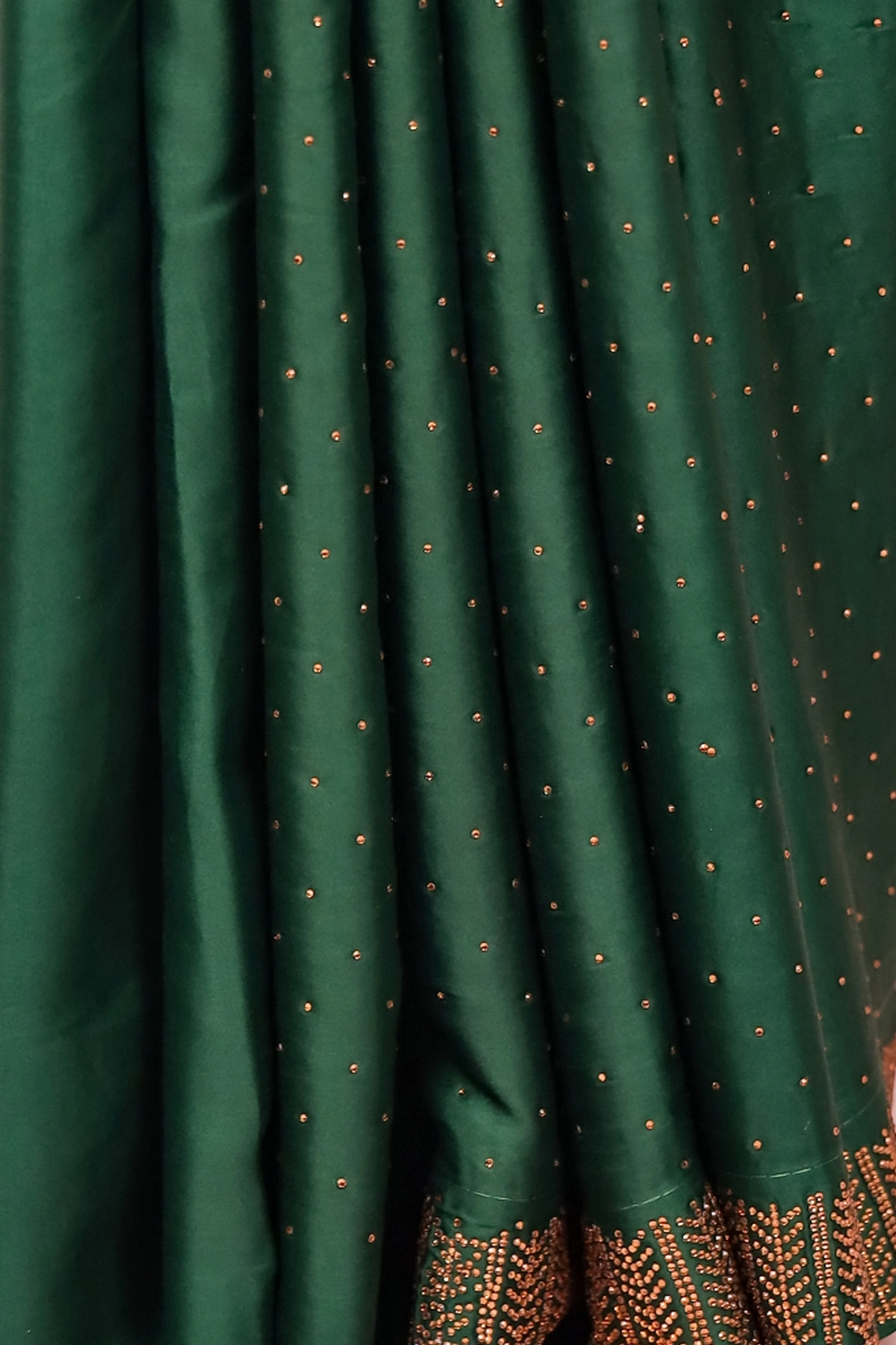 Green Satin Stone Work Saree with Stone Border. Includes Unstitched Blouse
