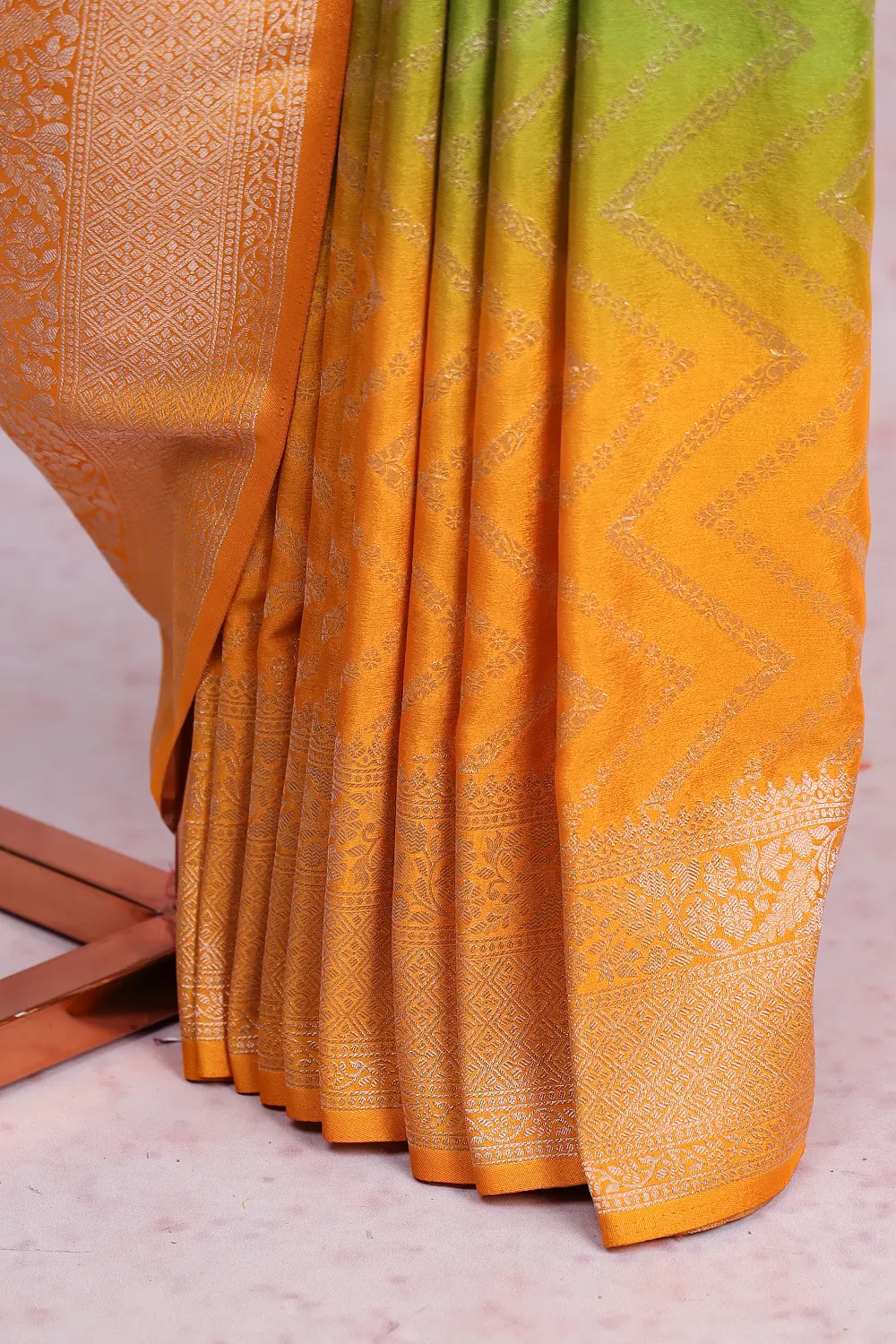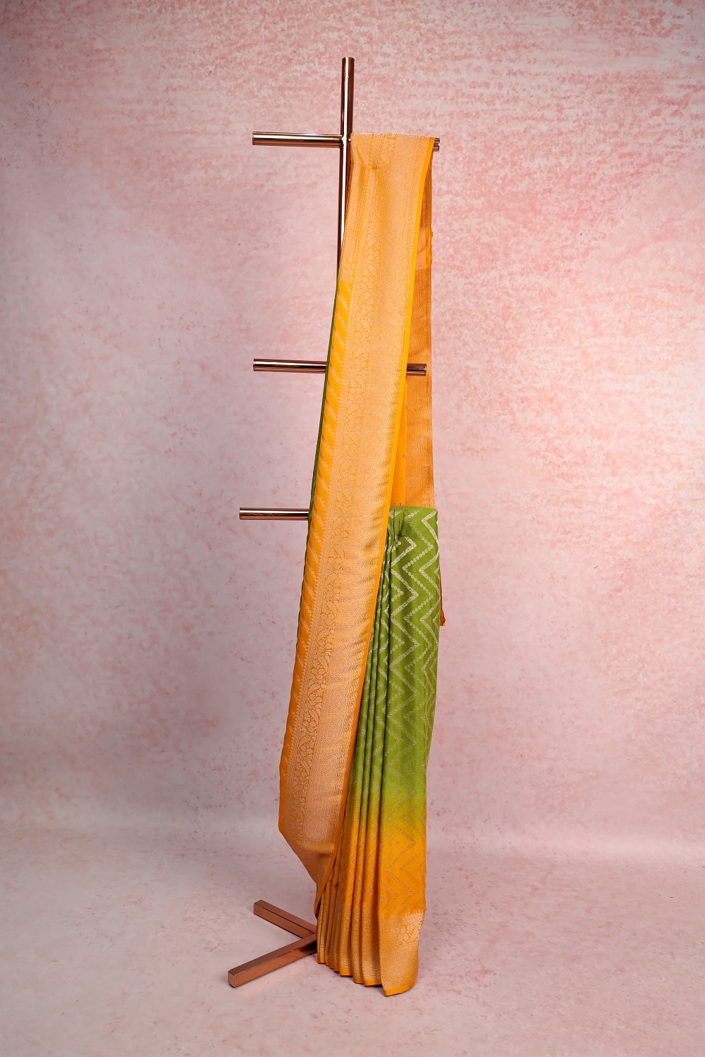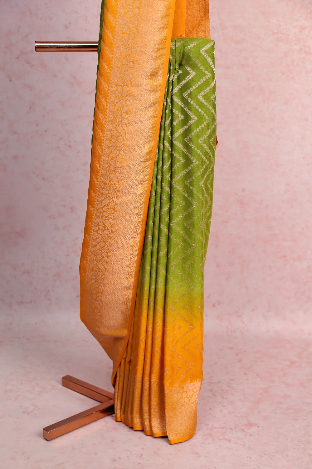 Green Semi Banarasi Zig Zag Saree with Designer Border. Includes Unstitched Blouse
