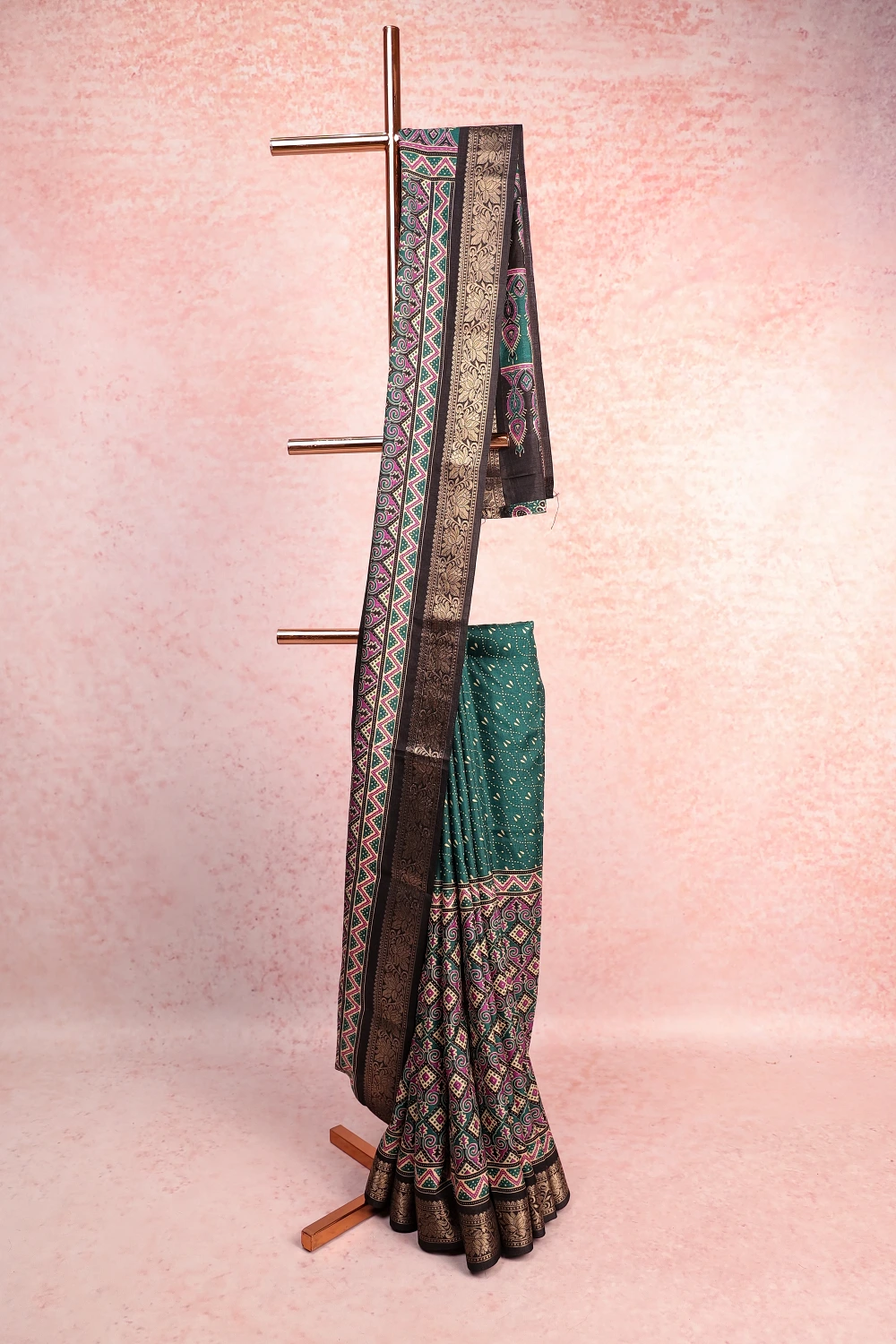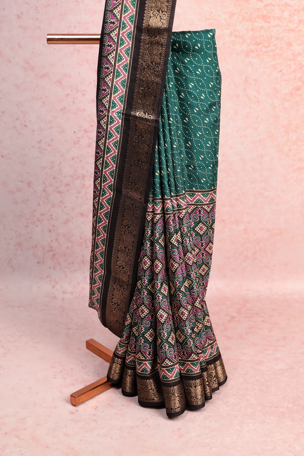 Green Semi Chanderi Chungadi Printed Saree with Contrast Border. Includes Un stitched Blouse