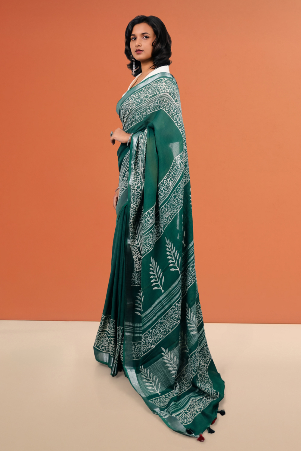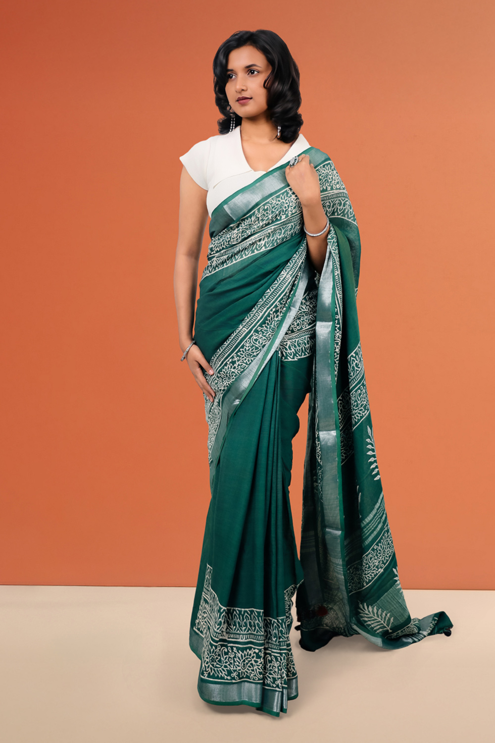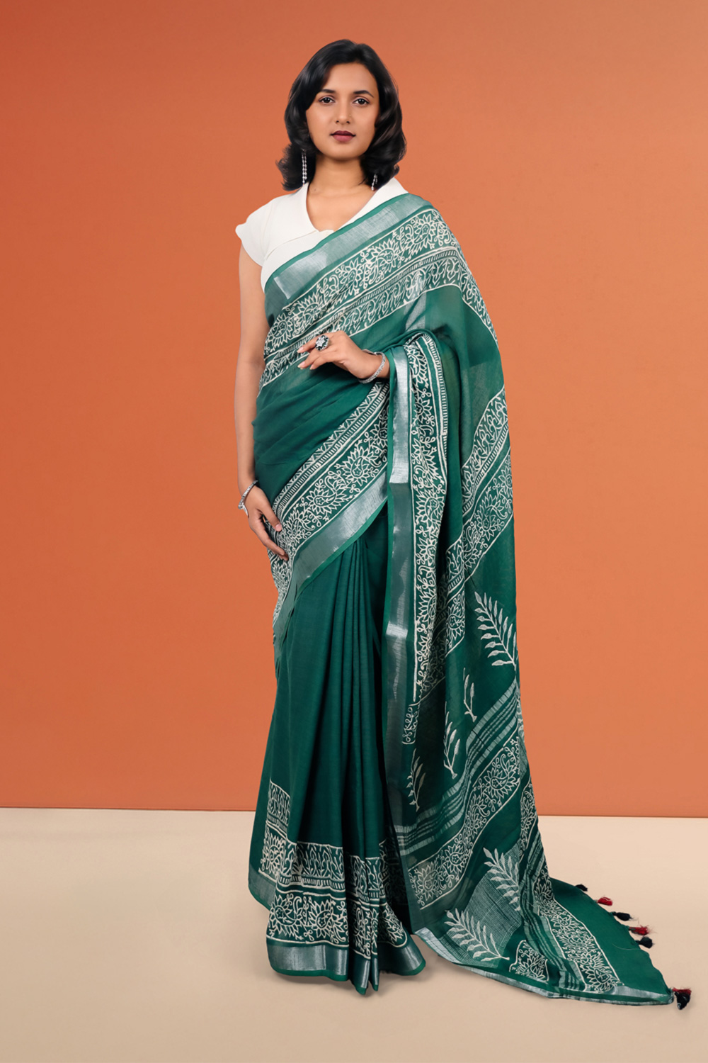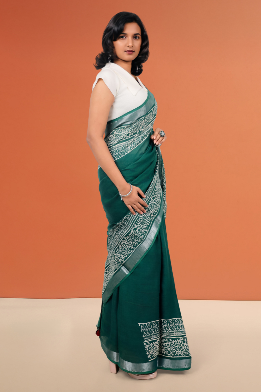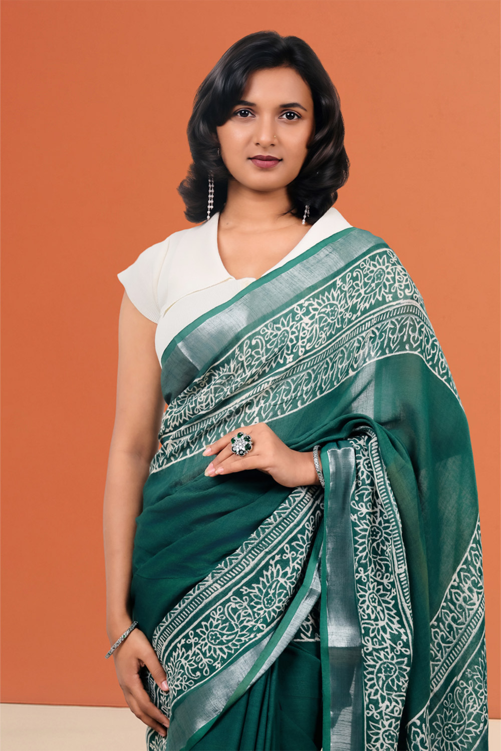 Green Semi Linen Plain Body Saree with Silver border. Includes unstitched Blouse Material