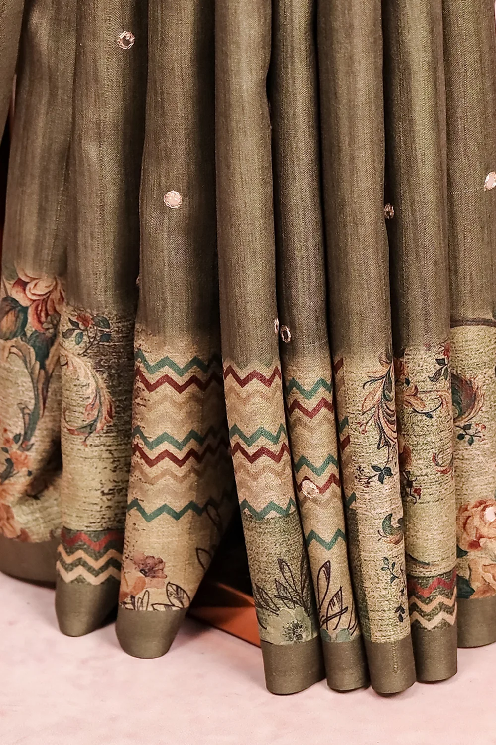 Green Semi Silk Mirror Work Saree with Thread Border. Includes Unstitched Blouse.