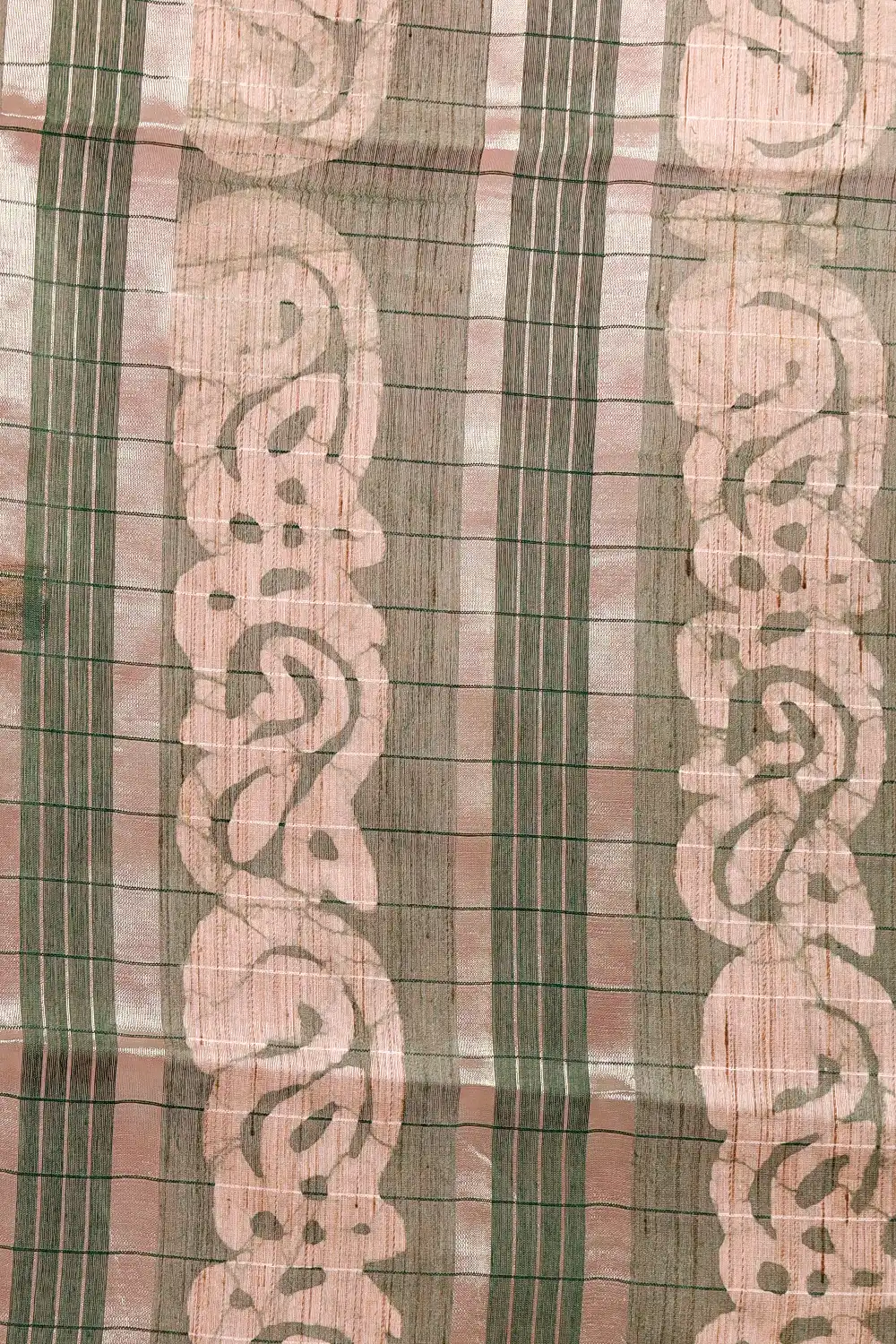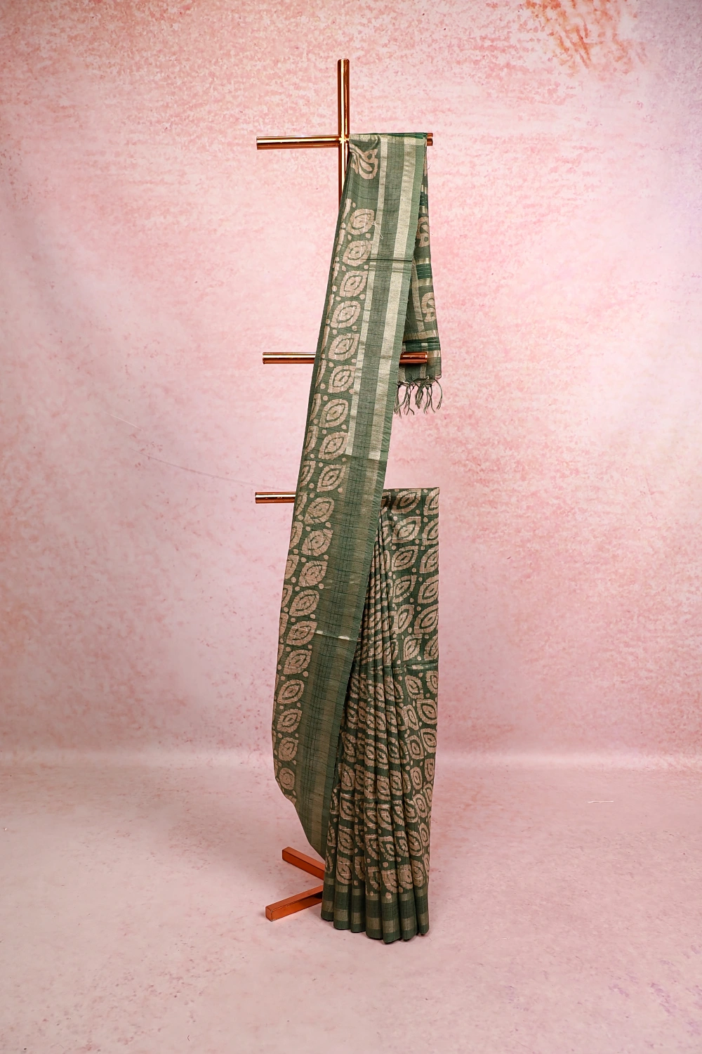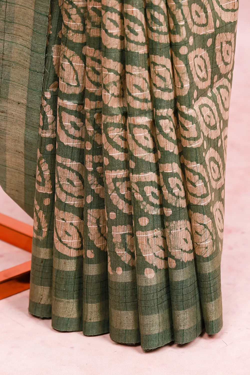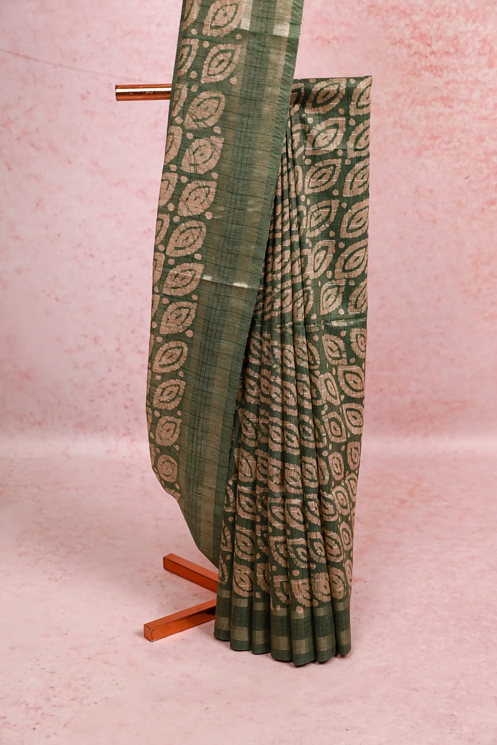 Green Semi Tussar Bathik Printed Saree With Zari Border. Includes Unstitched Blouse