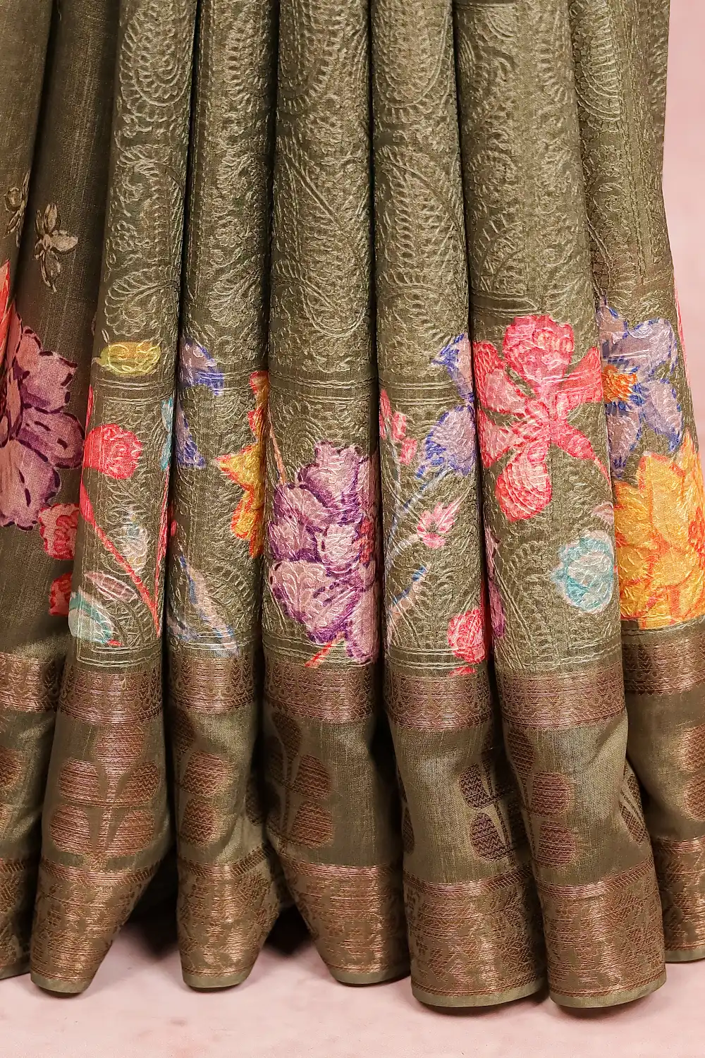 Green Semi Tussar Embrodery Saree with Designer Border. Includes Unstitched Blouse.