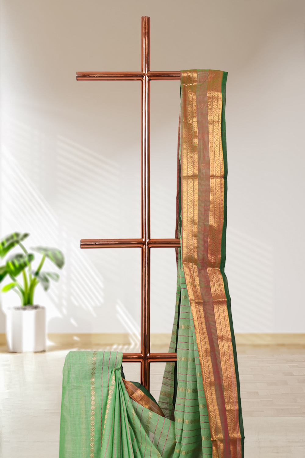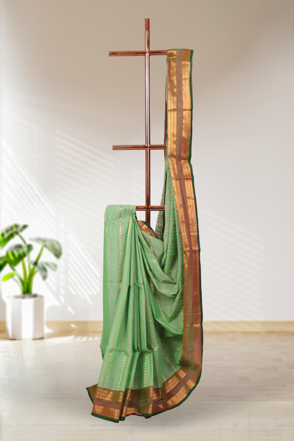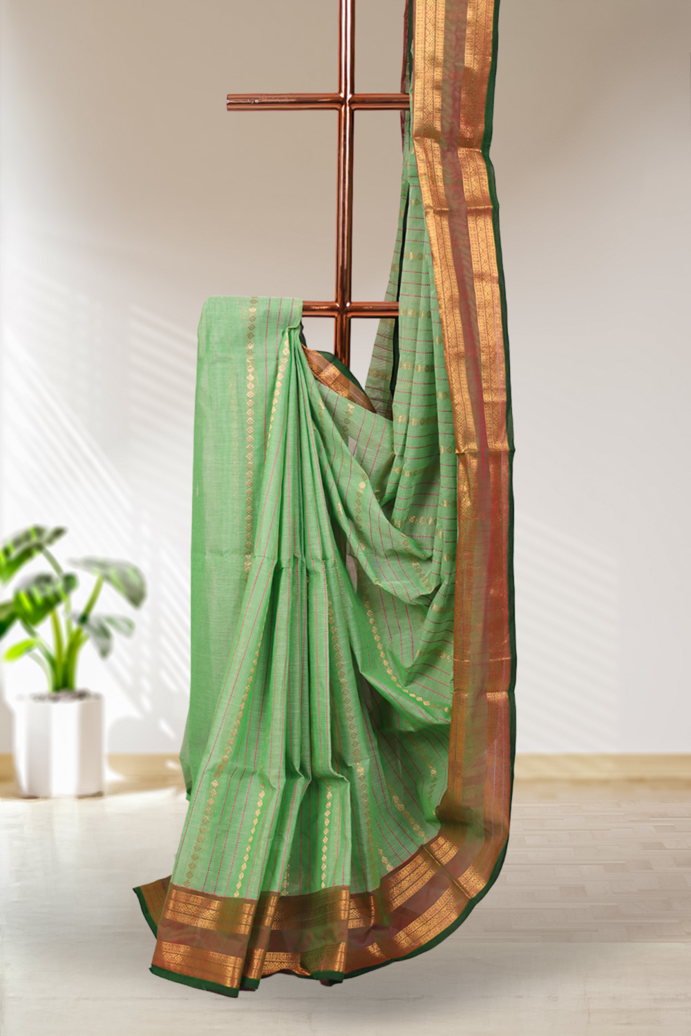 Green Village Cotton Stripes Saree with Designer border. Includes Unstitched Blouse