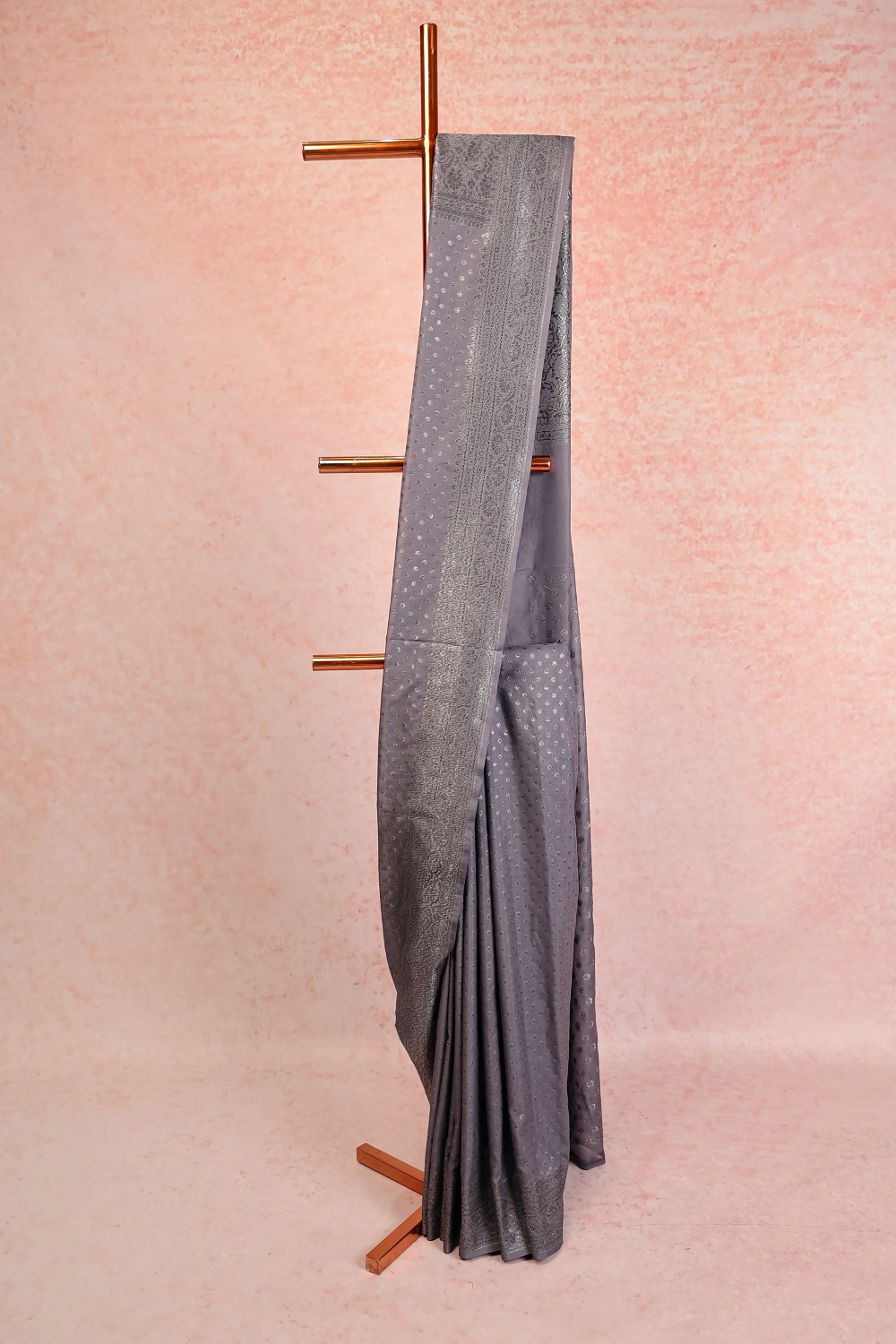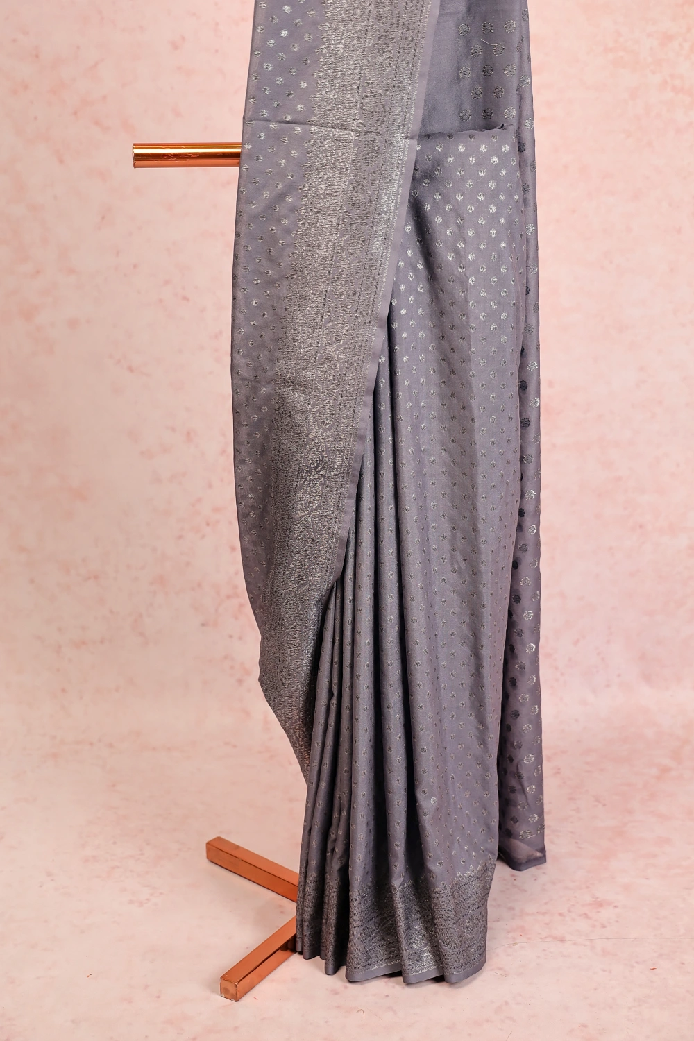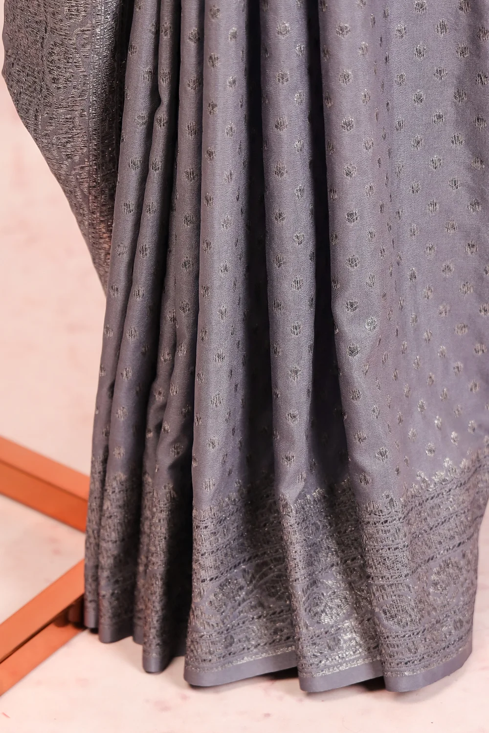 Grey Chanderi Banarasi Butta Saree with Designer Border. Includes Unstitched Blouse