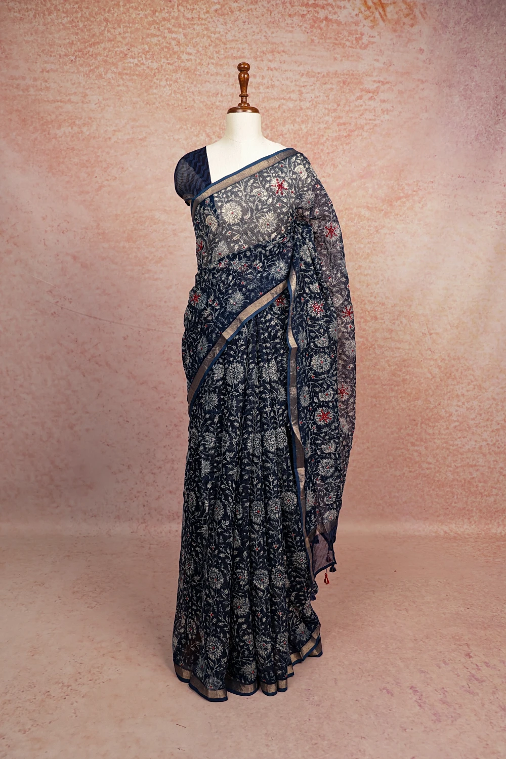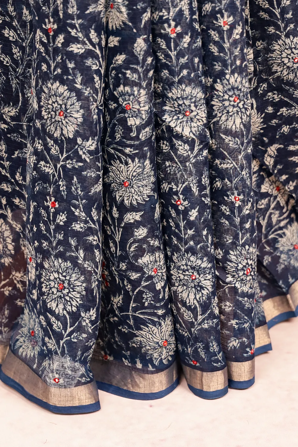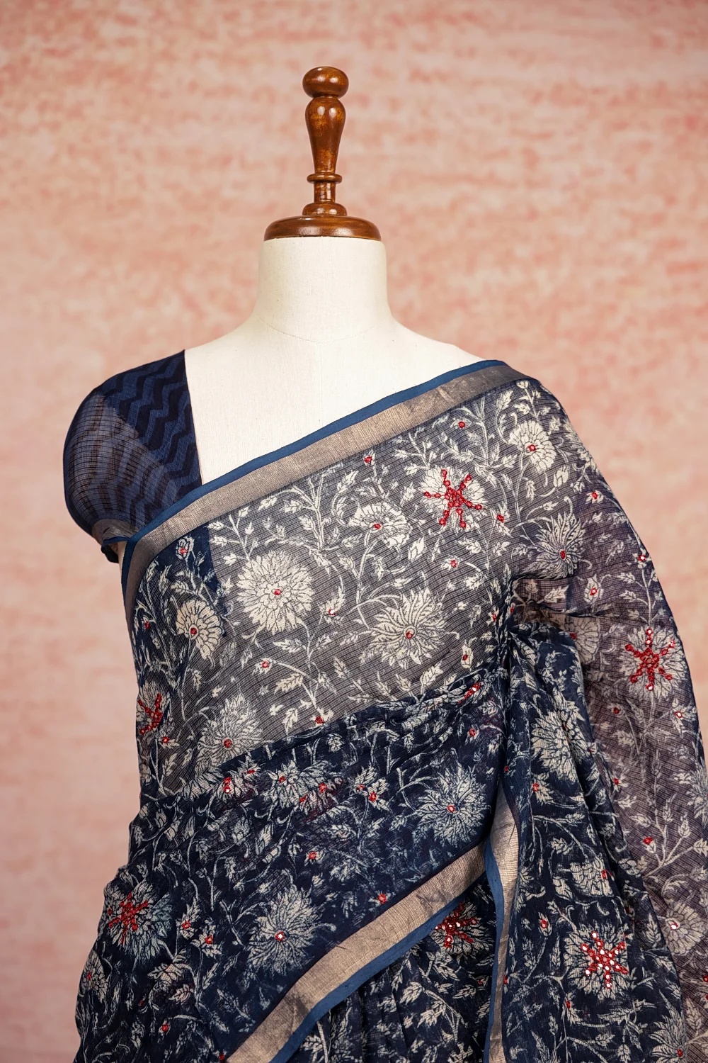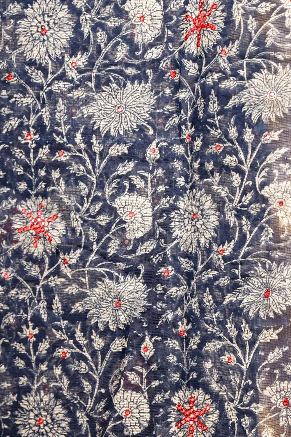 Indigo Blue Net Kota Printed With Mirror Work Saree With Small Border. Includes Unstitched Blouse