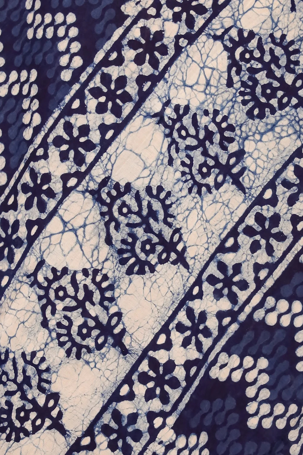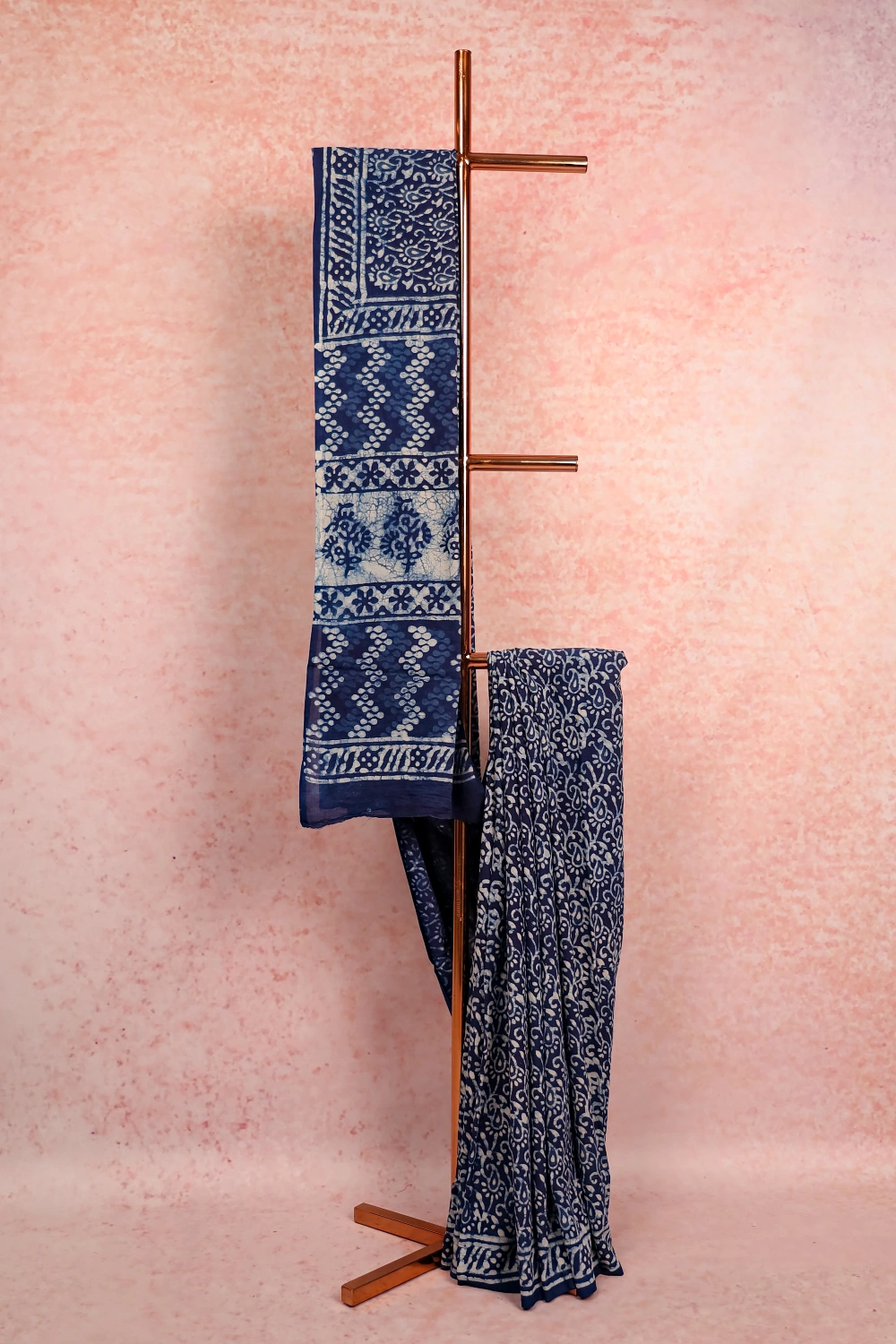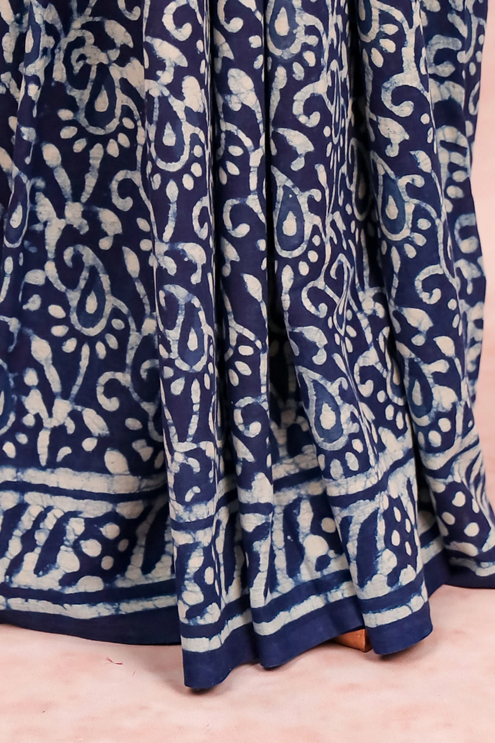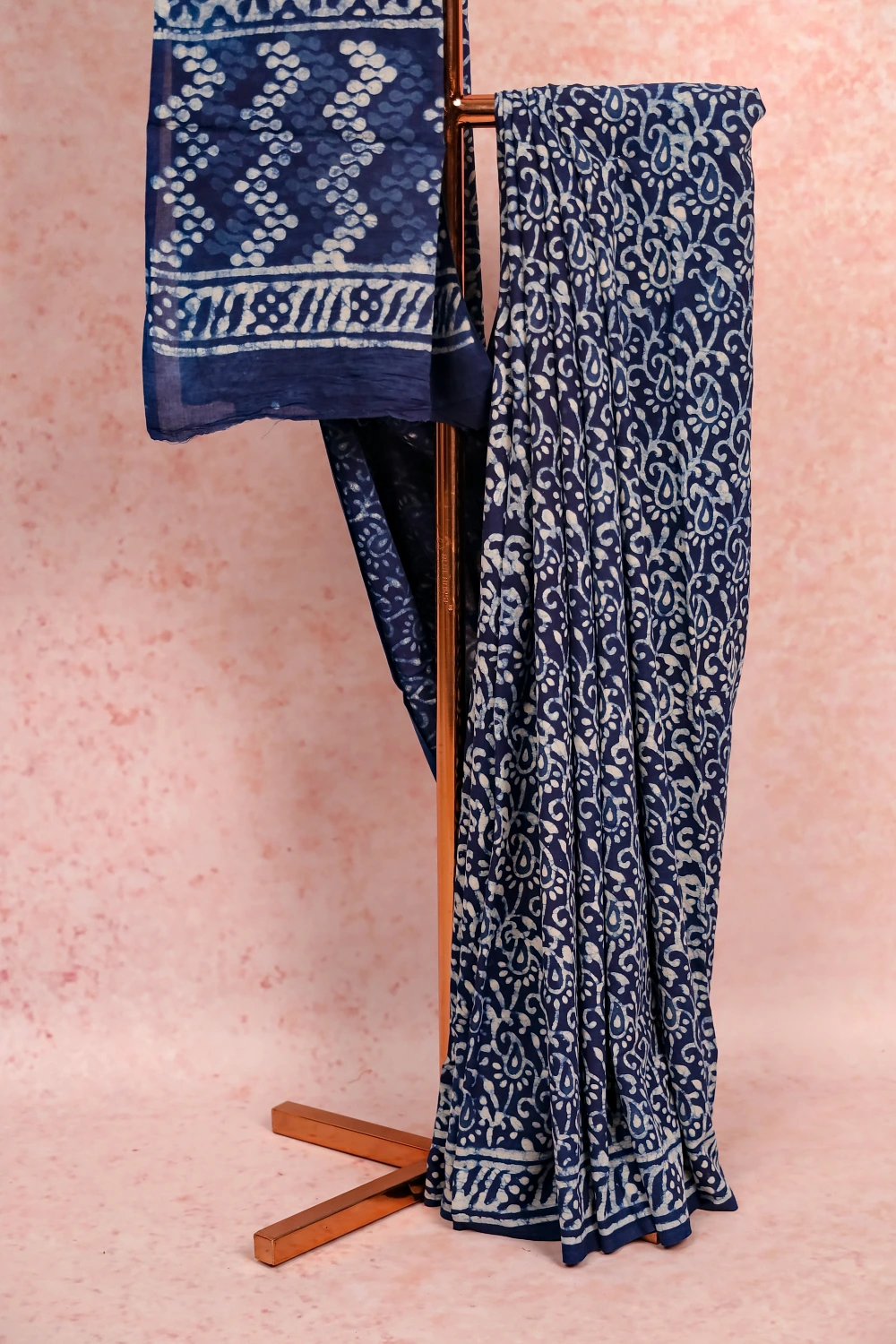Indigo Cotton Printed Saree with Printed Border. Includes Unstitched Blouse.