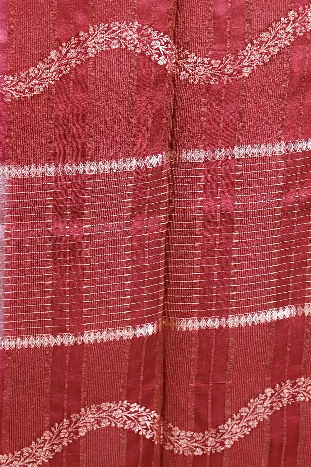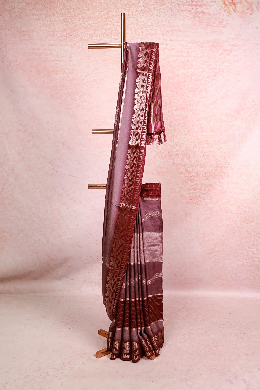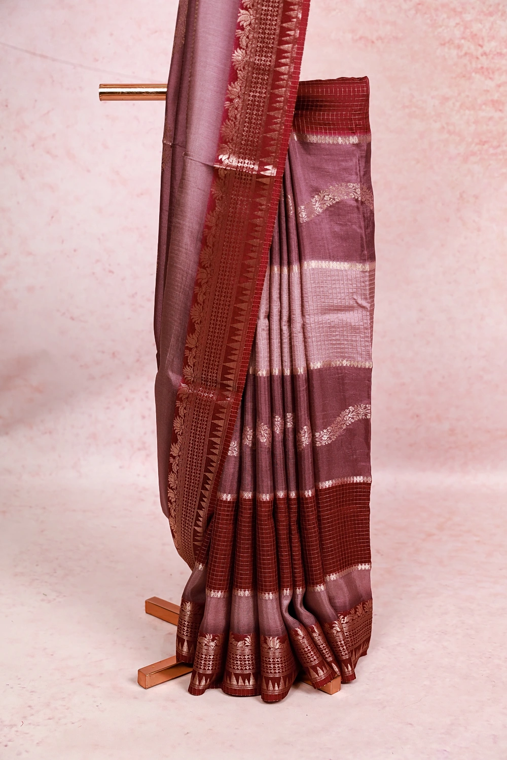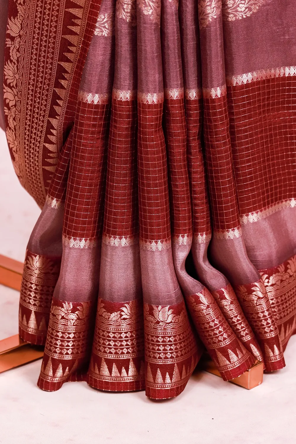 Lavender And Wine Semi Silk Check And Zari Work Saree With Banarasi Border. Includes Unstitched Blouse
