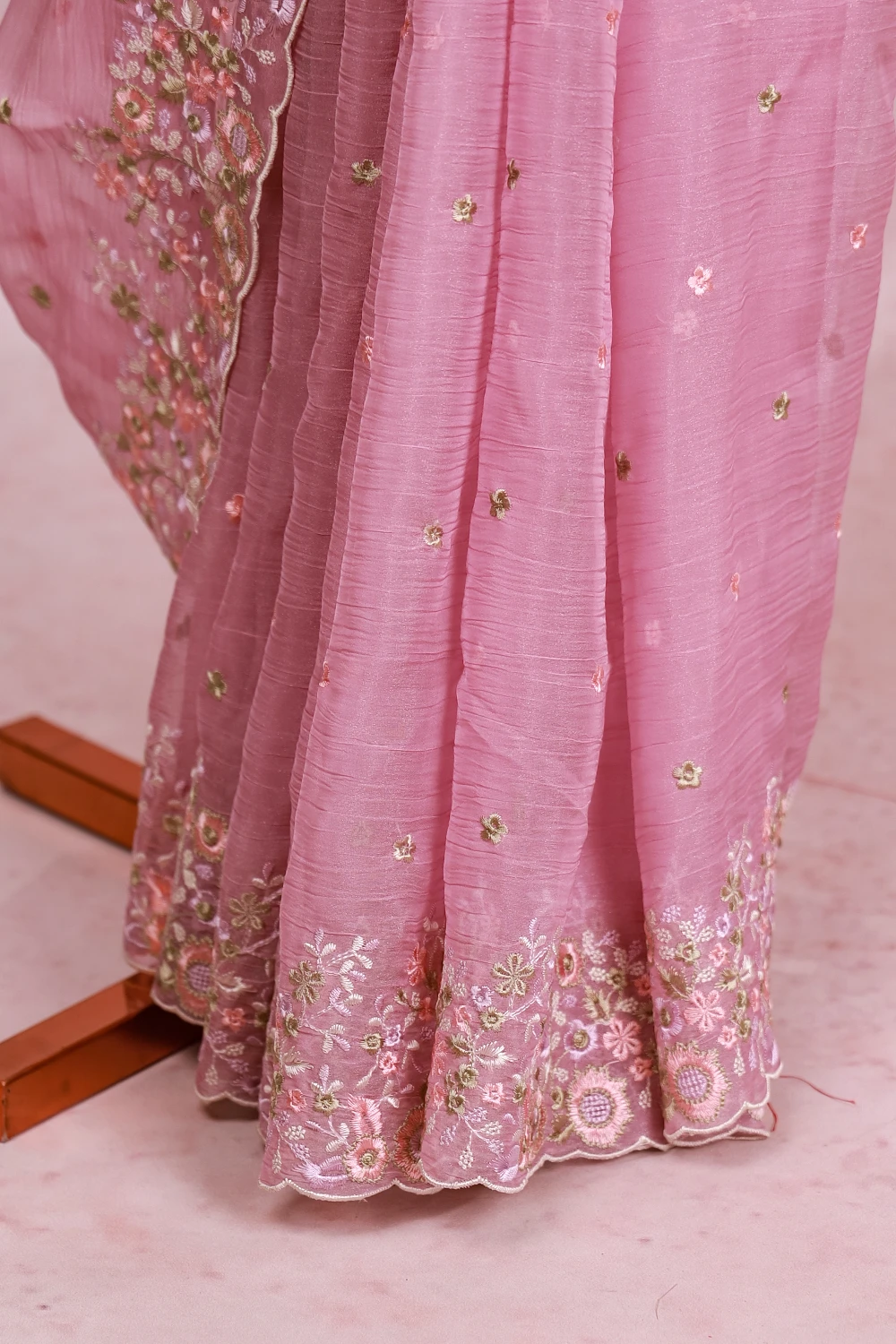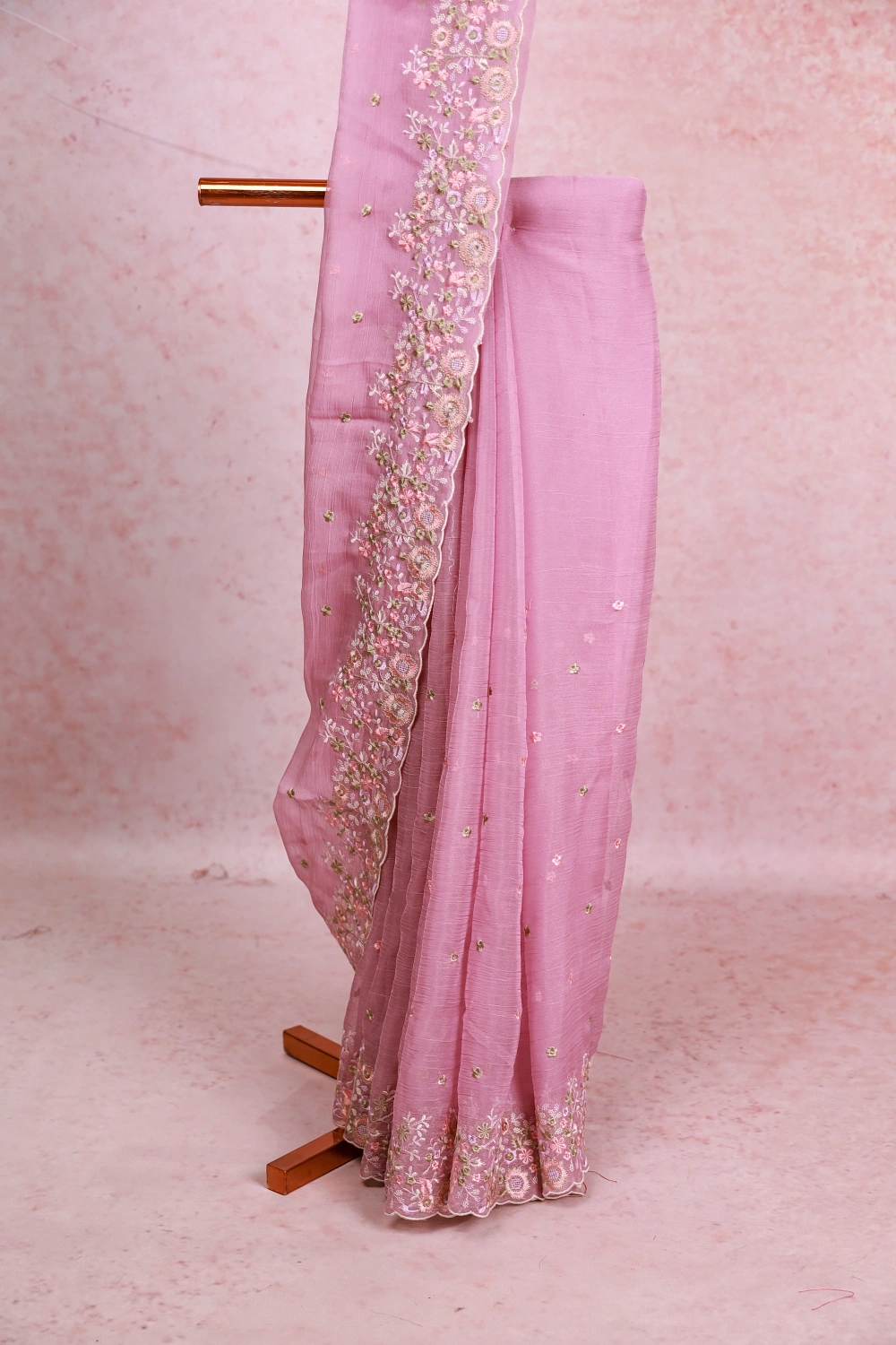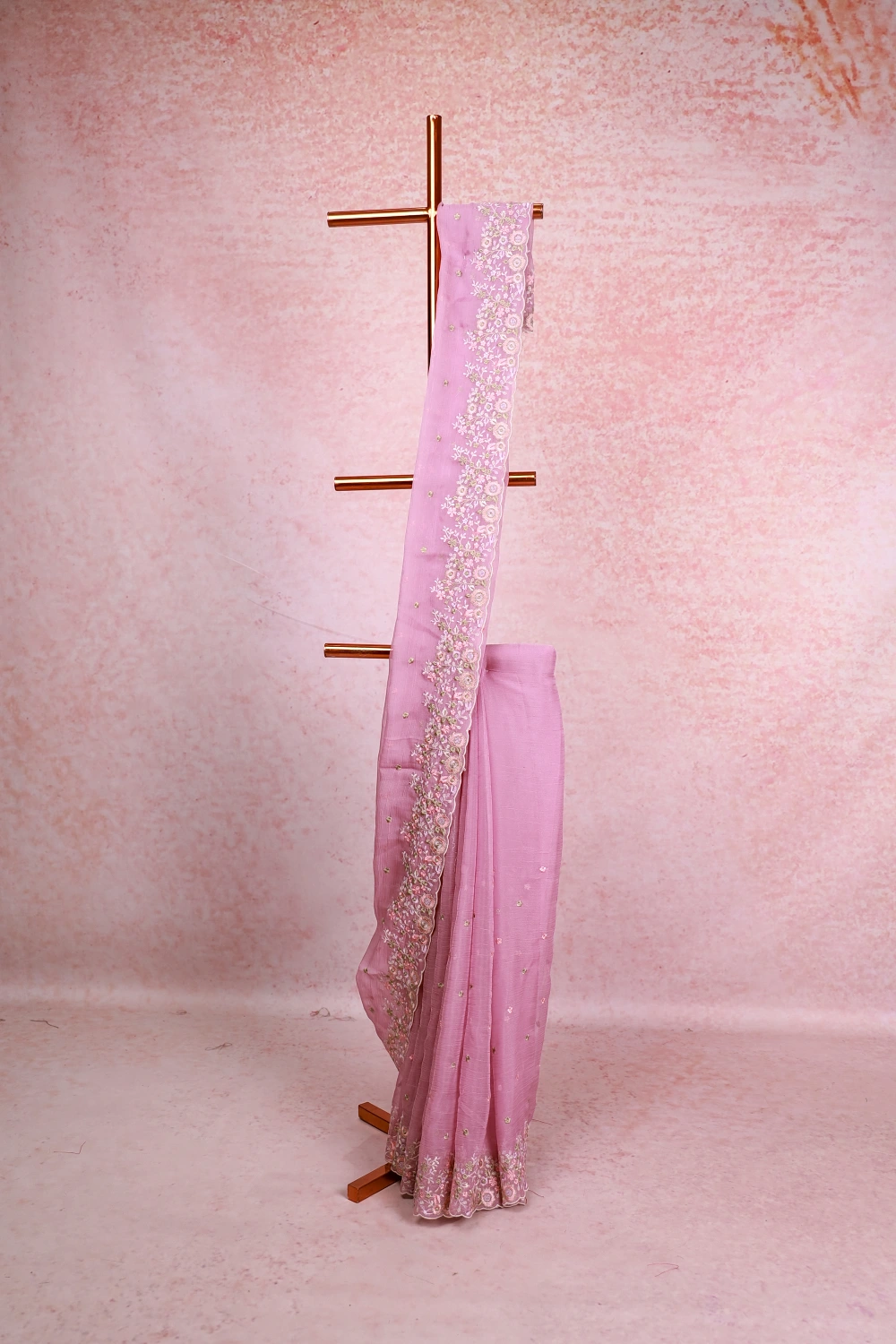 Lavender Crush Organza Thread Design Saree With Thread Border. Includes Un Stitched Blouse