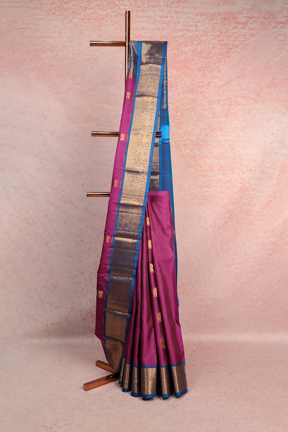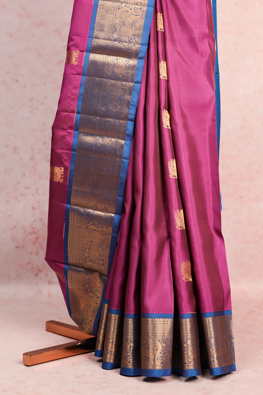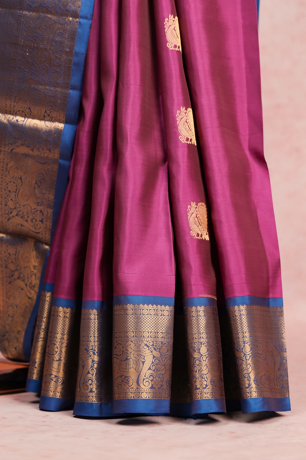 Lavender Kancheepuram Soft Silk Peacock Butta Saree with Designer Border. Includes Unstitched Blouse