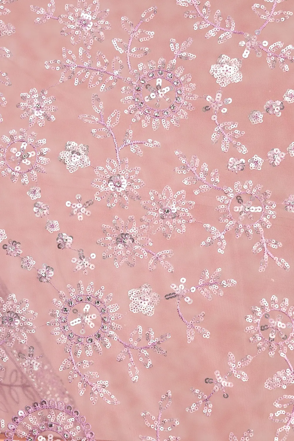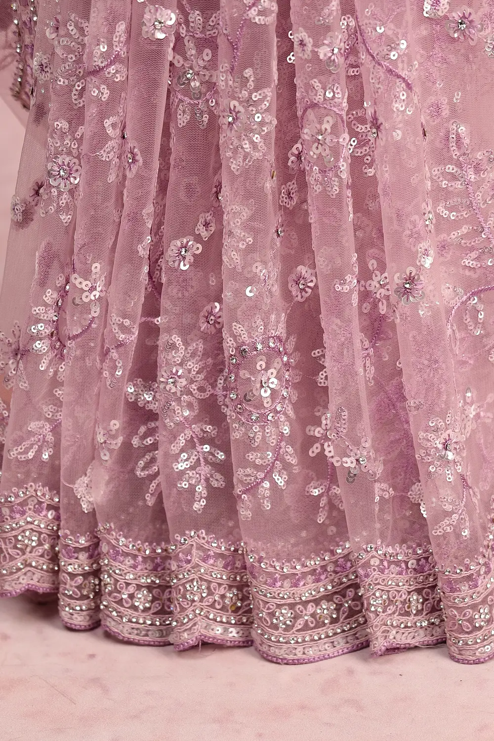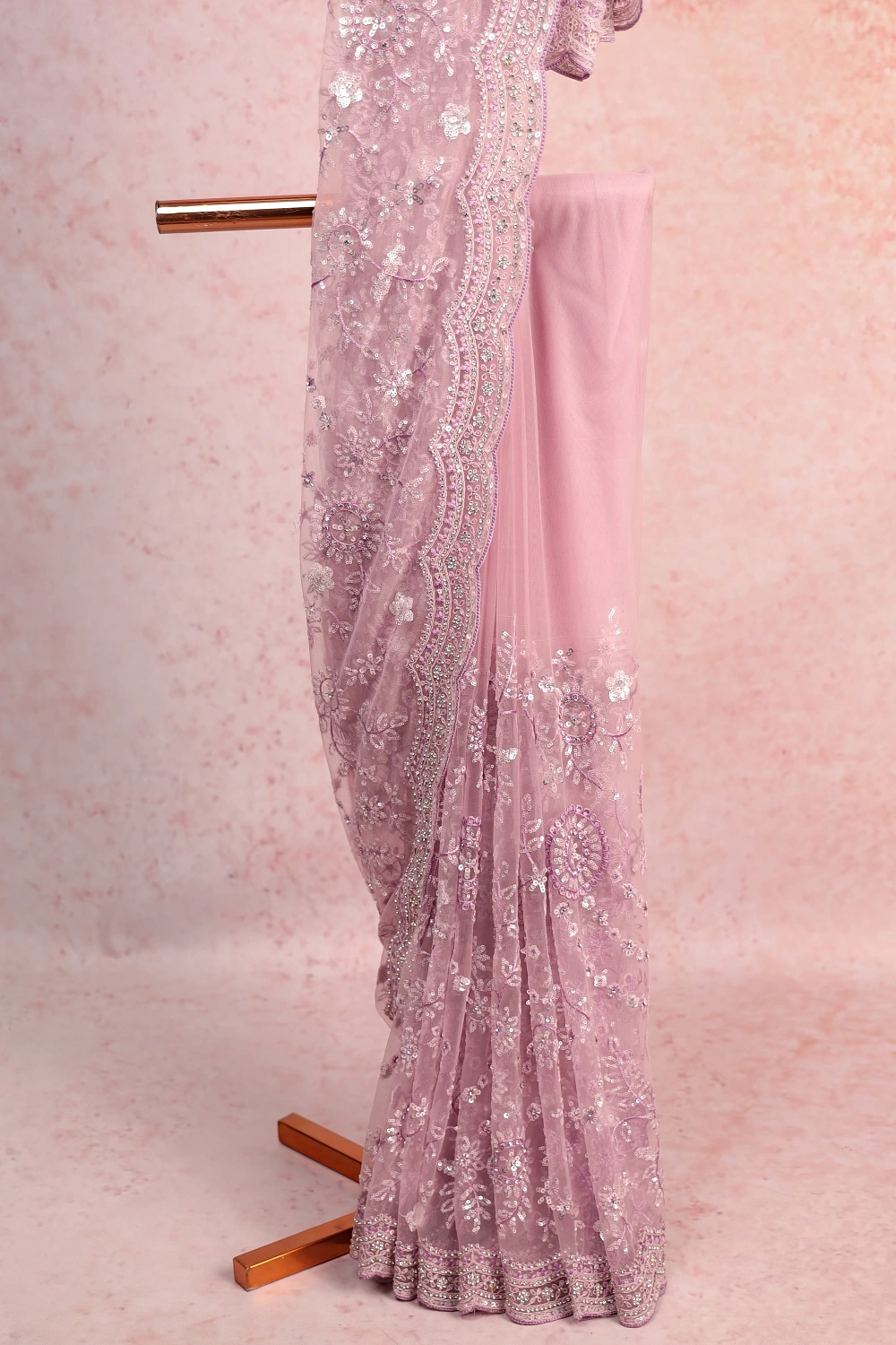 Lavender Net Saree Sequines Work with Scalap Border. Includes Un stitched Blouse