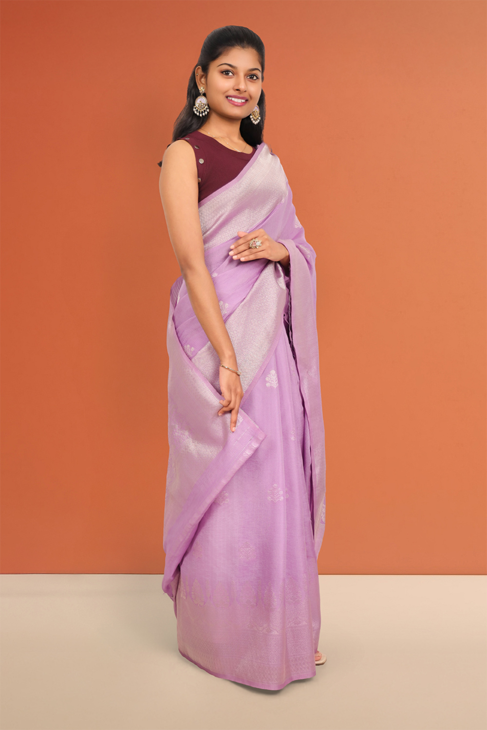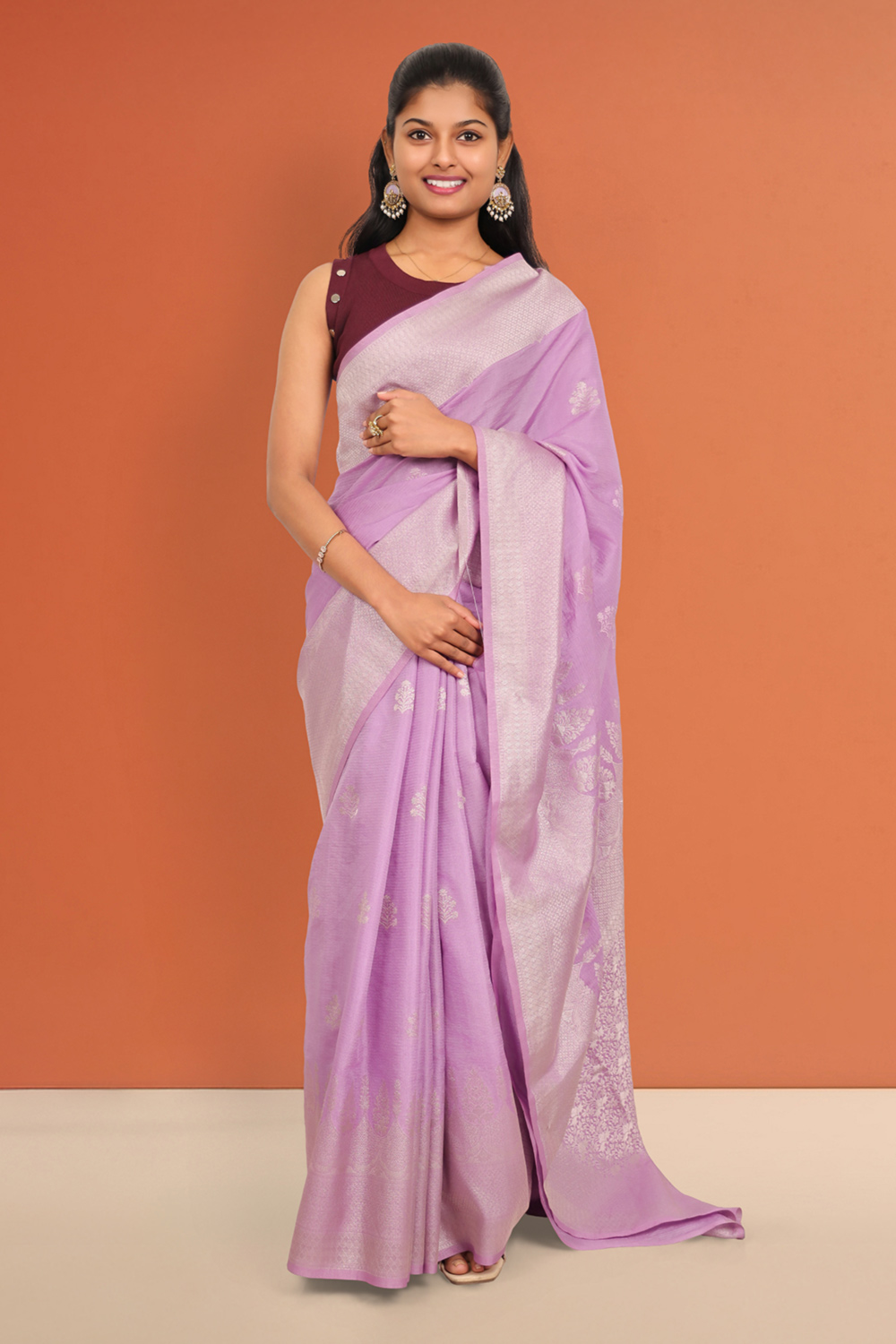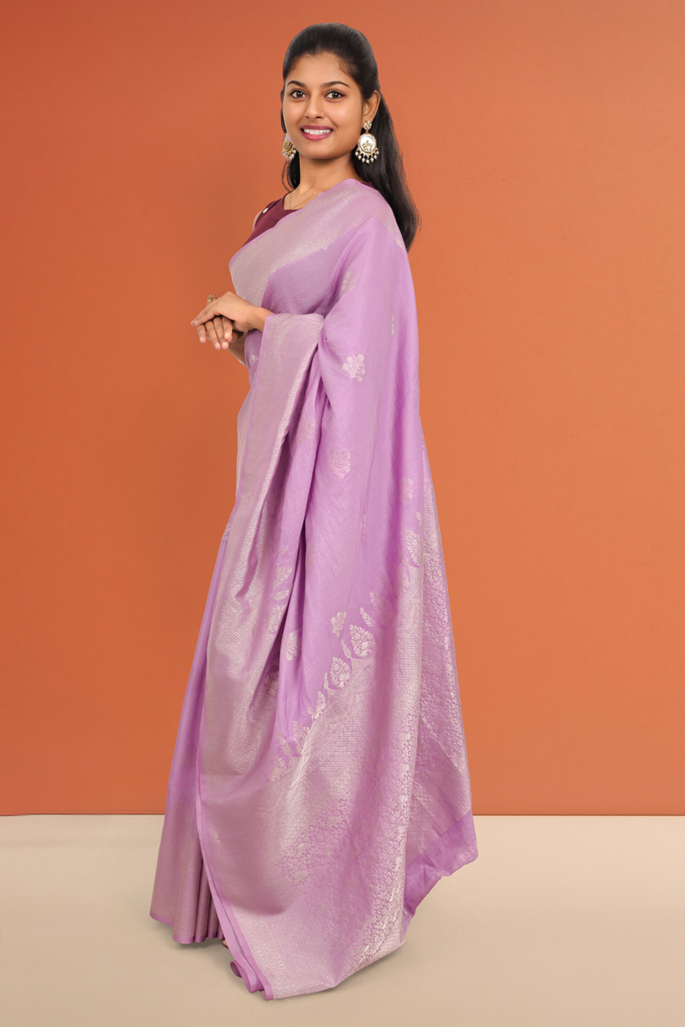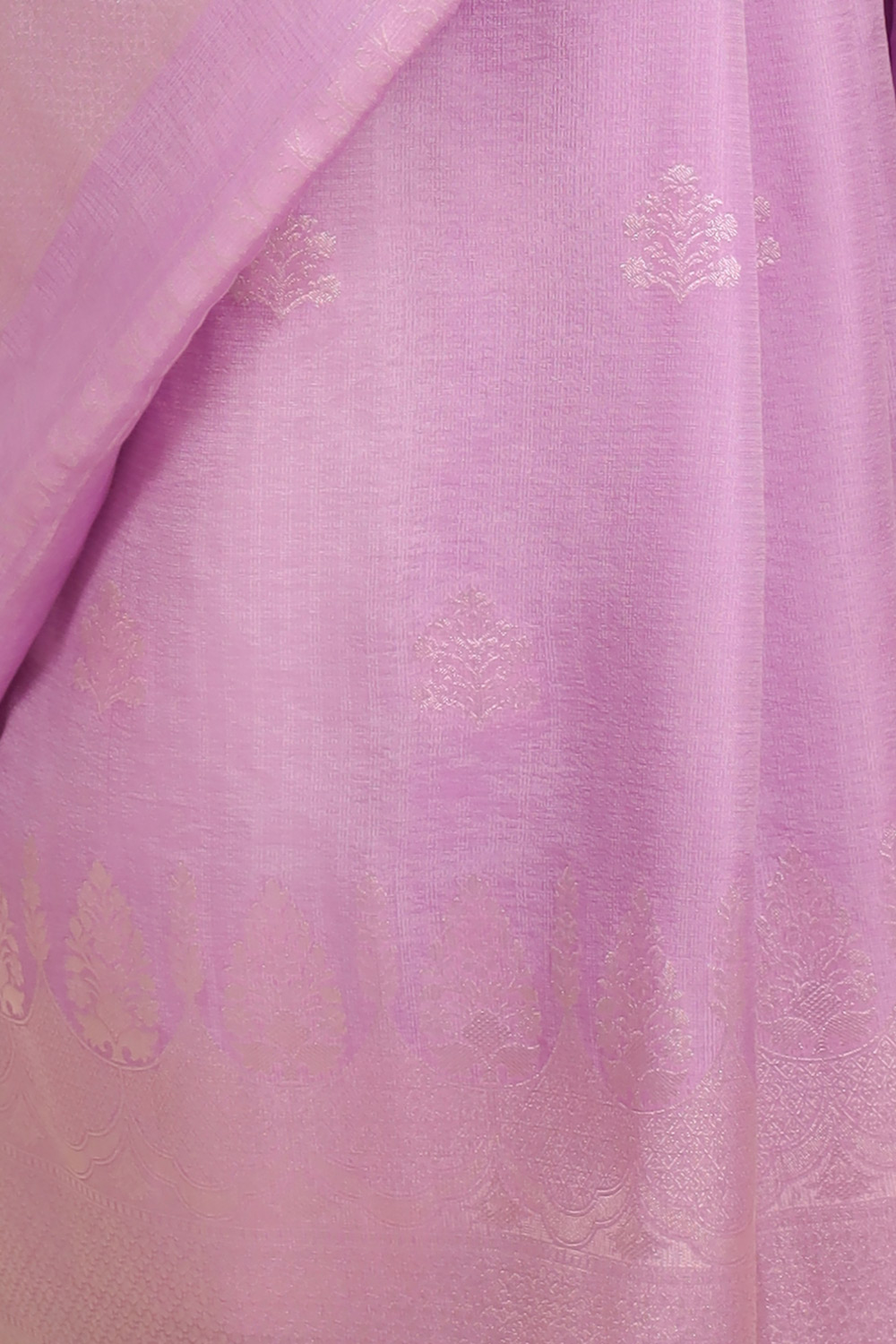 Lavender Semi Banarasi Butta Saree with Designer border. Includes unstitched Blouse