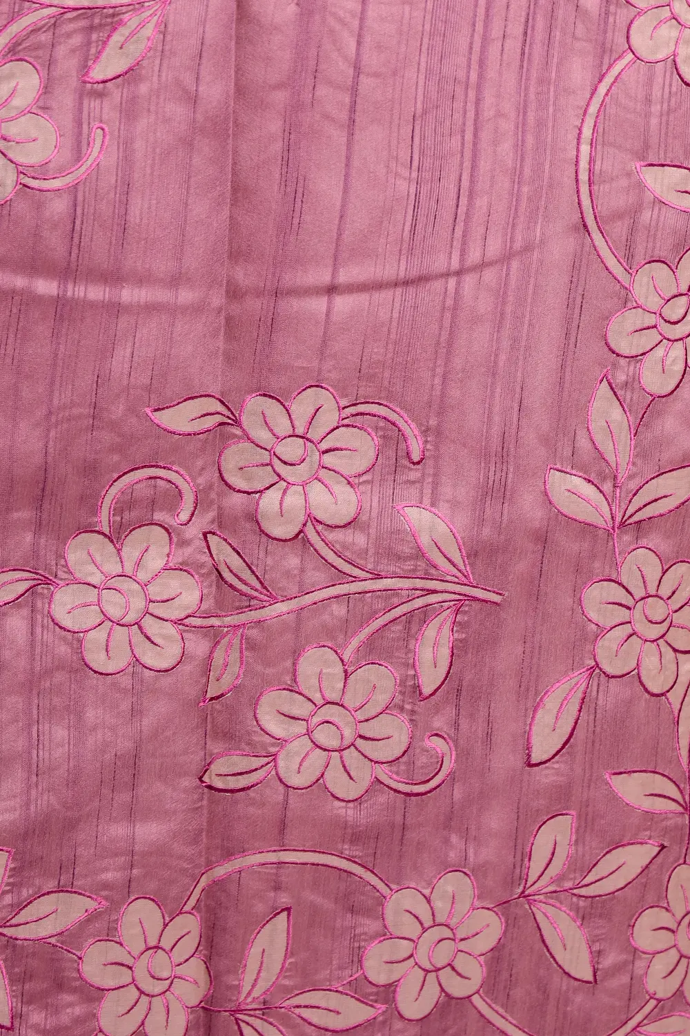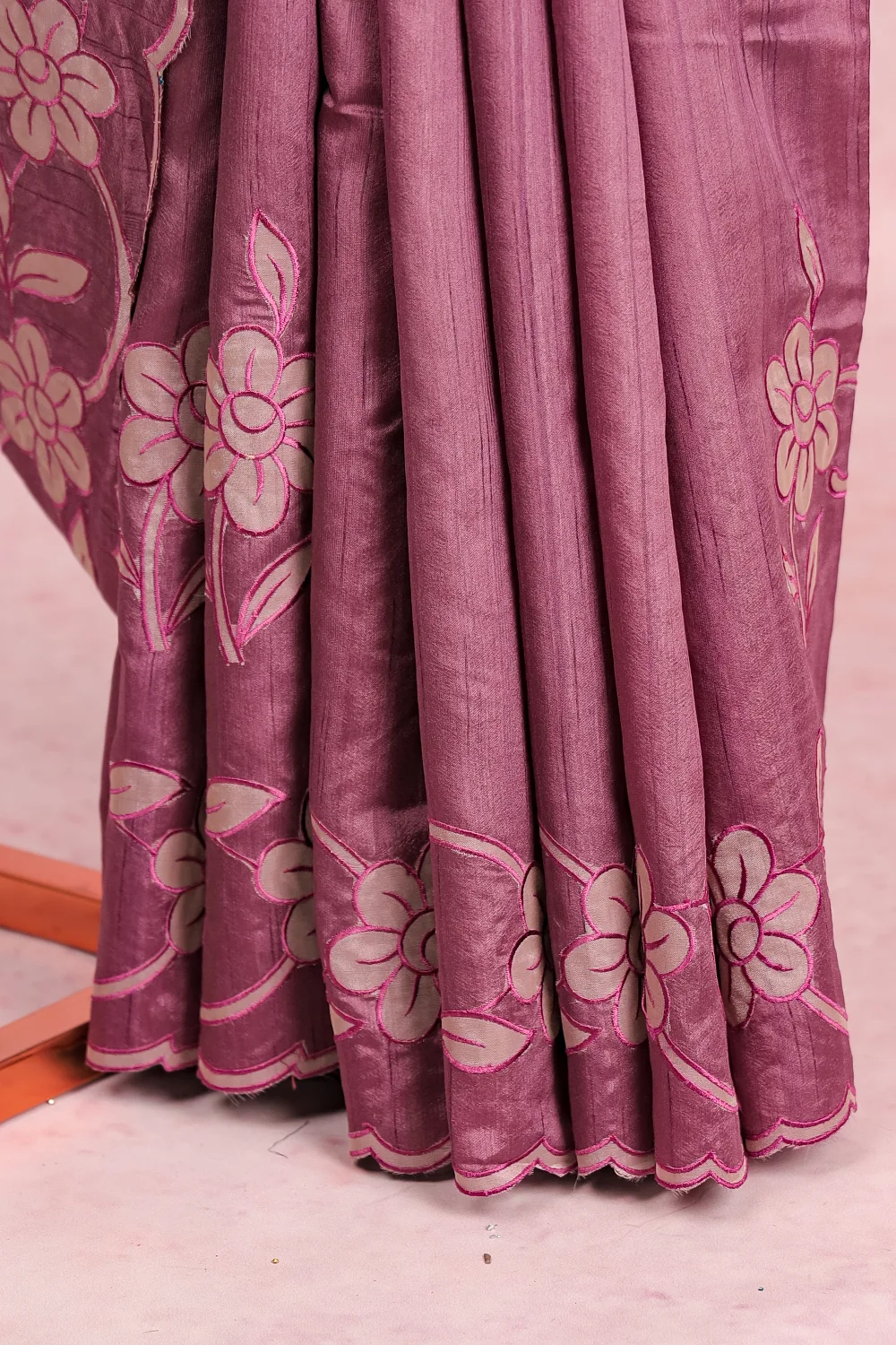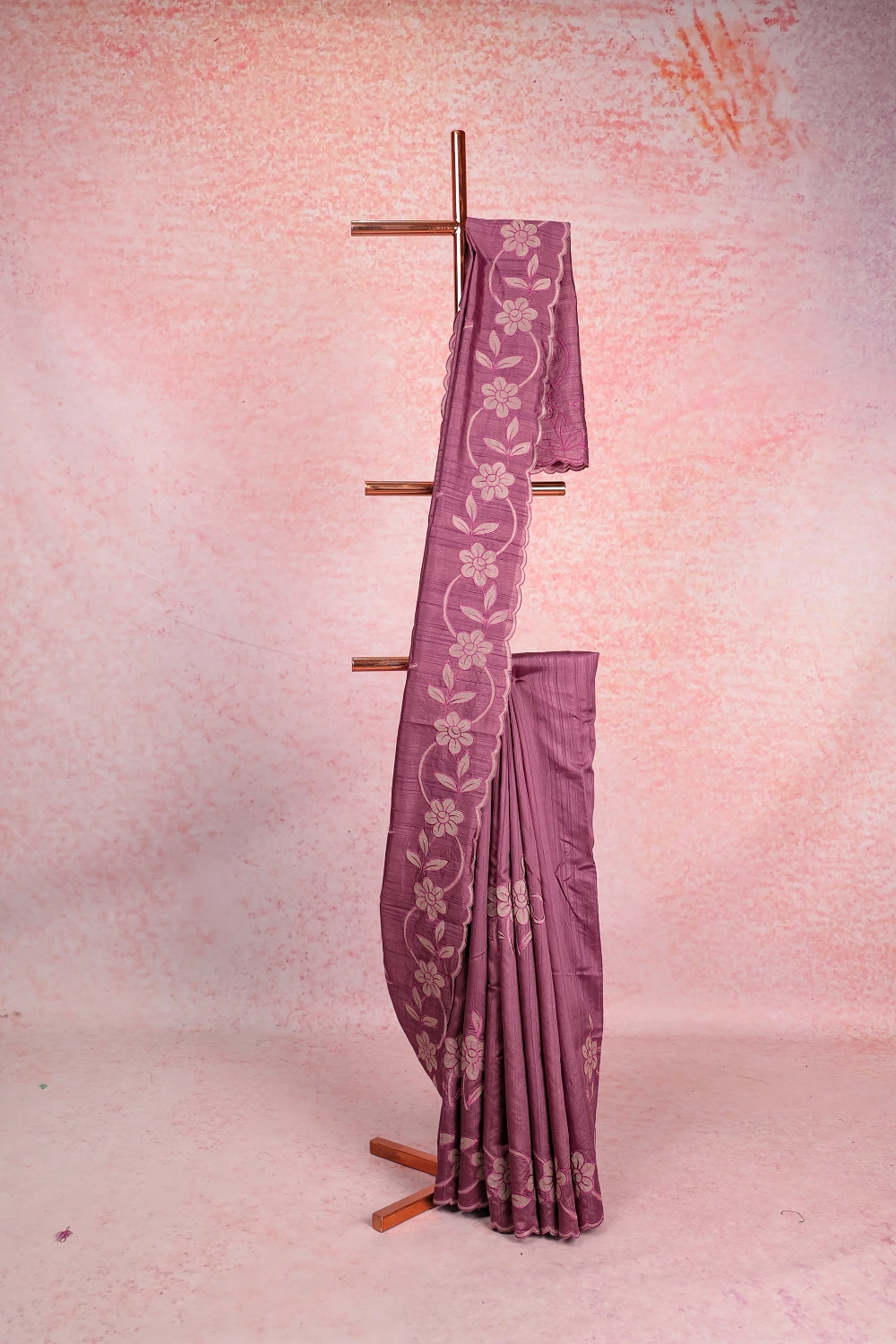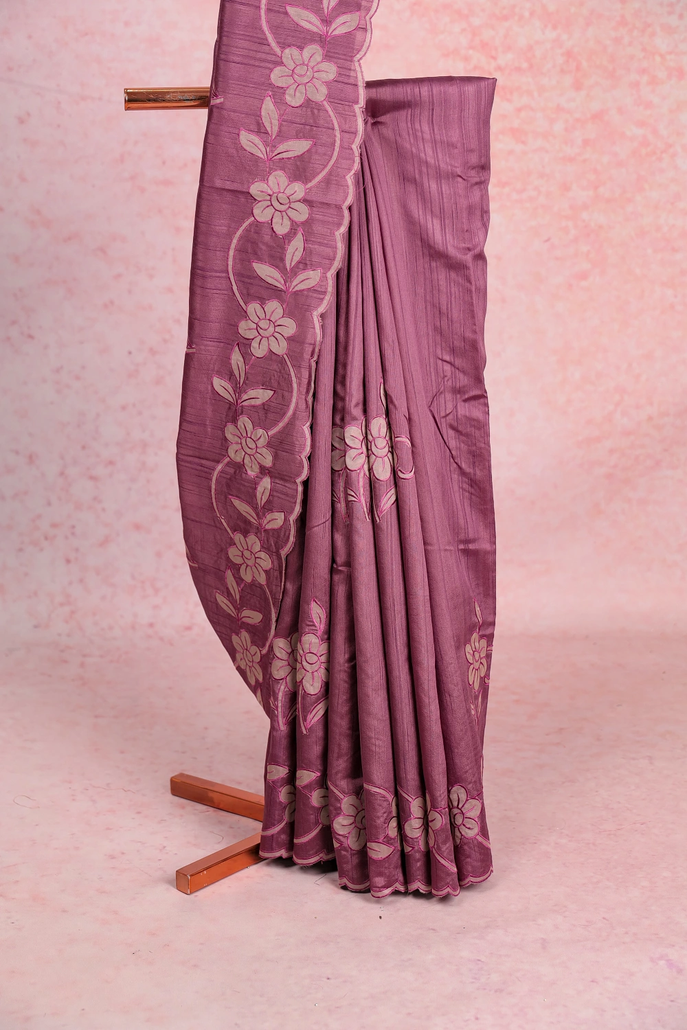 Lavender Semi Tussar Floral Design Saree With Scallop Border. Includes Unstitched Blouse