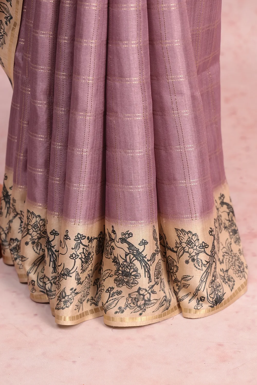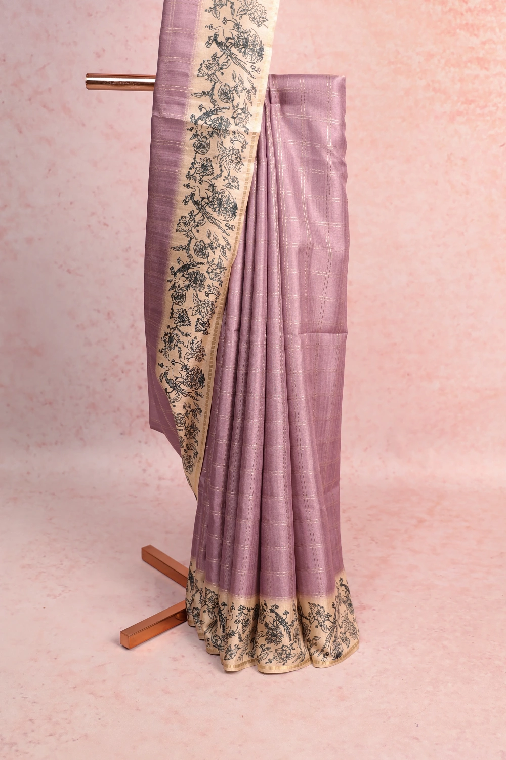 Lavender Semi Tussar Check Saree with Printed Border. Includes Unstitched Blouse