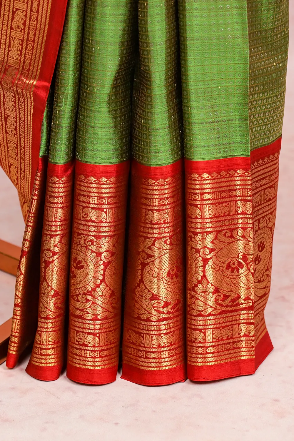 Leaf Green Kancheepuram Checks With Butta Saree with Traditional Zari Border Border. Includes Unstitched Blouse