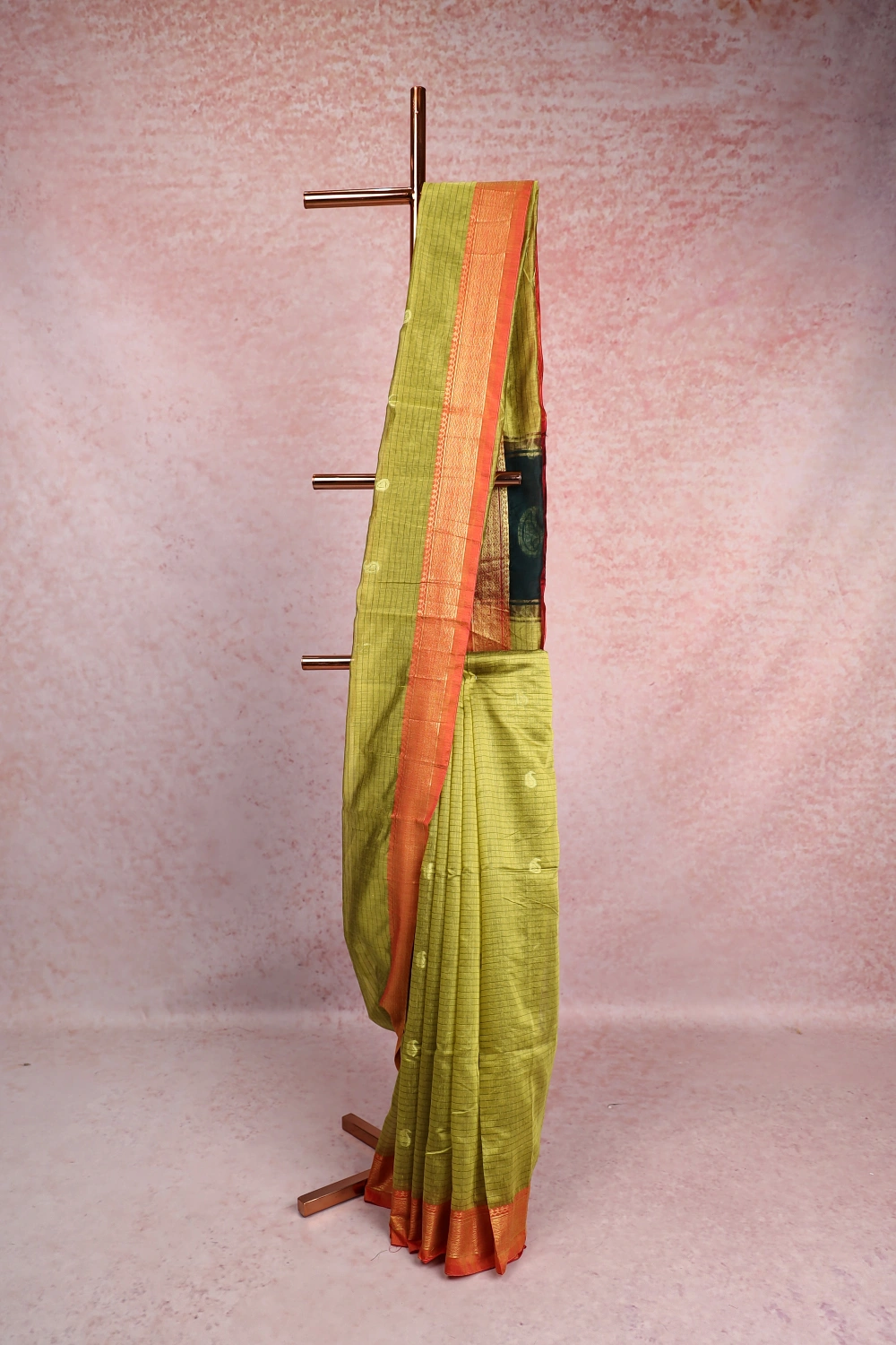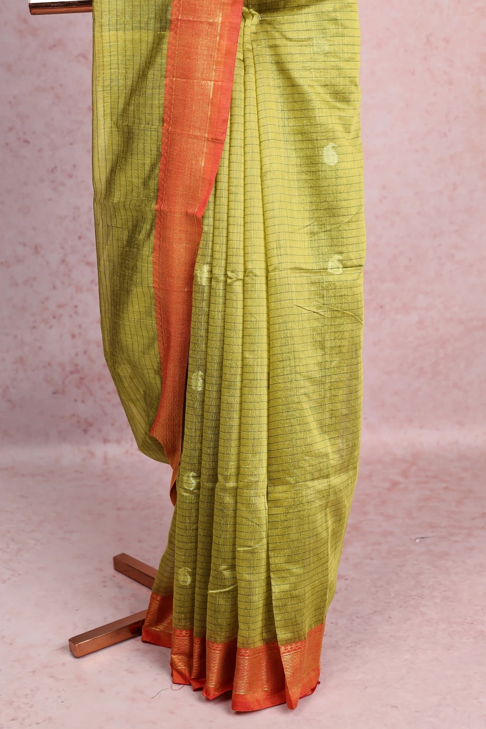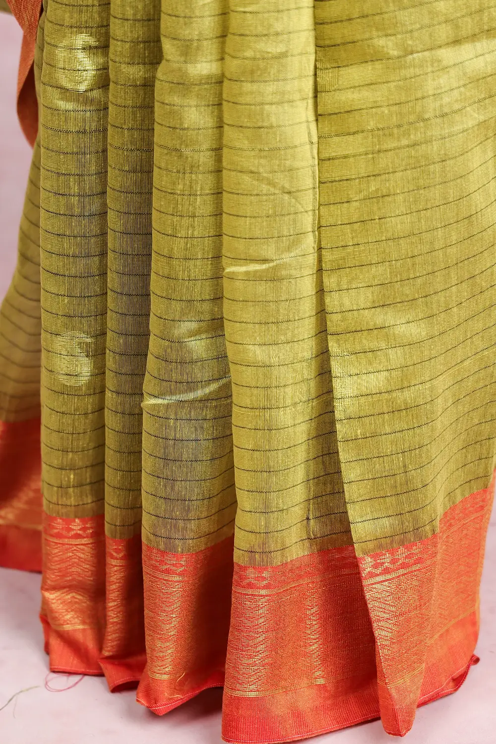 Lemon Green Cotton Silk Lines Saree With Designer Border. Includes Un Stitched Blouse