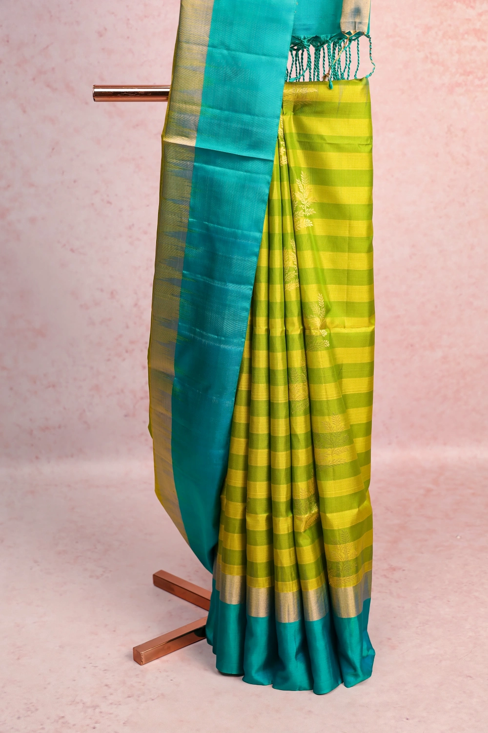 Lemon Yellow Kanchi Soft Silk Leaf Butta Saree with Plain Border. Includes Un stitched Blouse