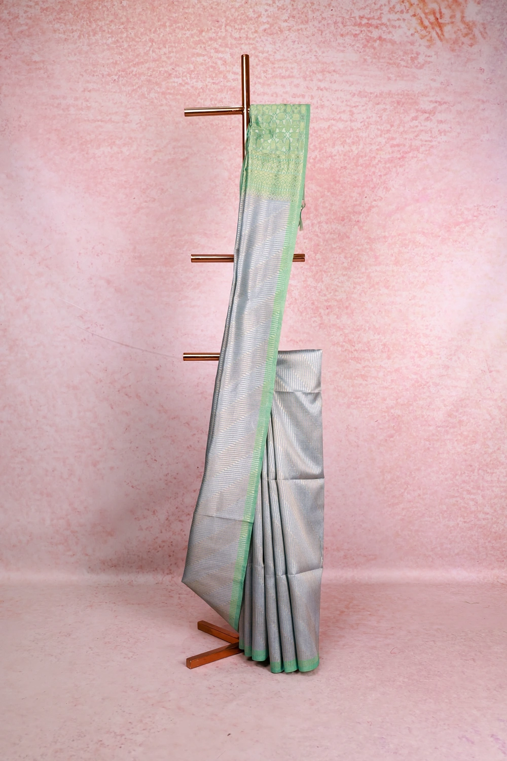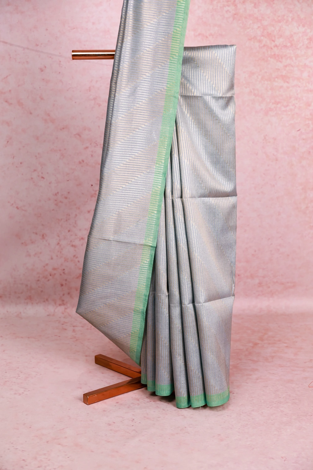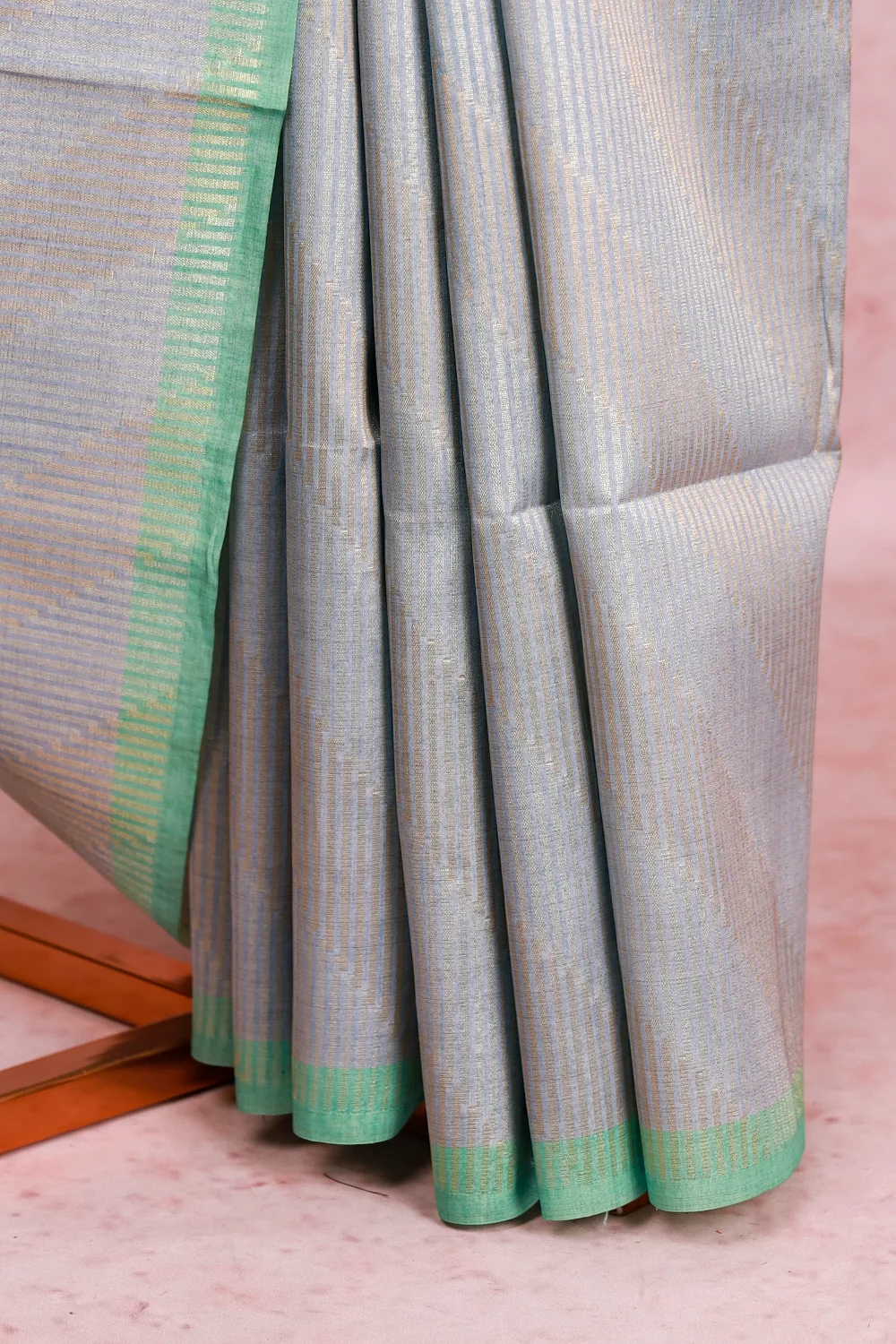 Light Ash Semi Tussar Line Design Saree With Small Border. Includes Un Stitched Blouse