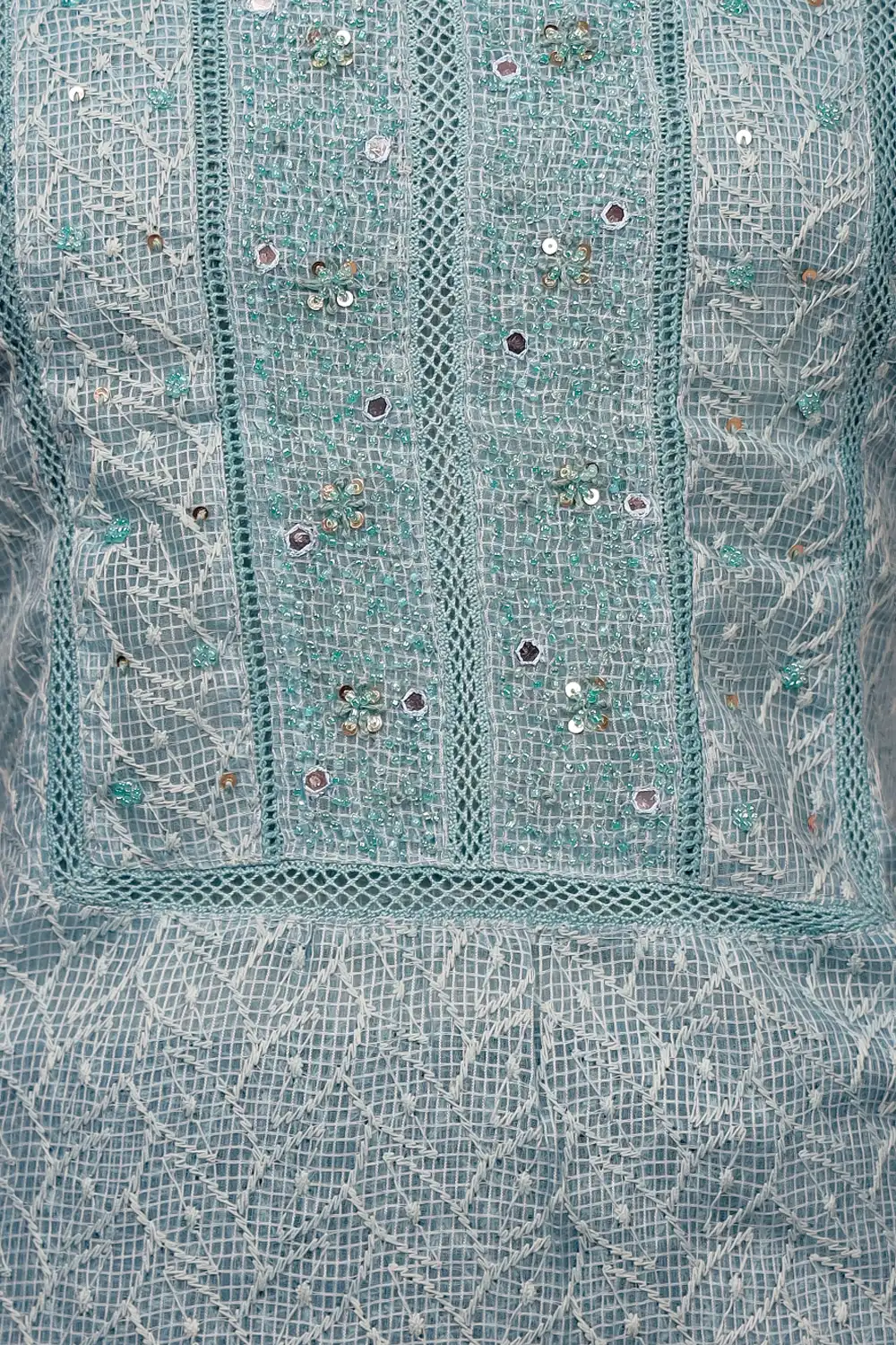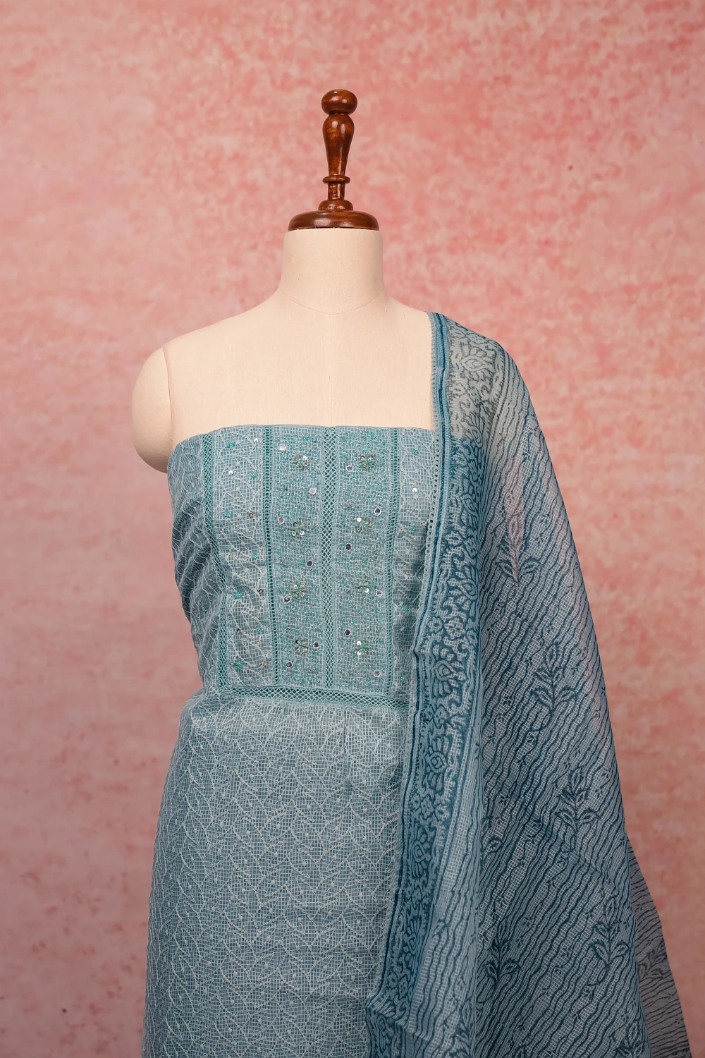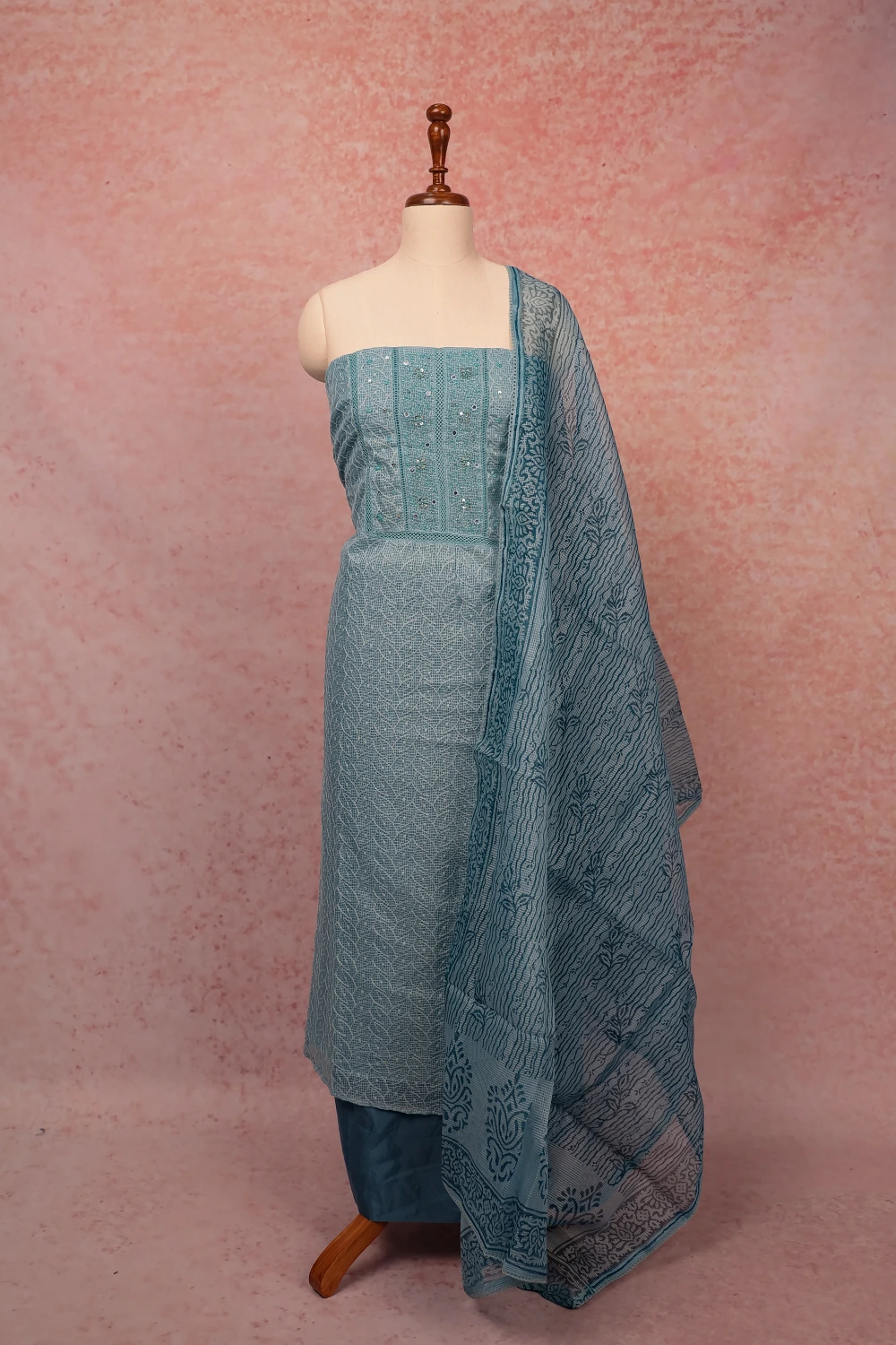 Light Blue Kota Embroidery Unstitched Churidar Material. Includes Dupatta.