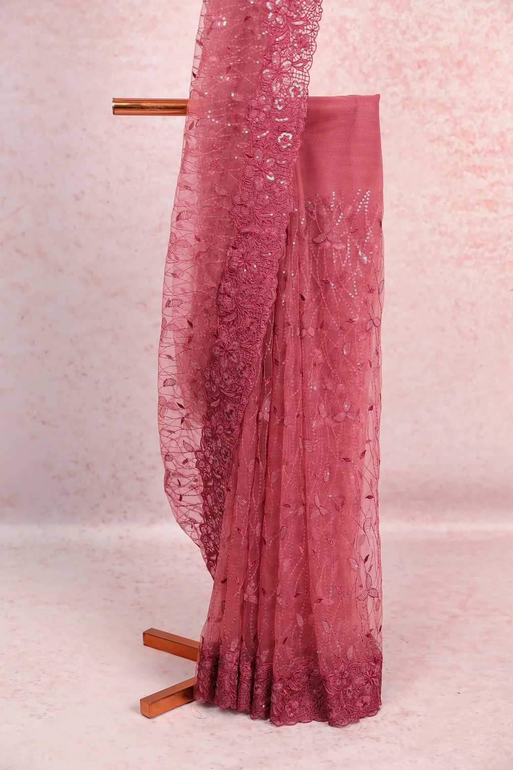 Ligh Brown Net Thread And Sequines Work Saree with Scallop Border. Includes Unstitched Blouse