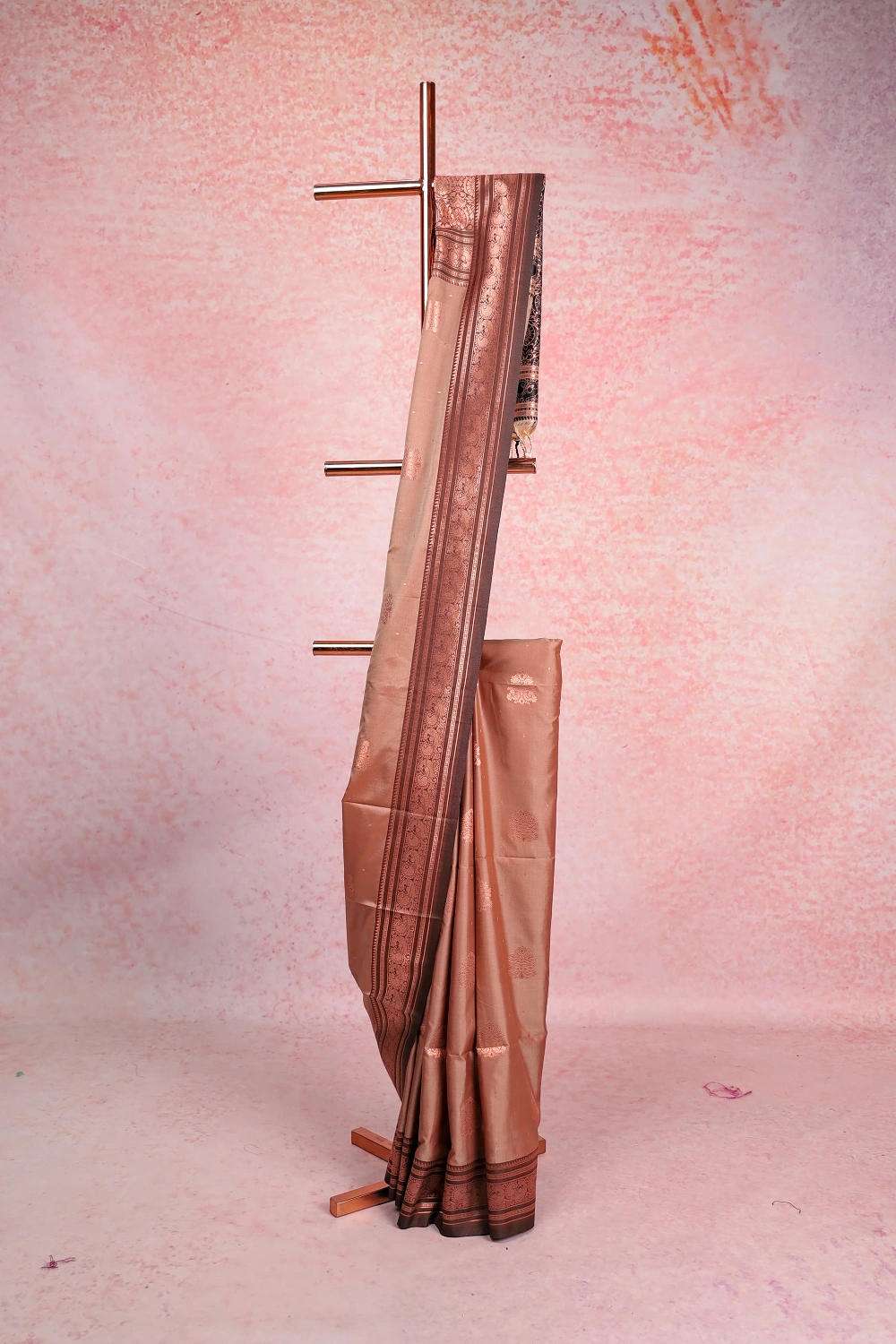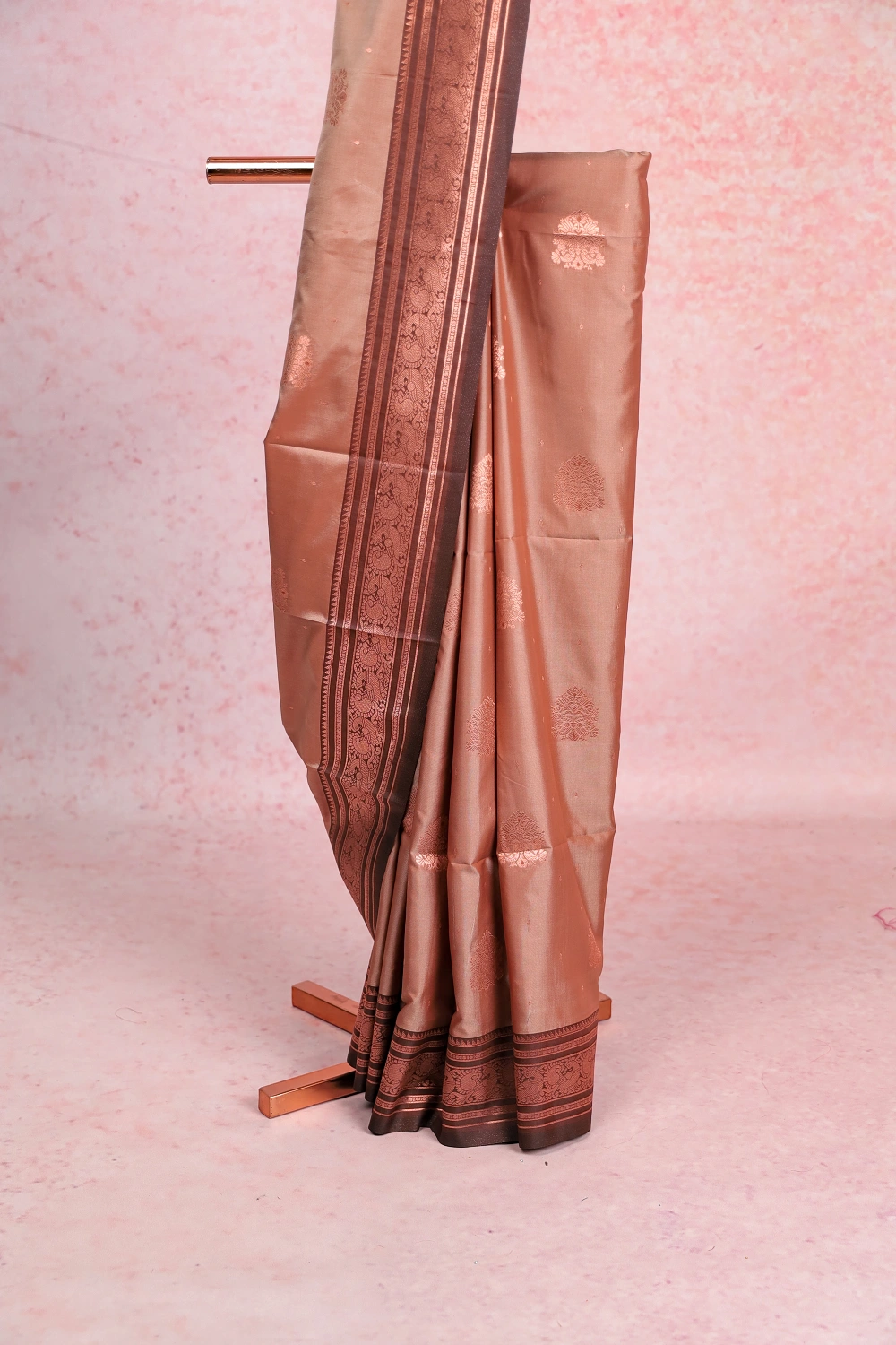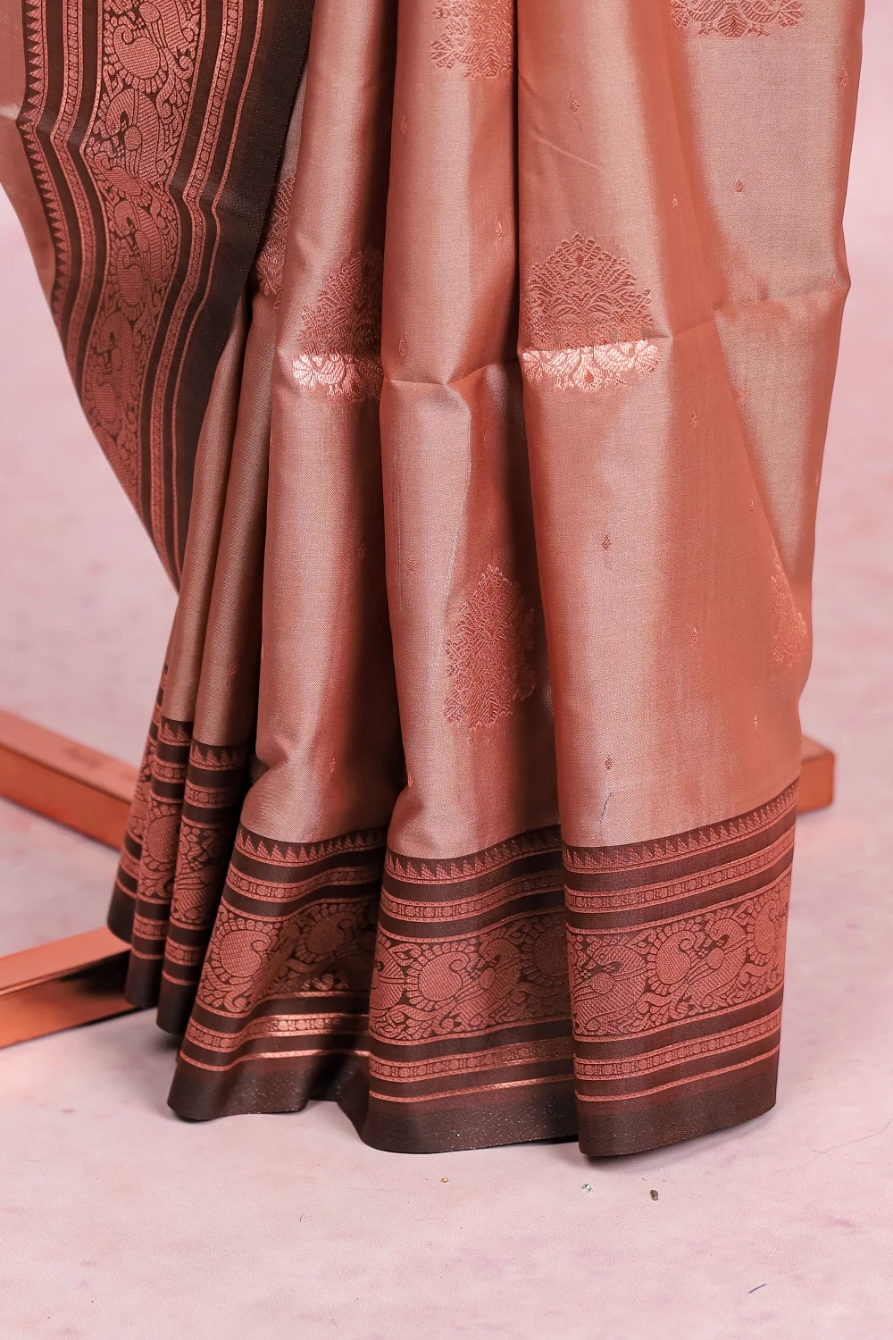 Light Brown Semi Silk Zari Design Saree With Copper Border. Includes Unstitched Blouse
