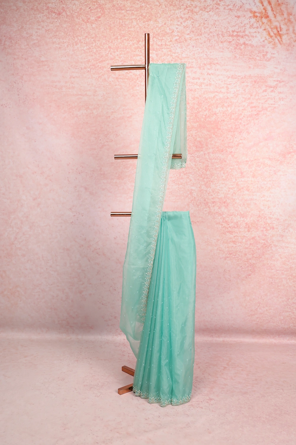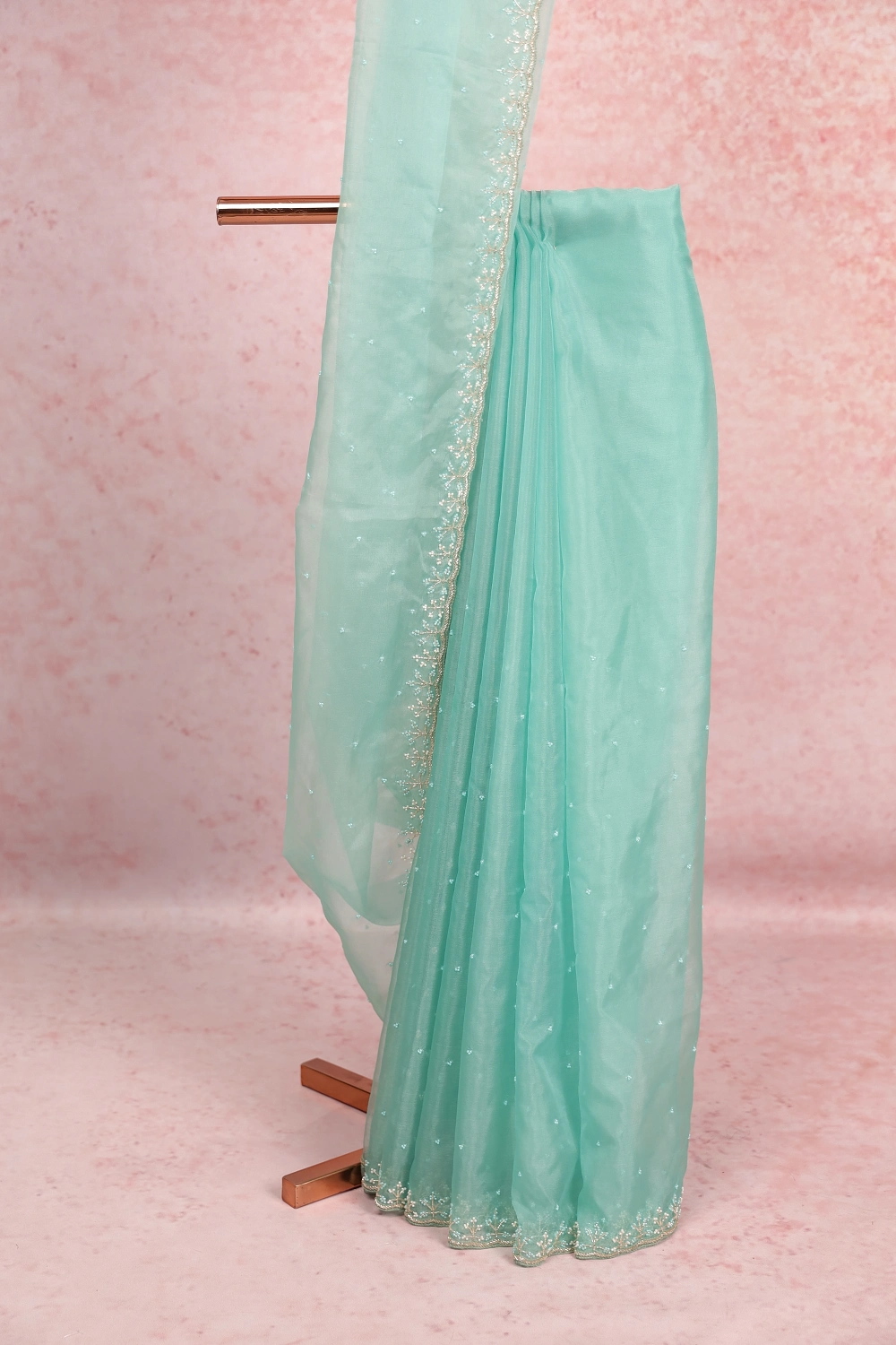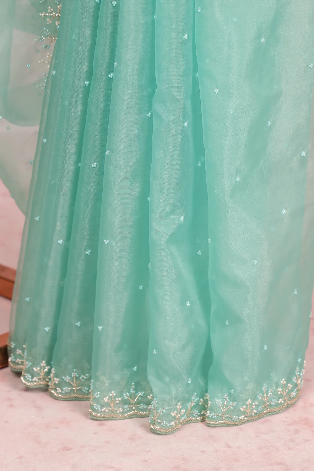 Light Green Organza Beads Work Saree With Scallop Border. Includes Un Stitched Blouse