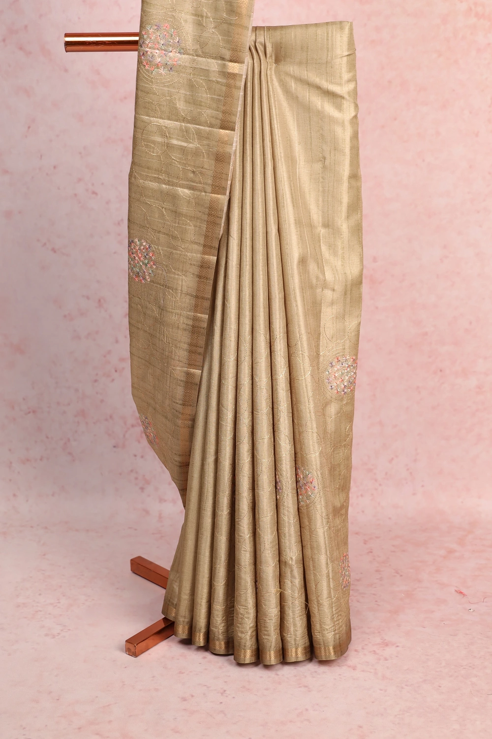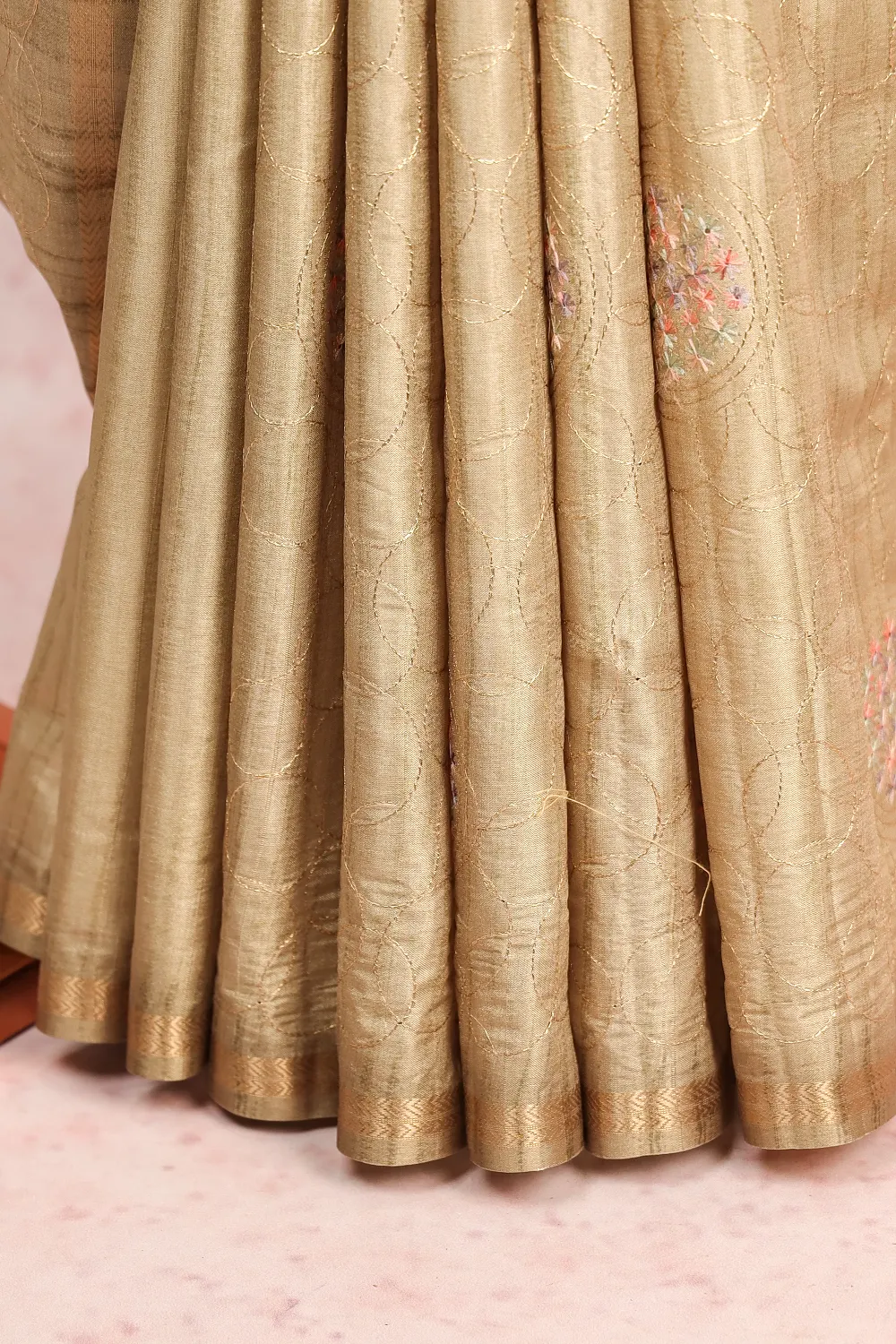 Light Green Semi Tussar Embroidery Saree with Golden Border. Includes Un stitched Blouse