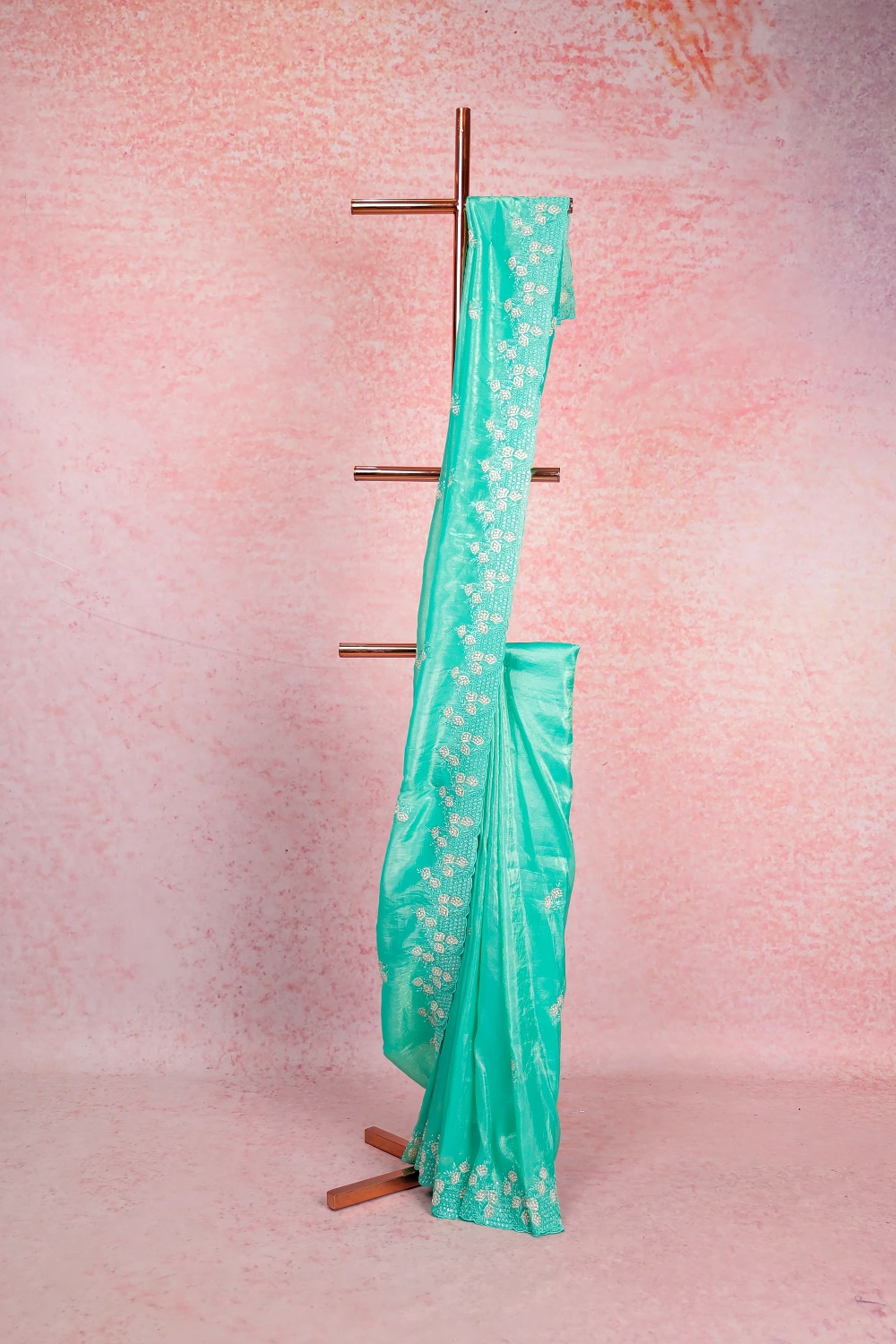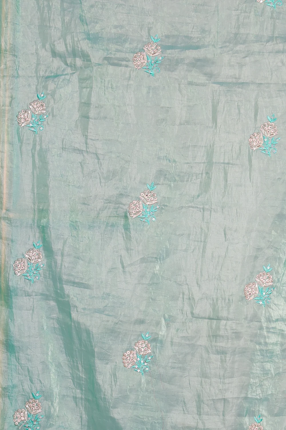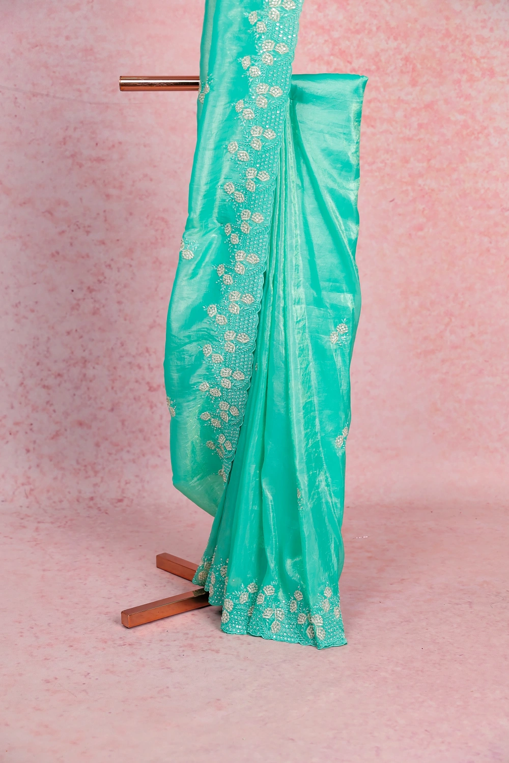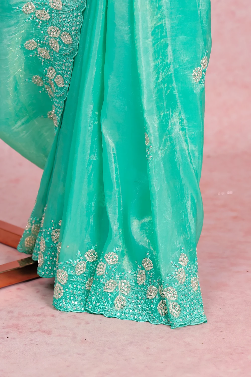 Light Green Tissue Organza Thread And Sequines Saree with Scallop Border. Includes Unstitched Blouse